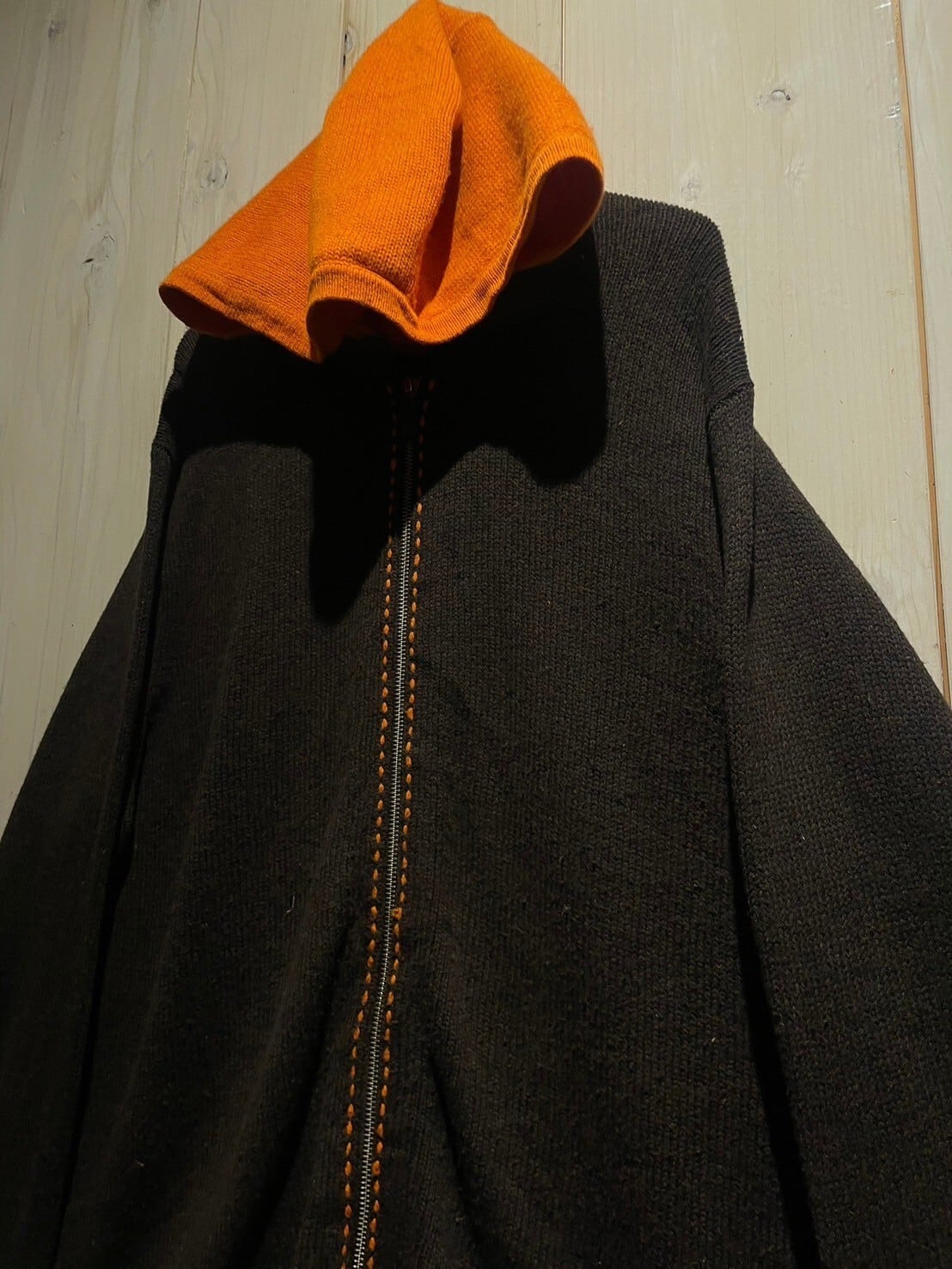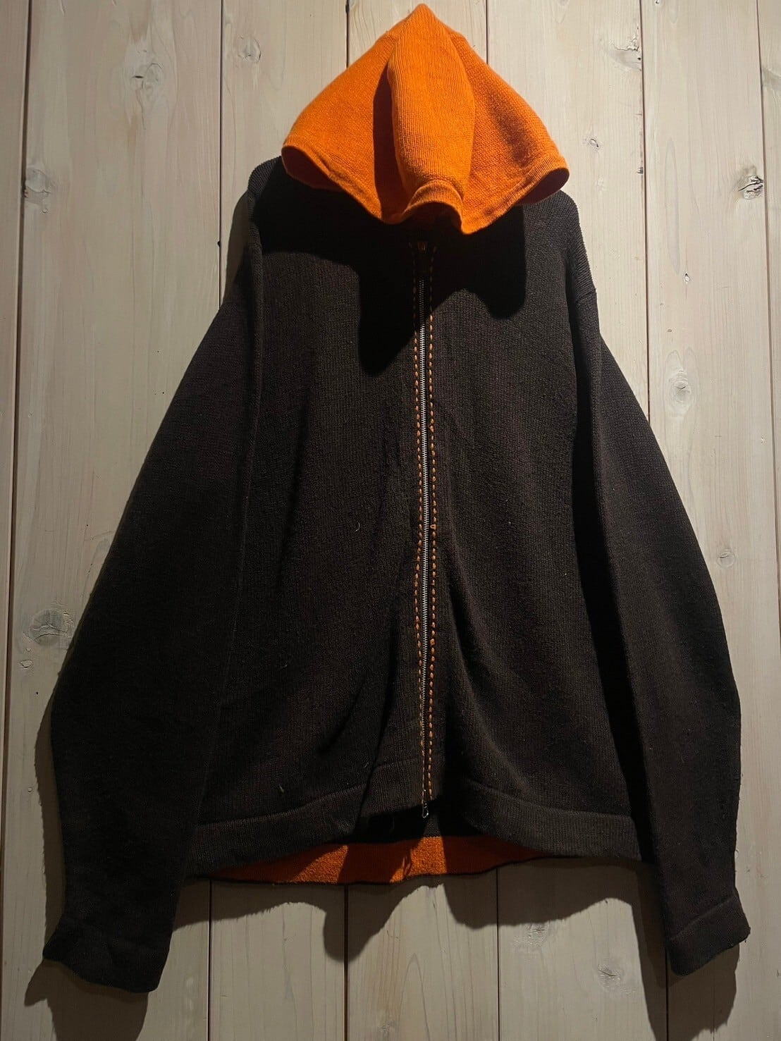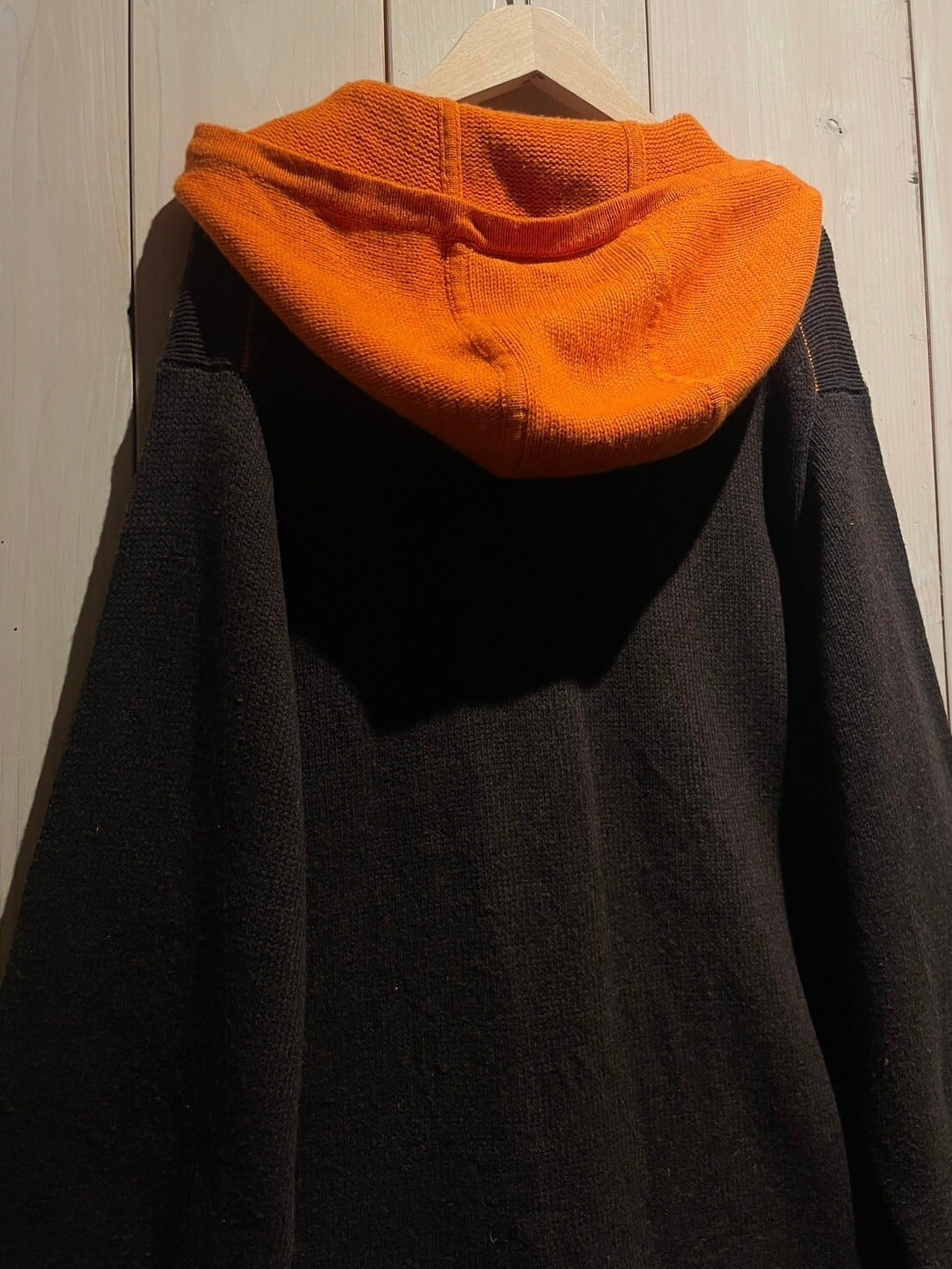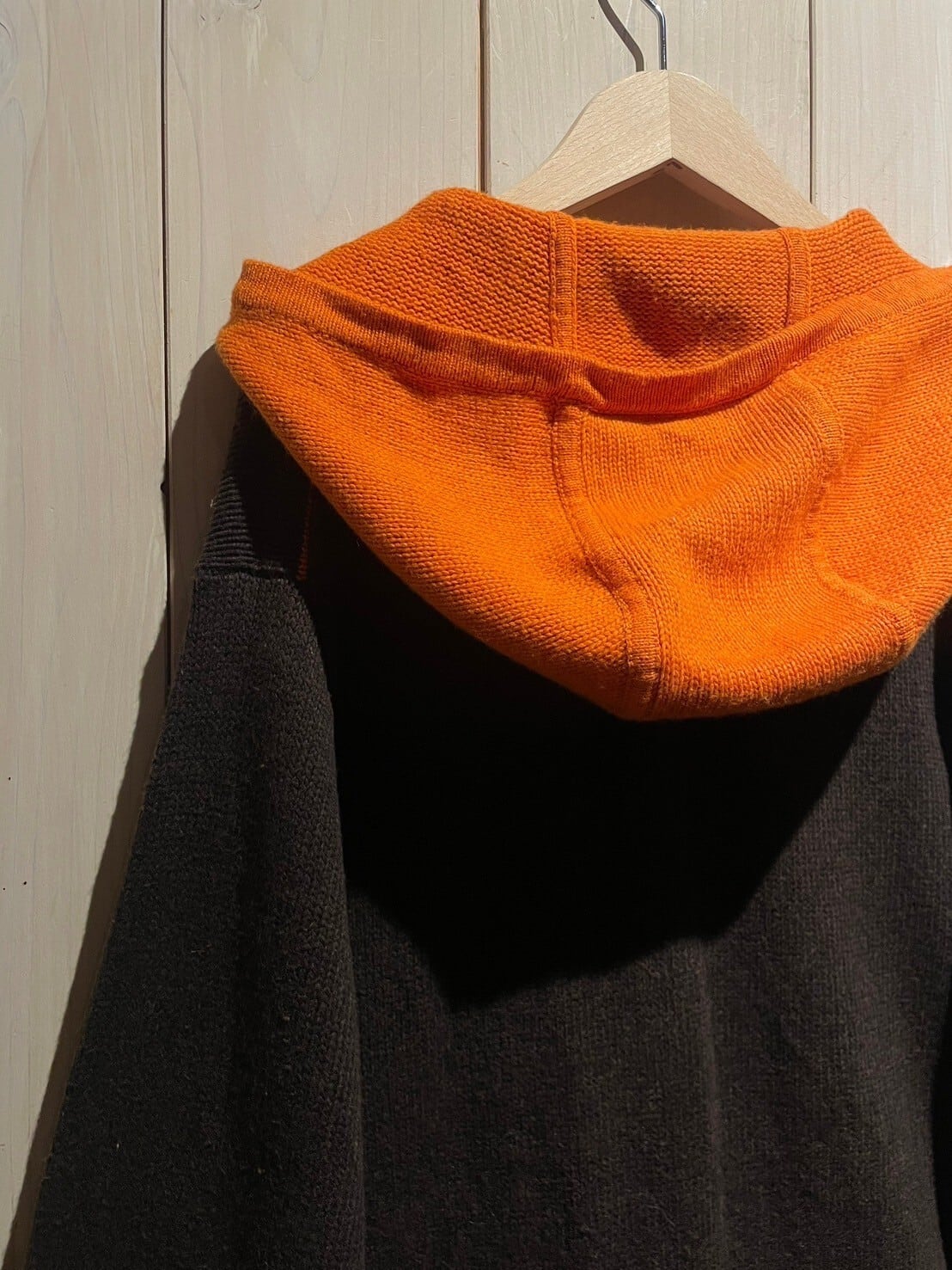 ブラウンのニットをベースに、オレンジのフード、ステッチ、リブを切り替えたニットフーディー。