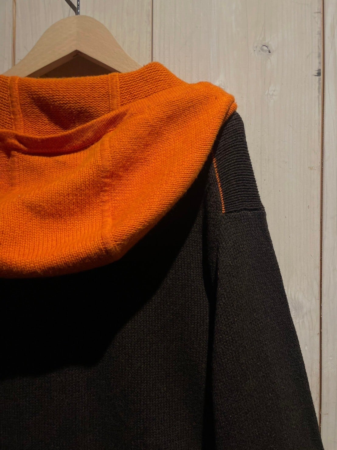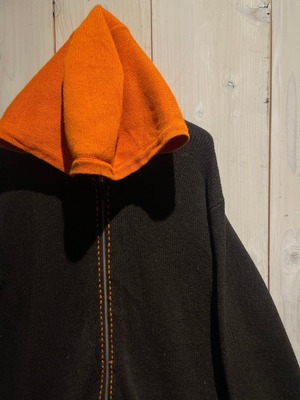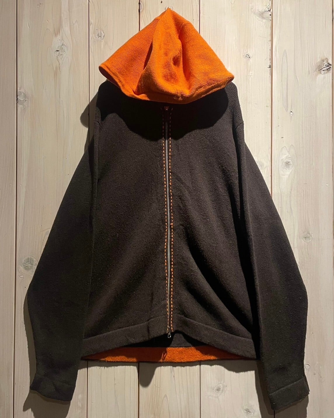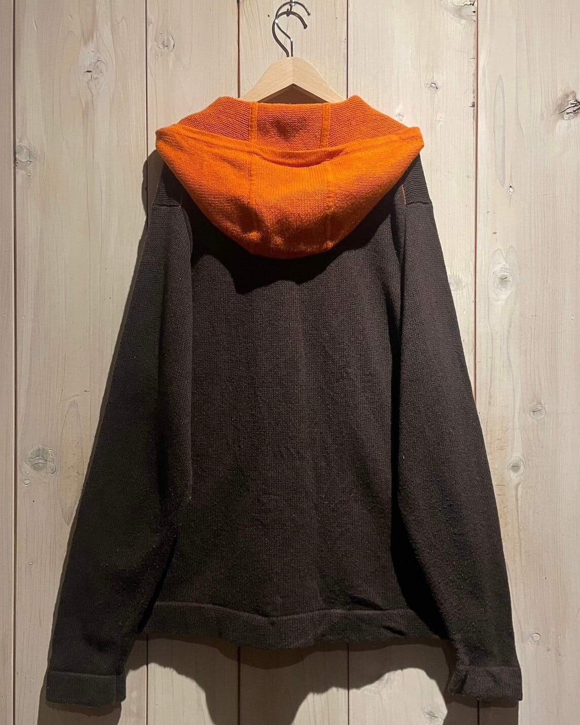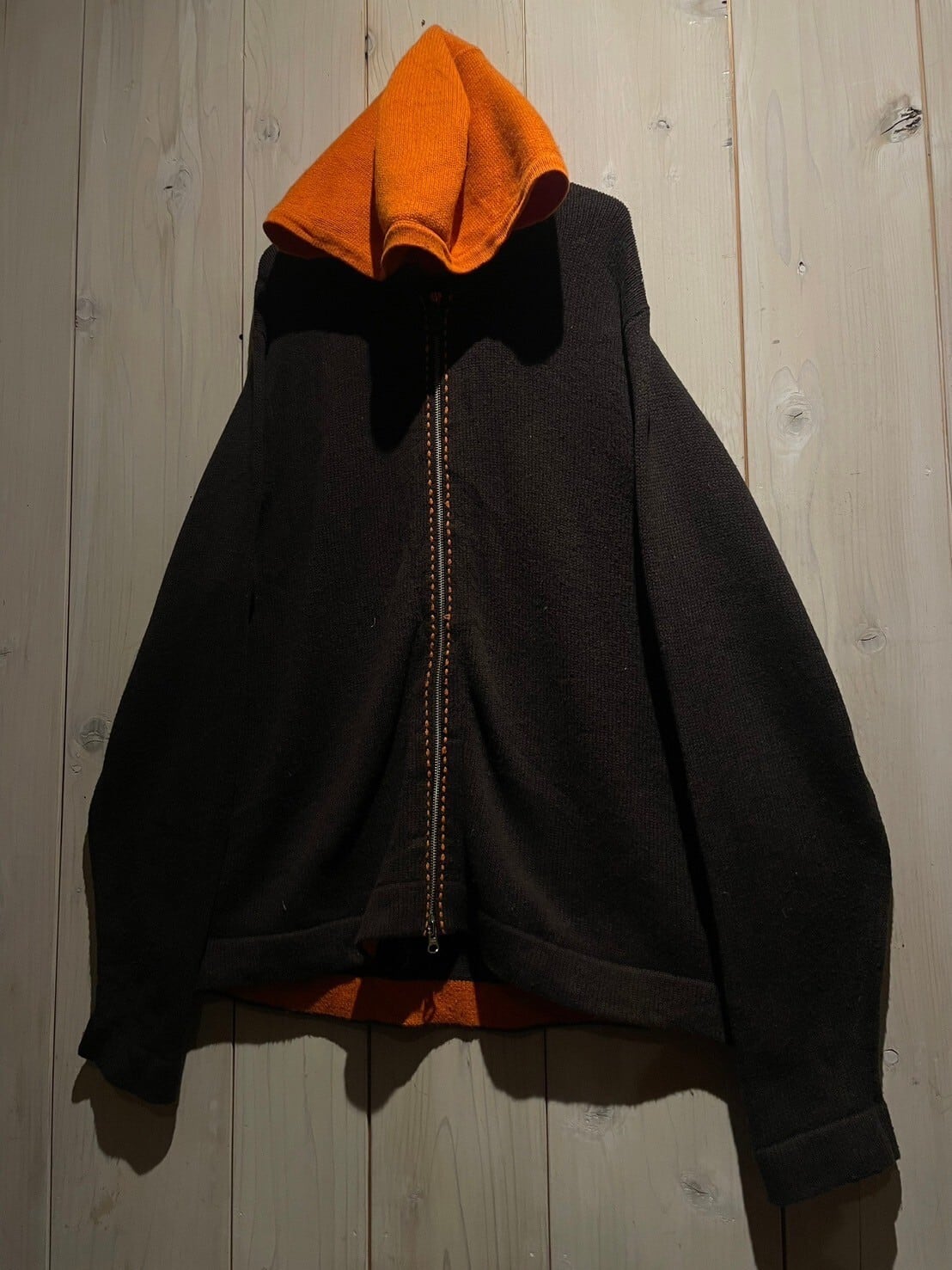 ブラウンのニットをベースに、オレンジのフード、ステッチ、リブを切り替えたニットフーディー。