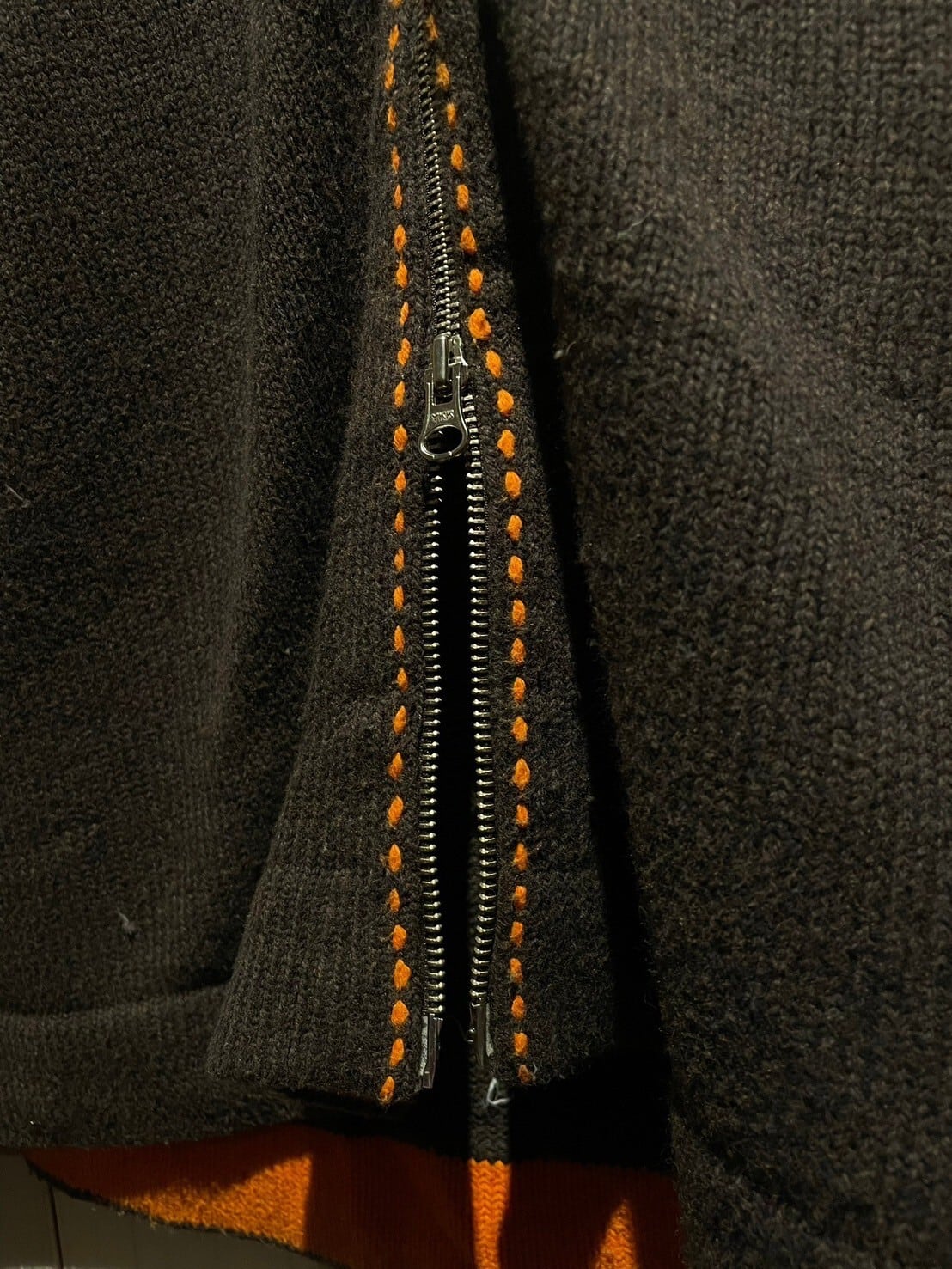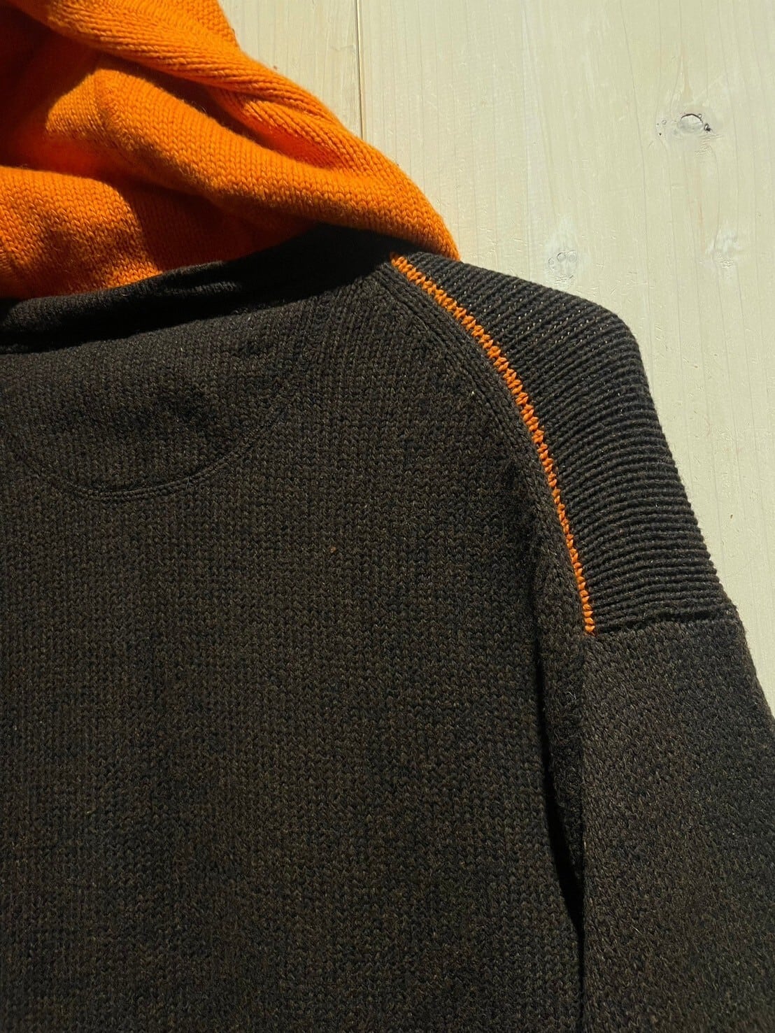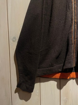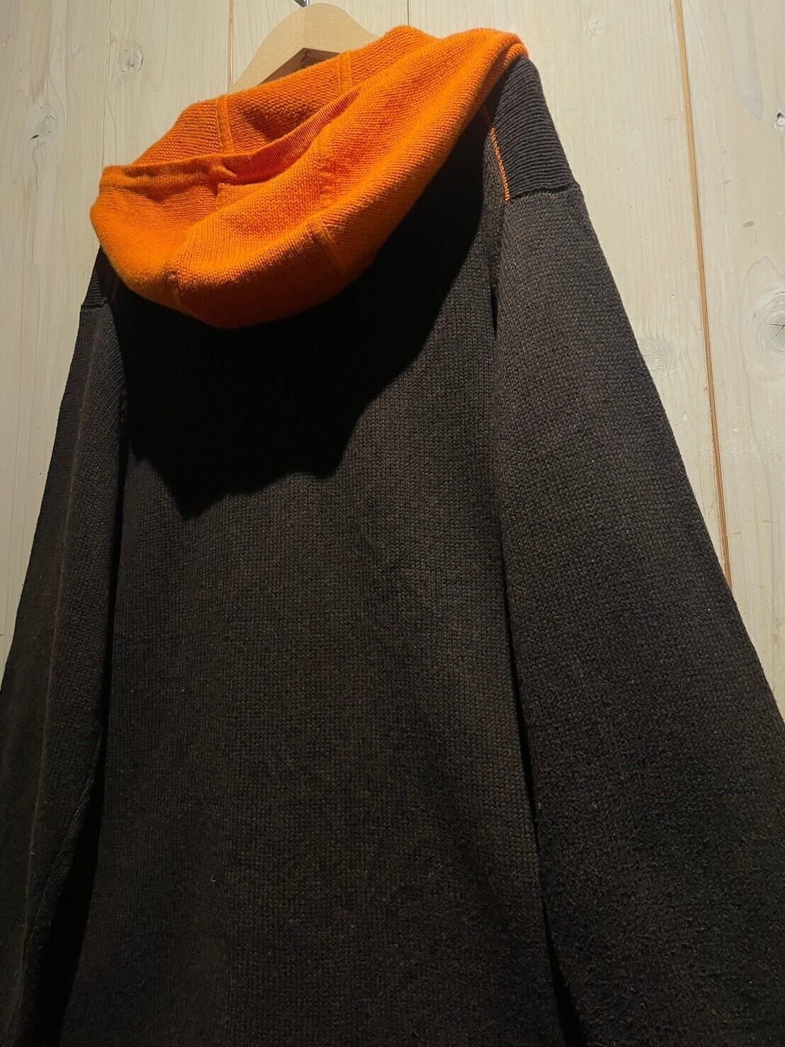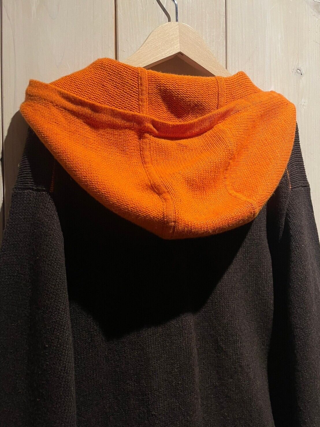ブラウンのニットをベースに、オレンジのフード、ステッチ、リブを切り替えたニットフーディー。