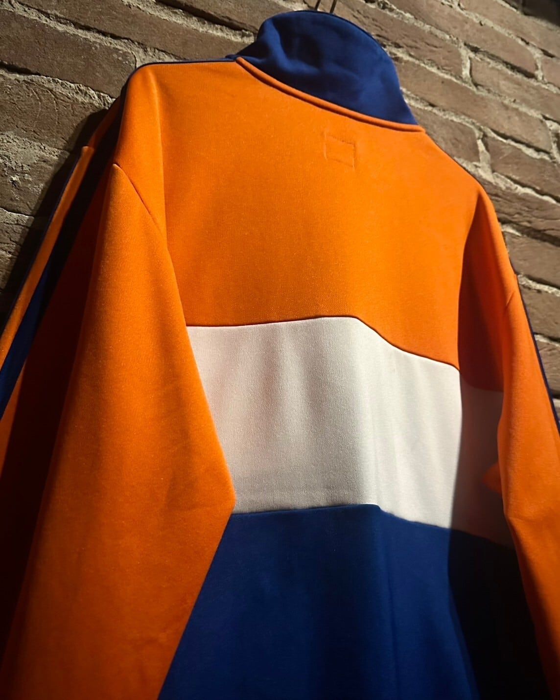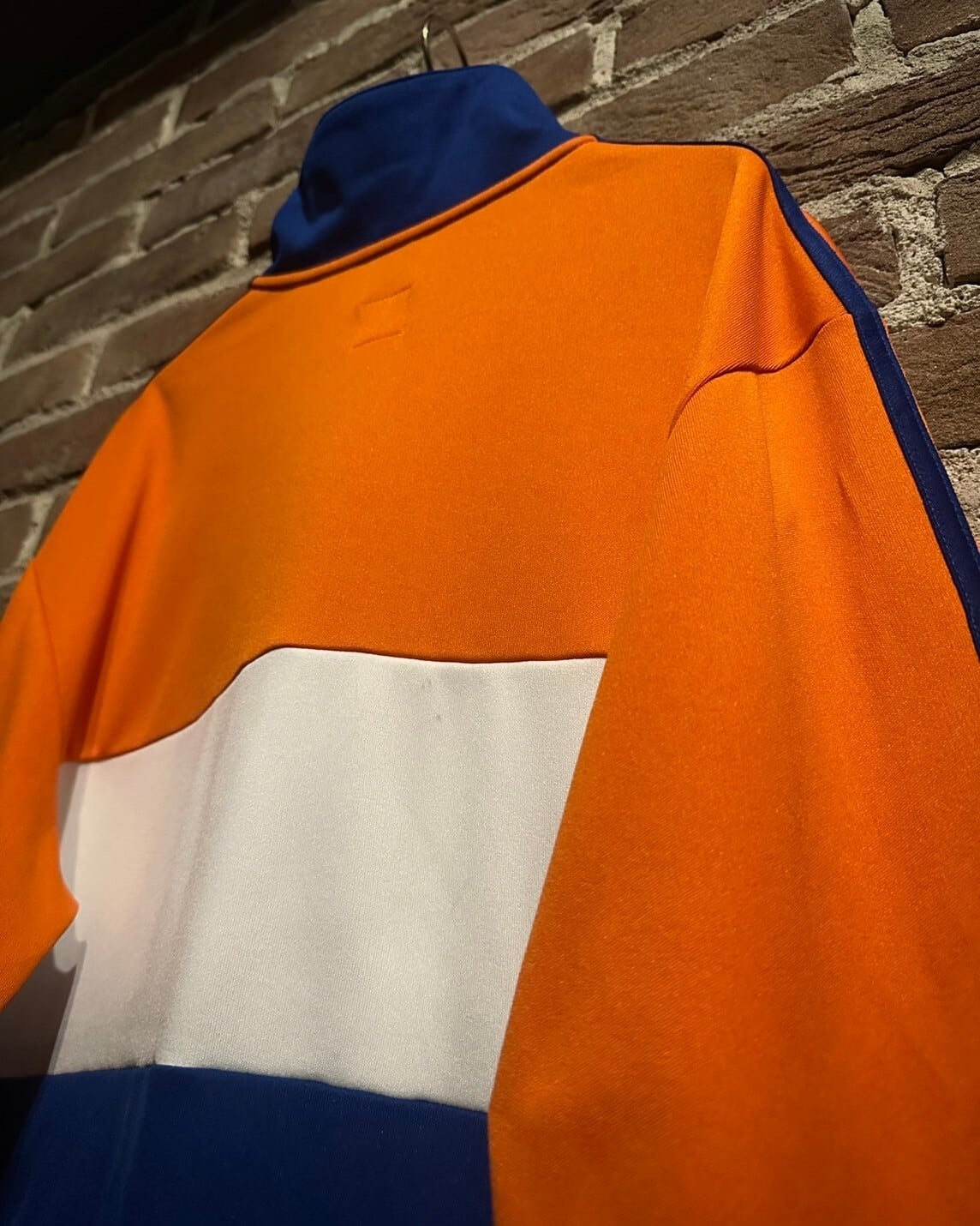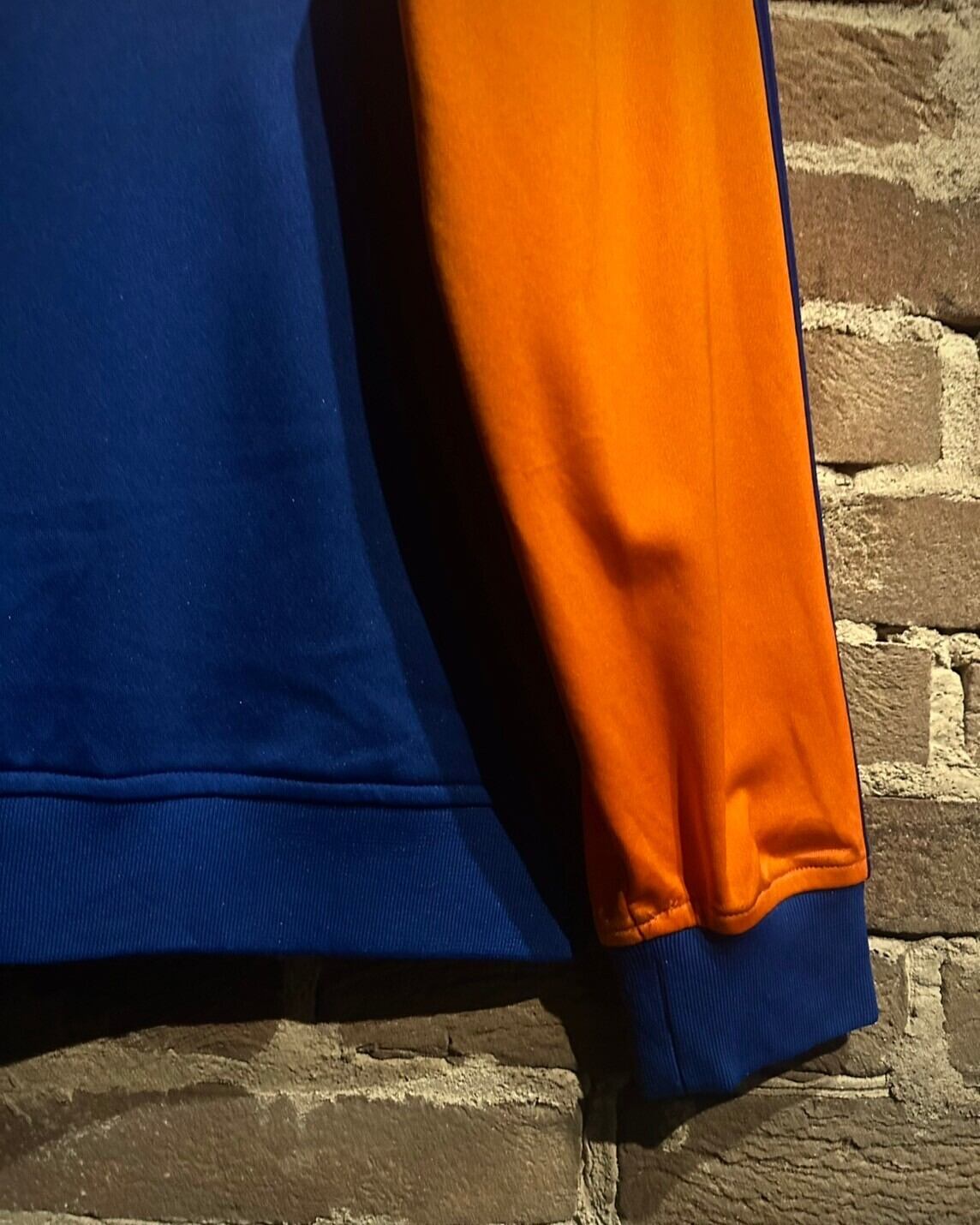 チームカラーであるオレンジ、白、青のカラーリングで切り替え。右胸にはトレフォイルロゴ、左胸にはチームネームを刺繍でON。パキッとしたカラーリングが春先のファッションの気分を高めてくれます。