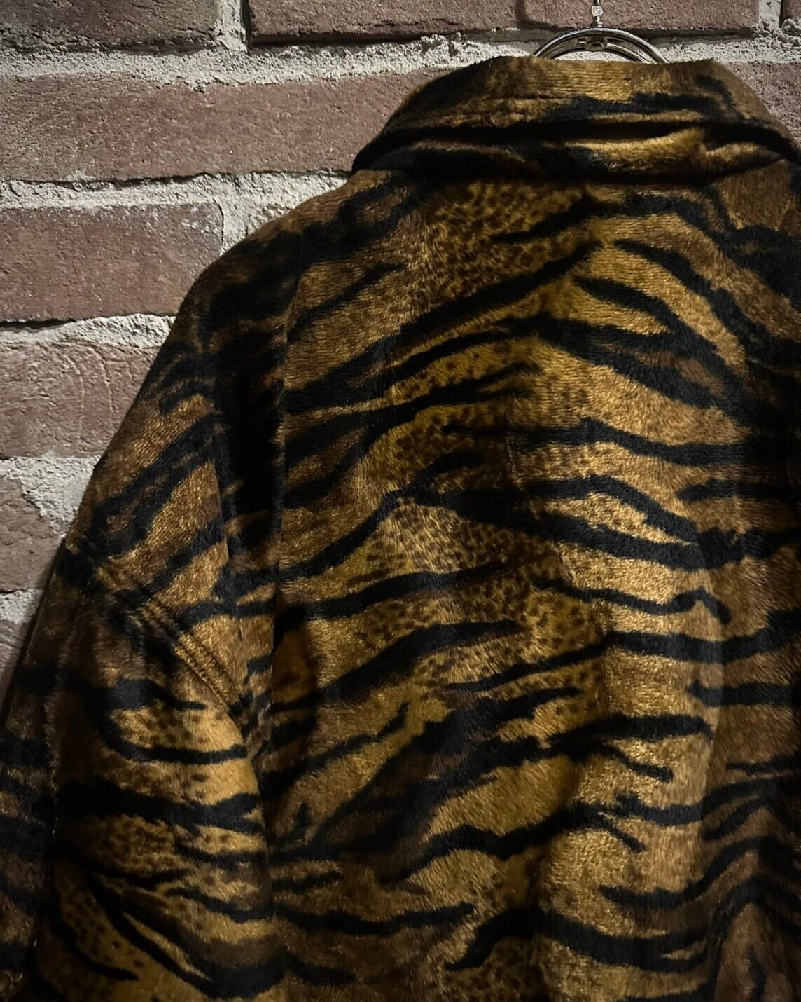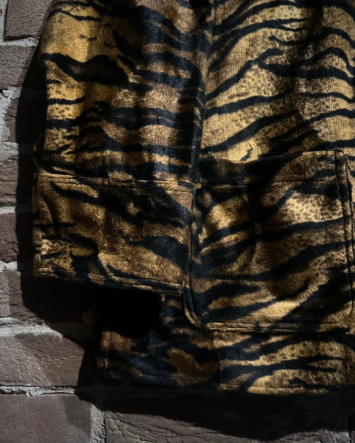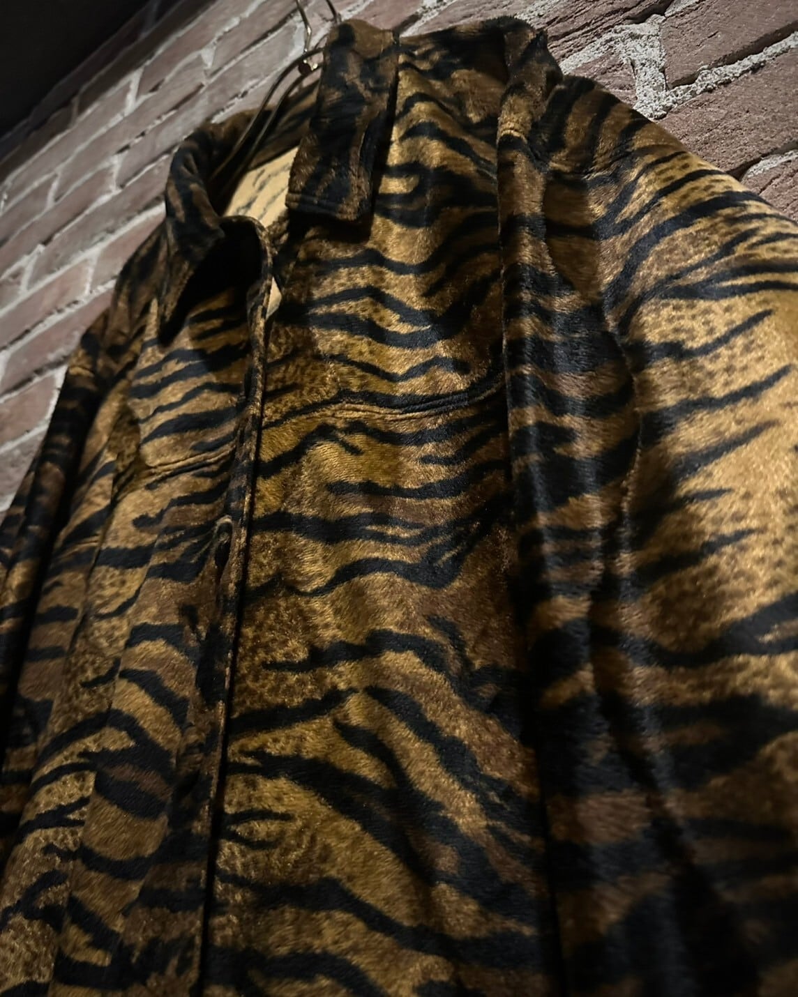 毛足が短く、ベロアのような滑らかな手触りの素材に虎柄を載せたシャツジャケット。