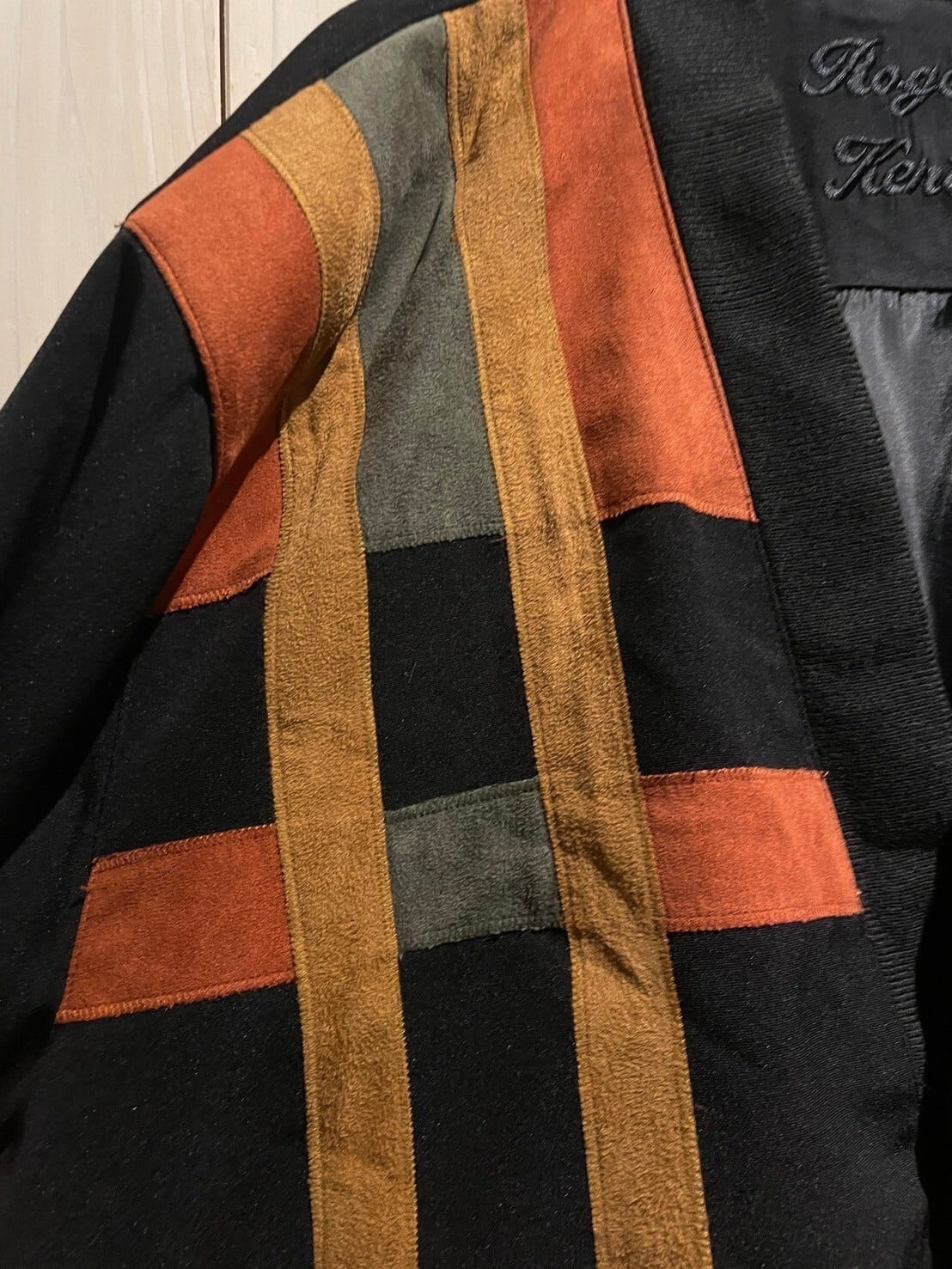 ツルッと手触り滑らかなポリエステル素材を用いたボディに、ベージュ、サーモンピンク、ブラウンのフェイクスエードをライン状に切り替えたカーディガン型のジャケット。