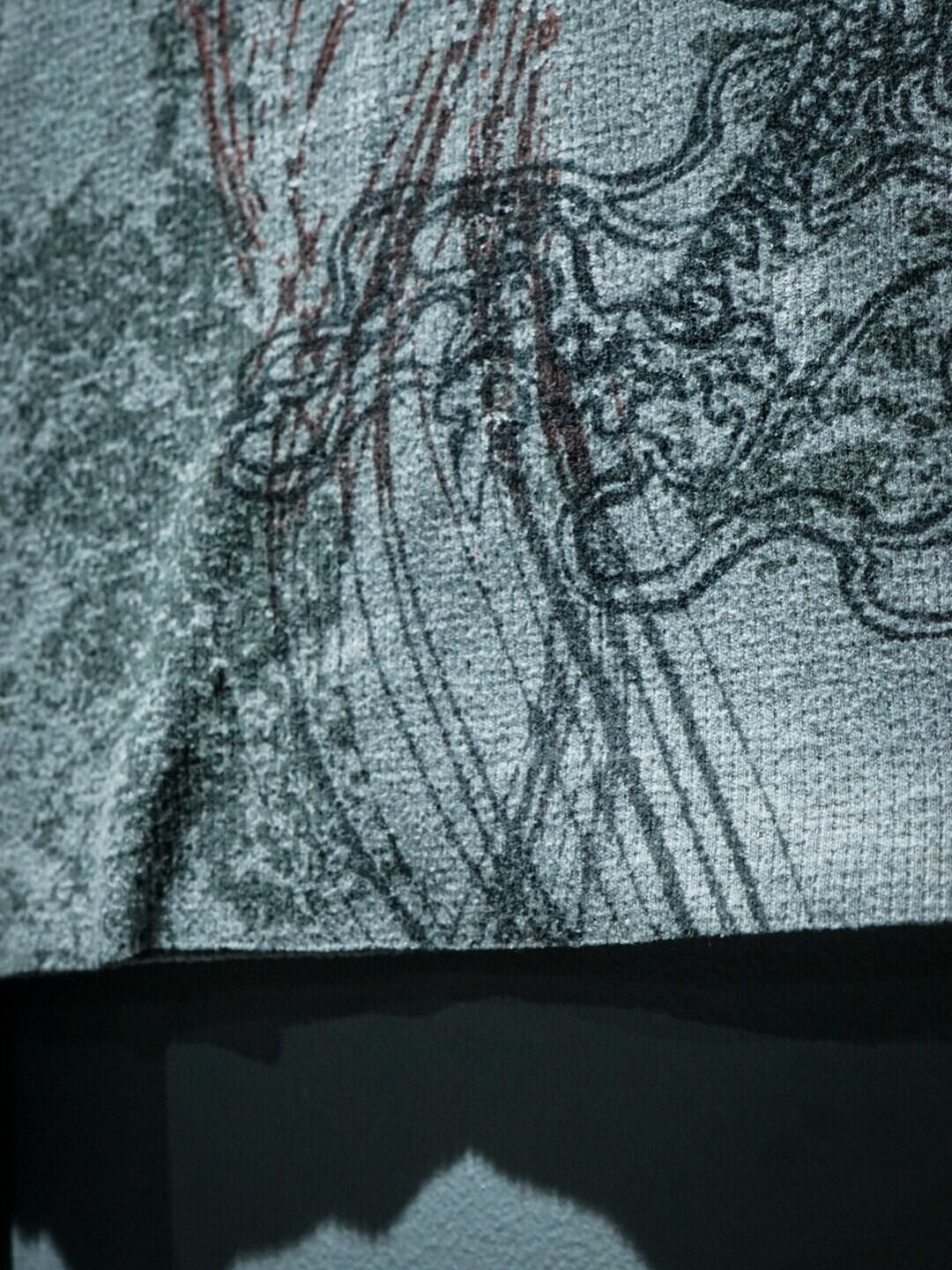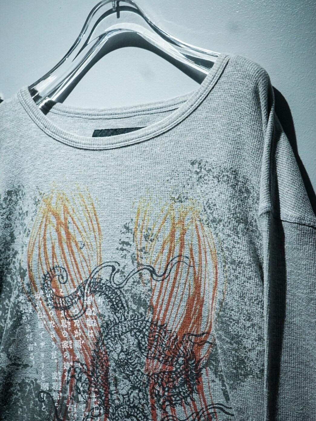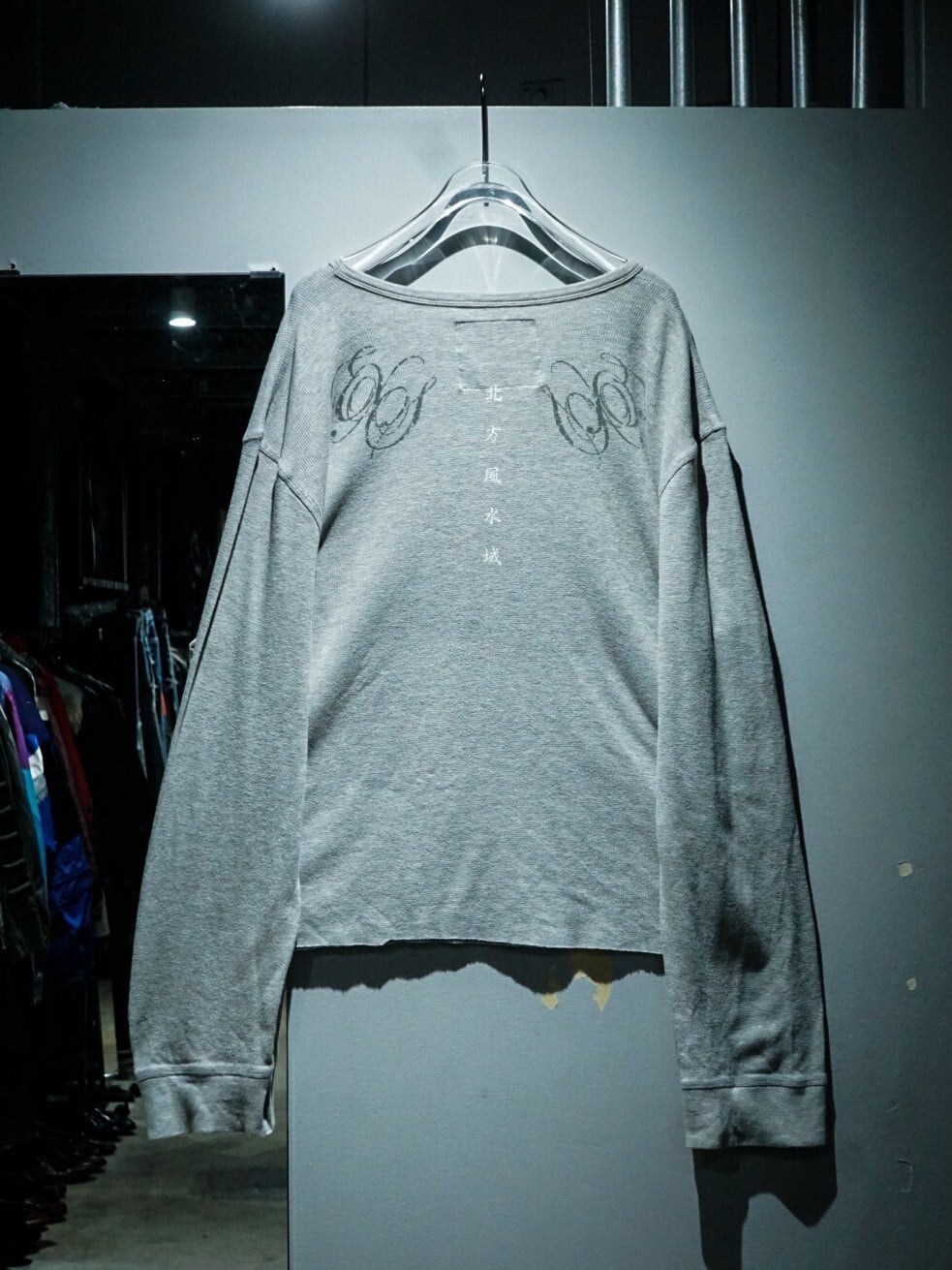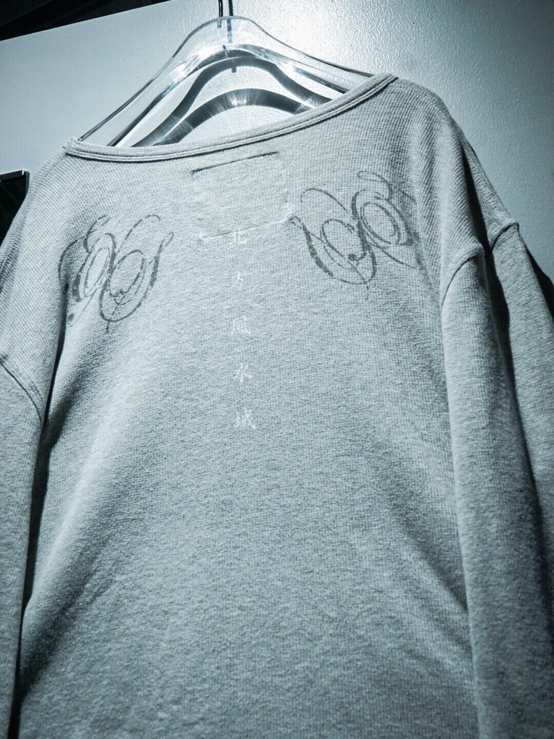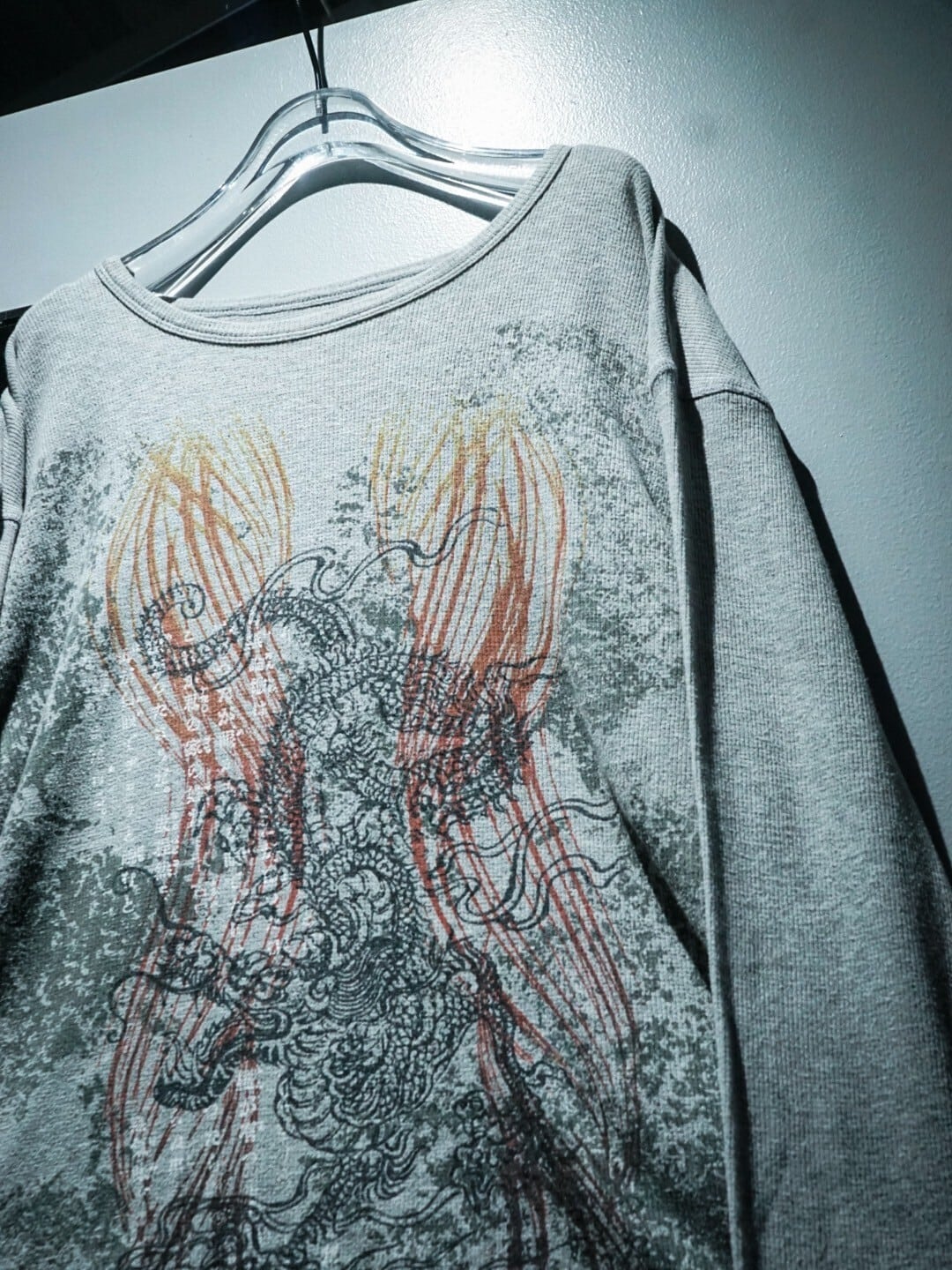 ゆったりとしたグレーの短丈サーマルTシャツのボディに、龍、漢字を載せた1着。
