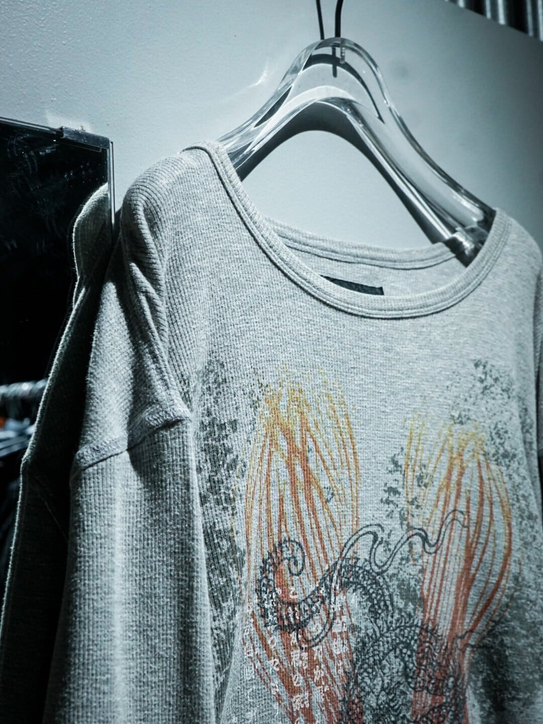 サーマルならではの凹凸のある生地感で肌触りも良く、着心地も最高。首元広め、前所有者のカスタムによる短丈シルエットも◎