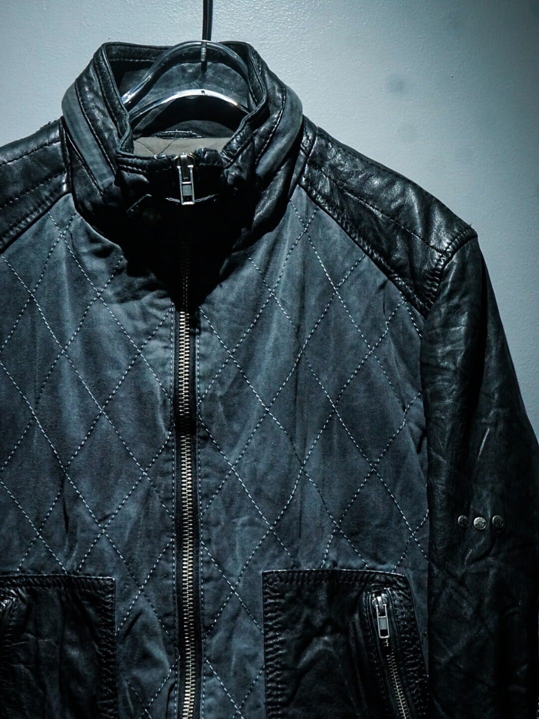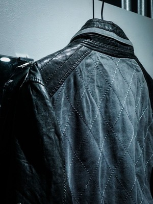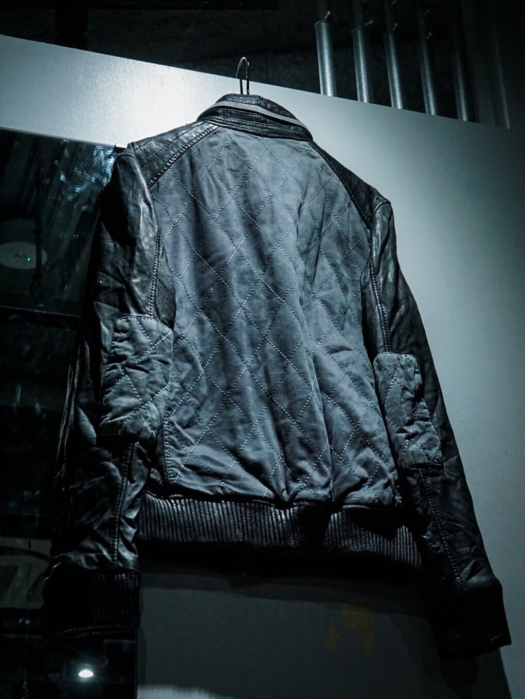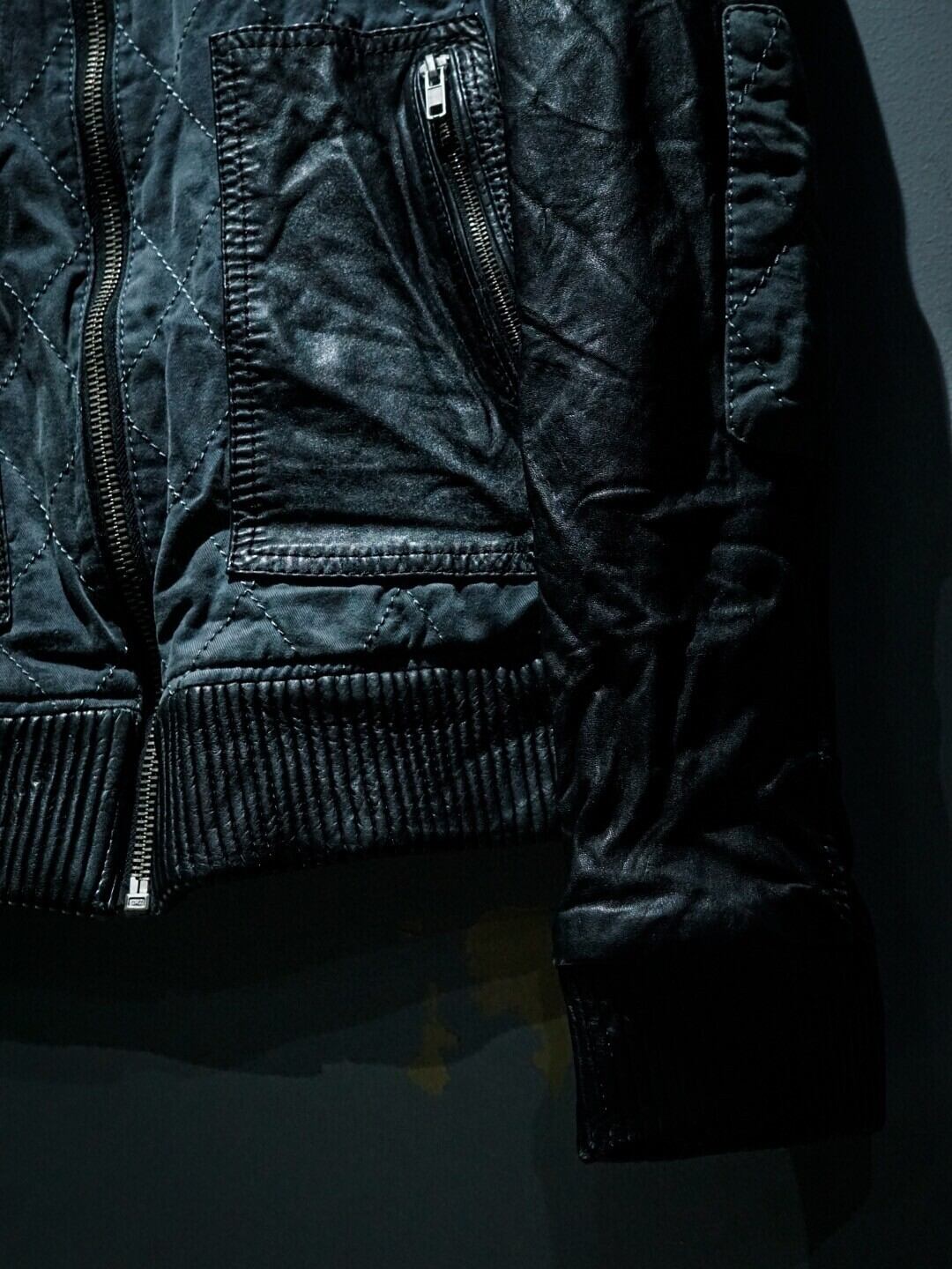 上質なナッパレザー特有の光沢、コットンのフェード感がマッチしモードな雰囲気をムンムンに醸し出しています。コットン部分にはキルティングステッチ、ボディサイドにはジップポケットに、リブまでレザーで仕上げられておりかなり完成度の高い1着かと。