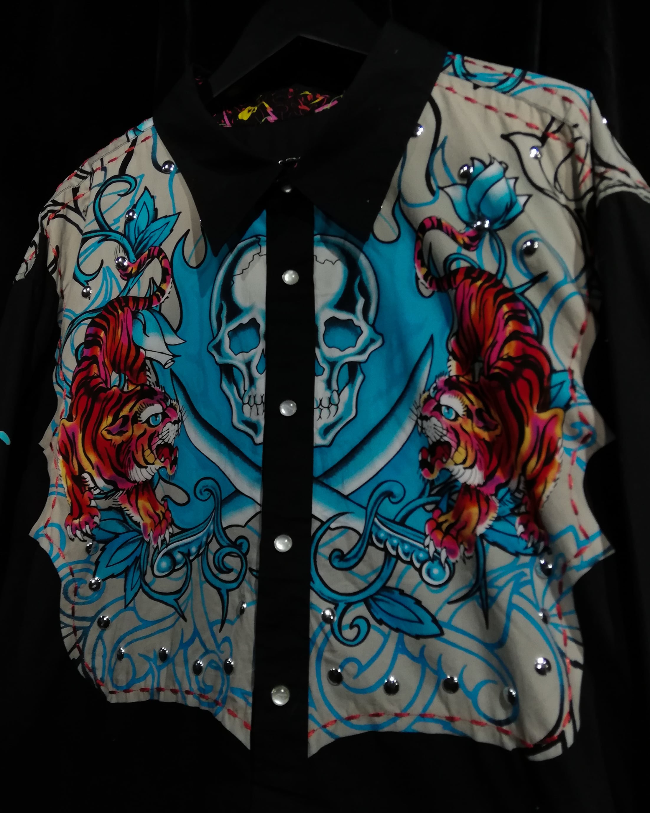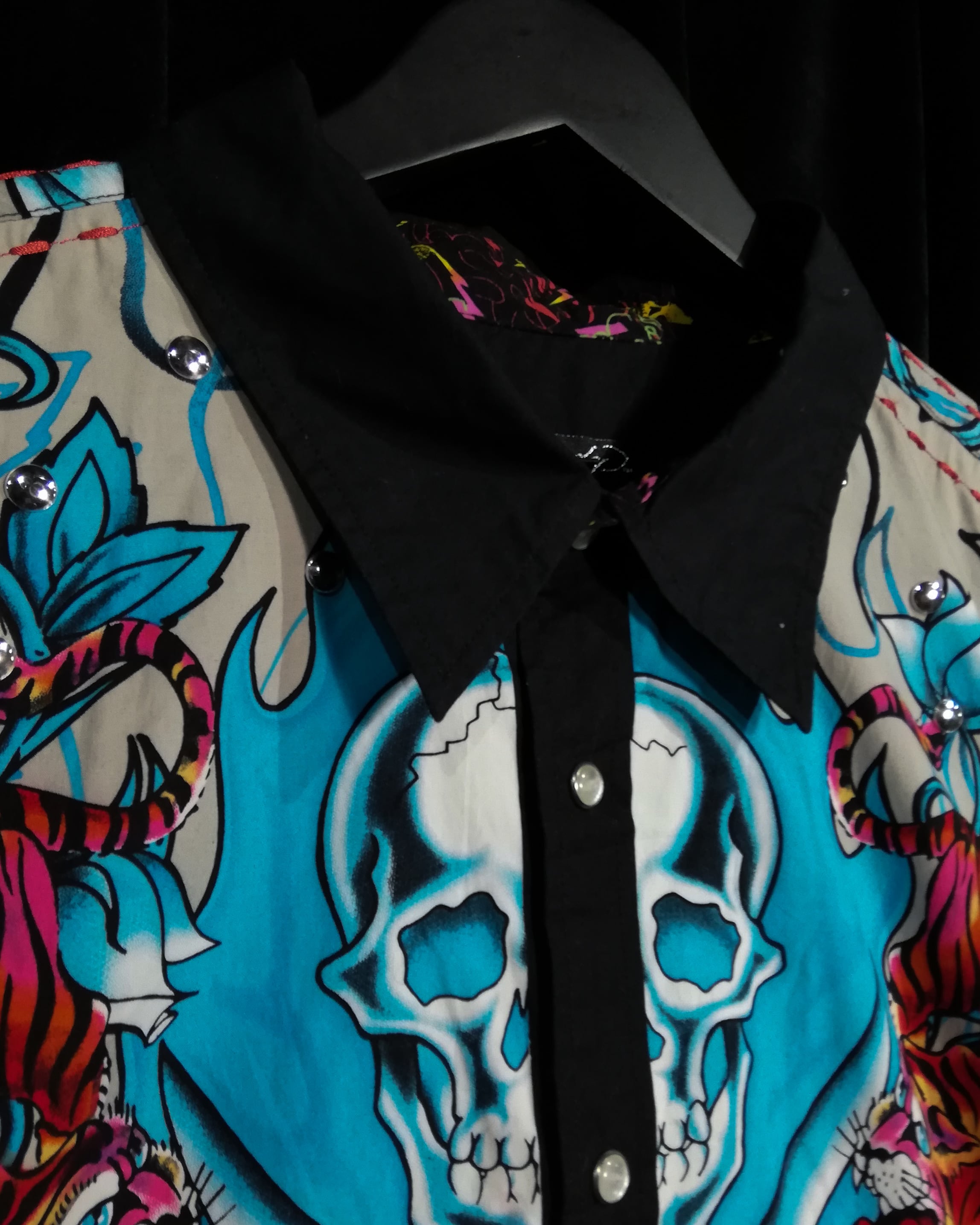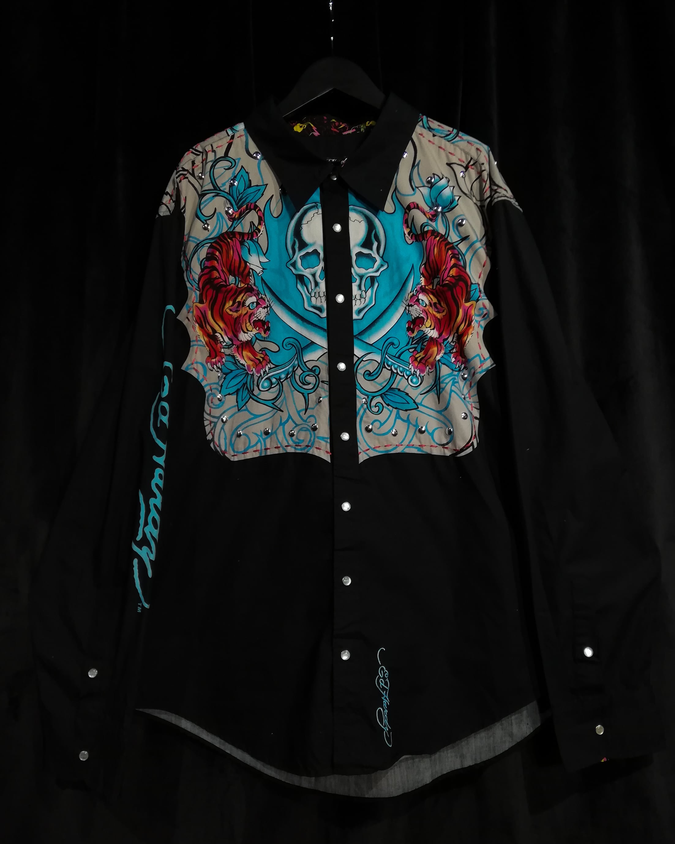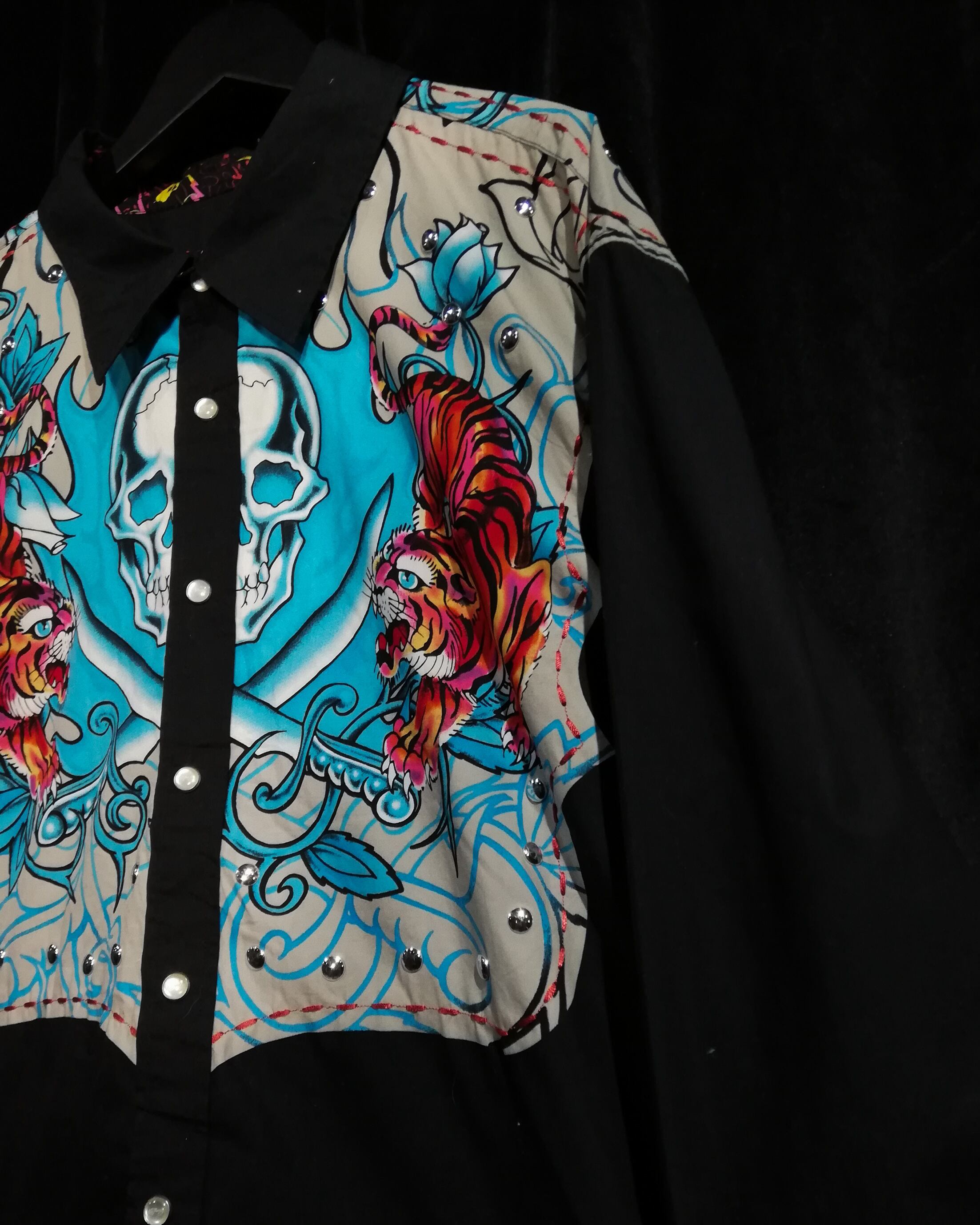 こちらは、スカルに虎、花などアメリカントラディショナル定番のデザインをウエスタン調に載せた、近年トレンドにもなっているY2Kな雰囲気が感じられる抜群の存在感を放つ長袖シャツ。
