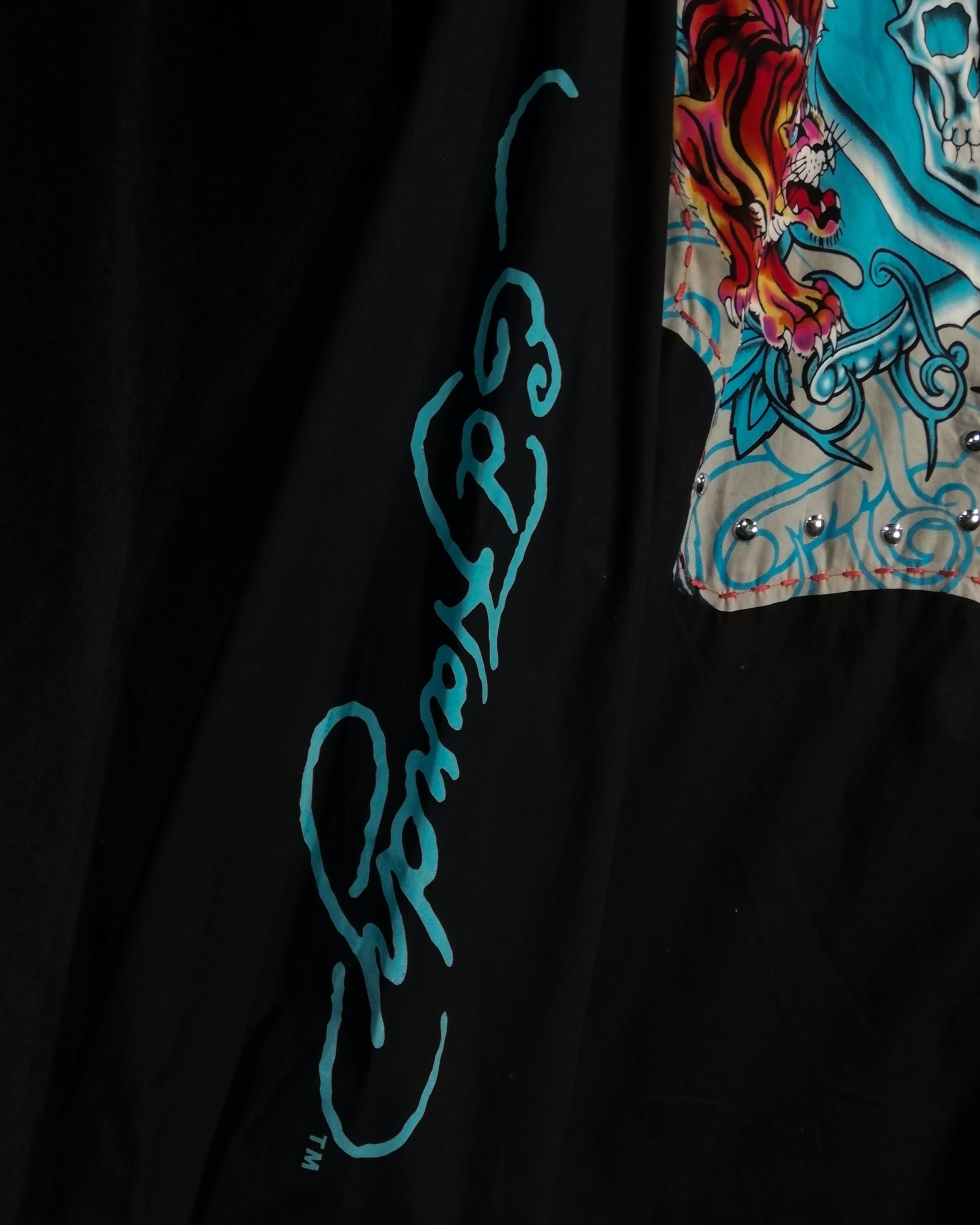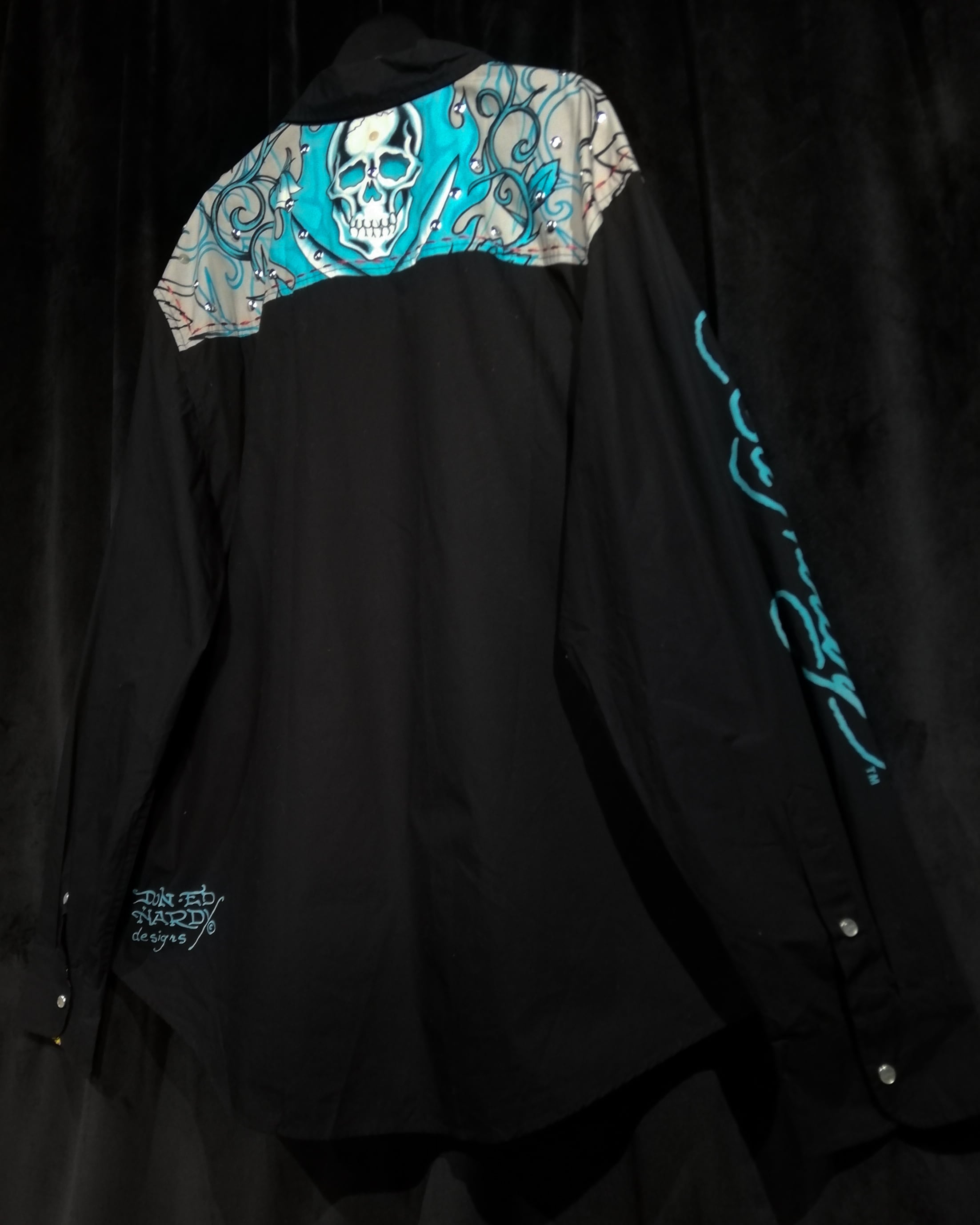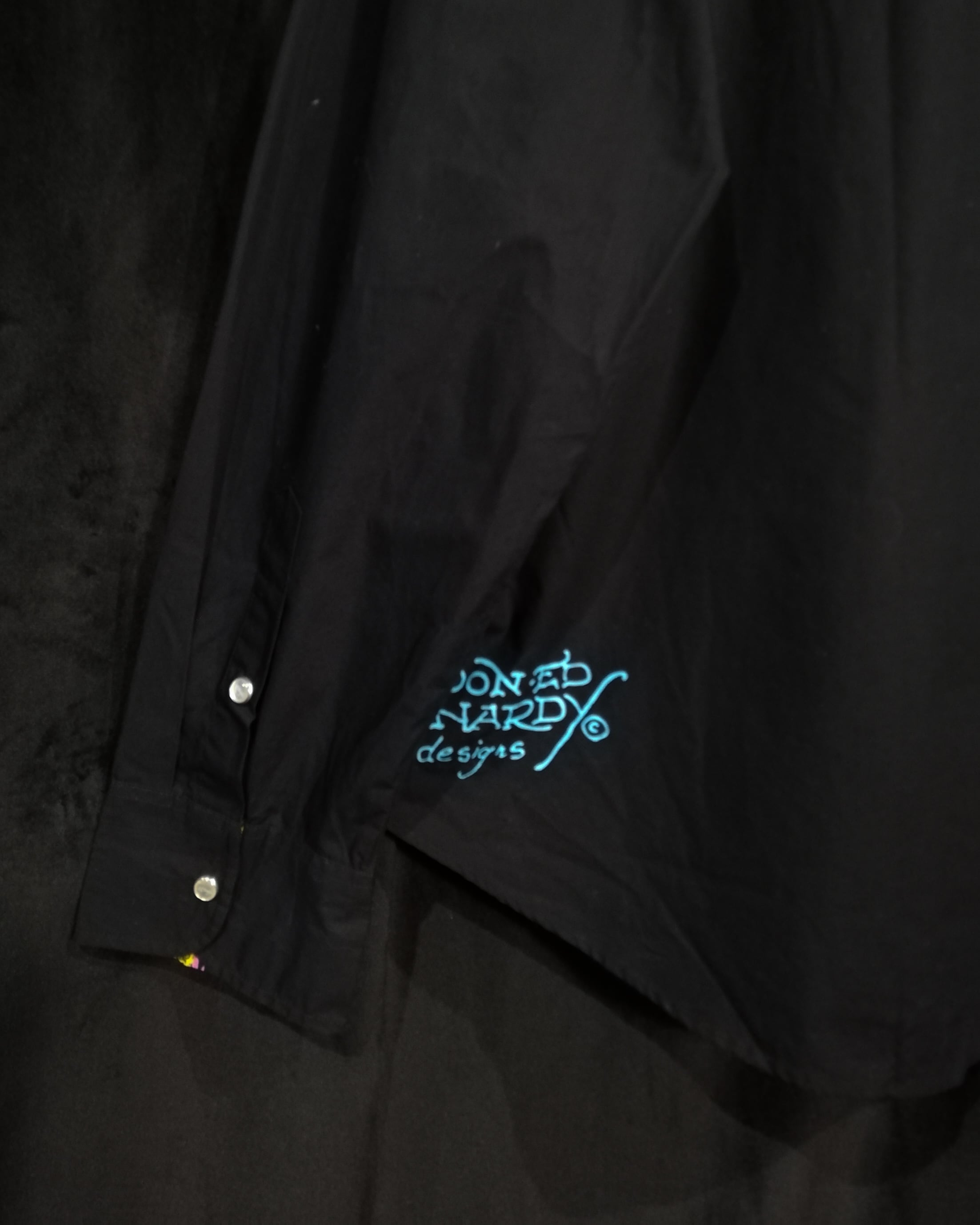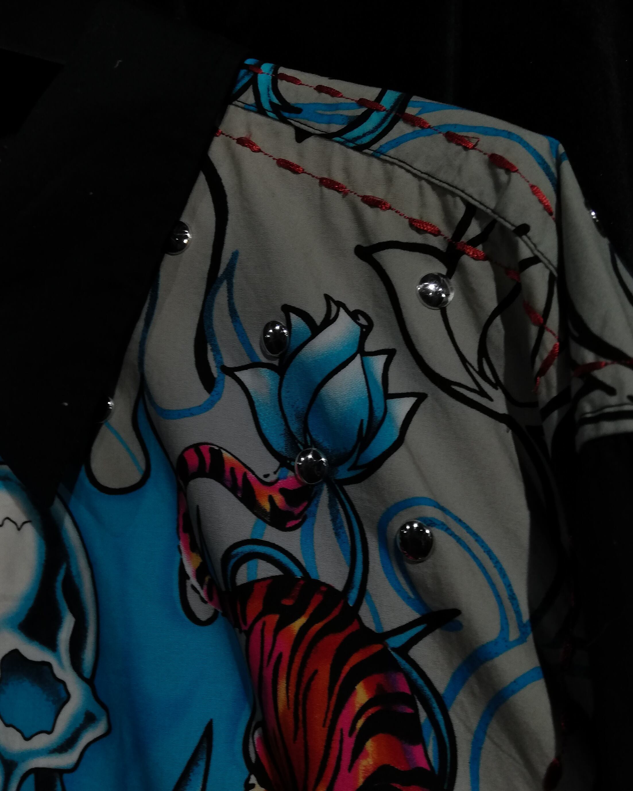 こちらは、スカルに虎、花などアメリカントラディショナル定番のデザインをウエスタン調に載せた、近年トレンドにもなっているY2Kな雰囲気が感じられる抜群の存在感を放つ長袖シャツ。