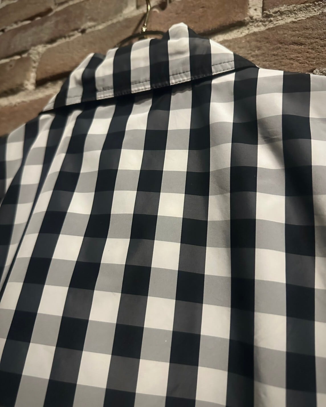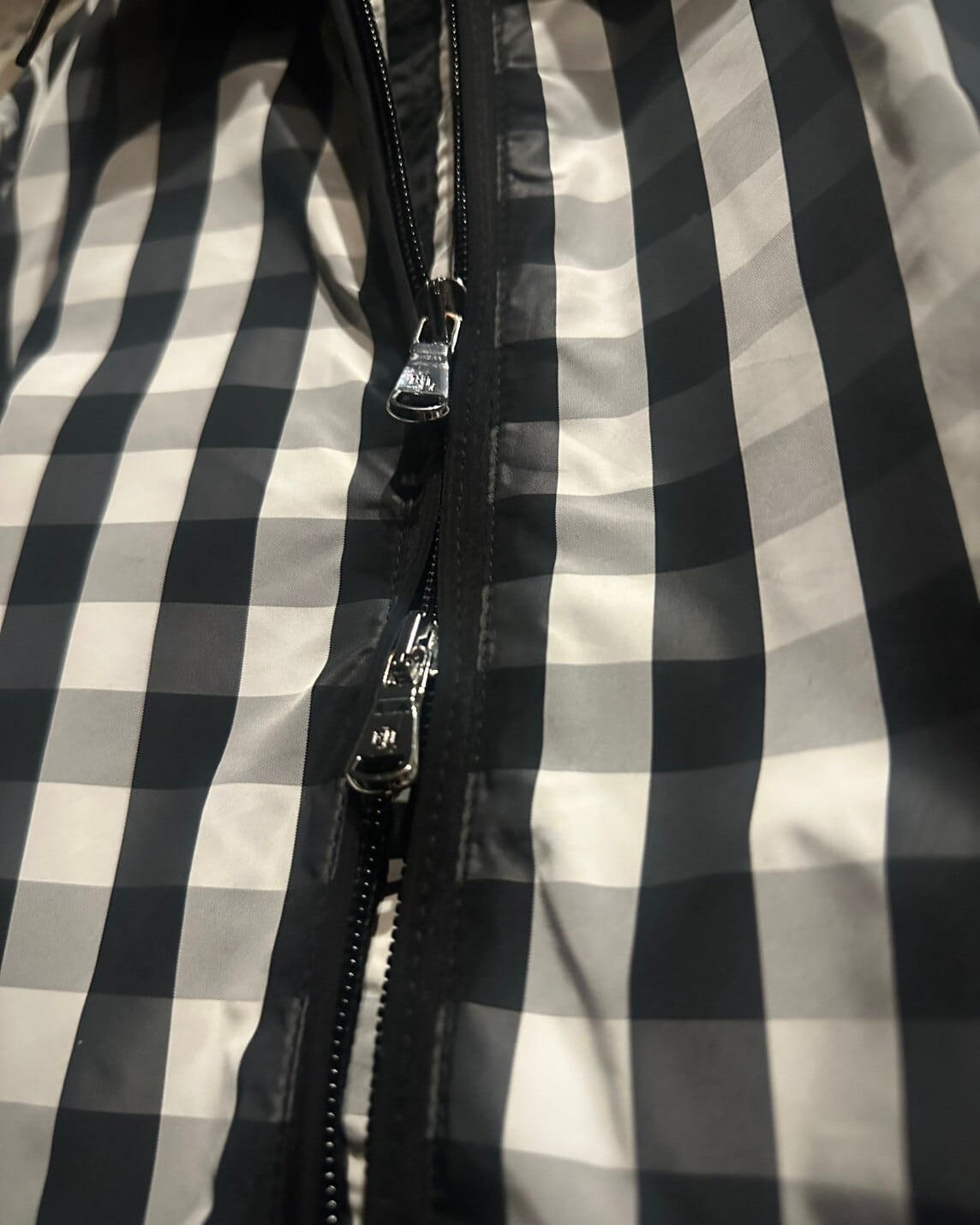 このブランドでは定番のドリズラー型のボディに、白×黒×グレーのモノトーンのブロックチェックを全面に配したジップアップジャケット。