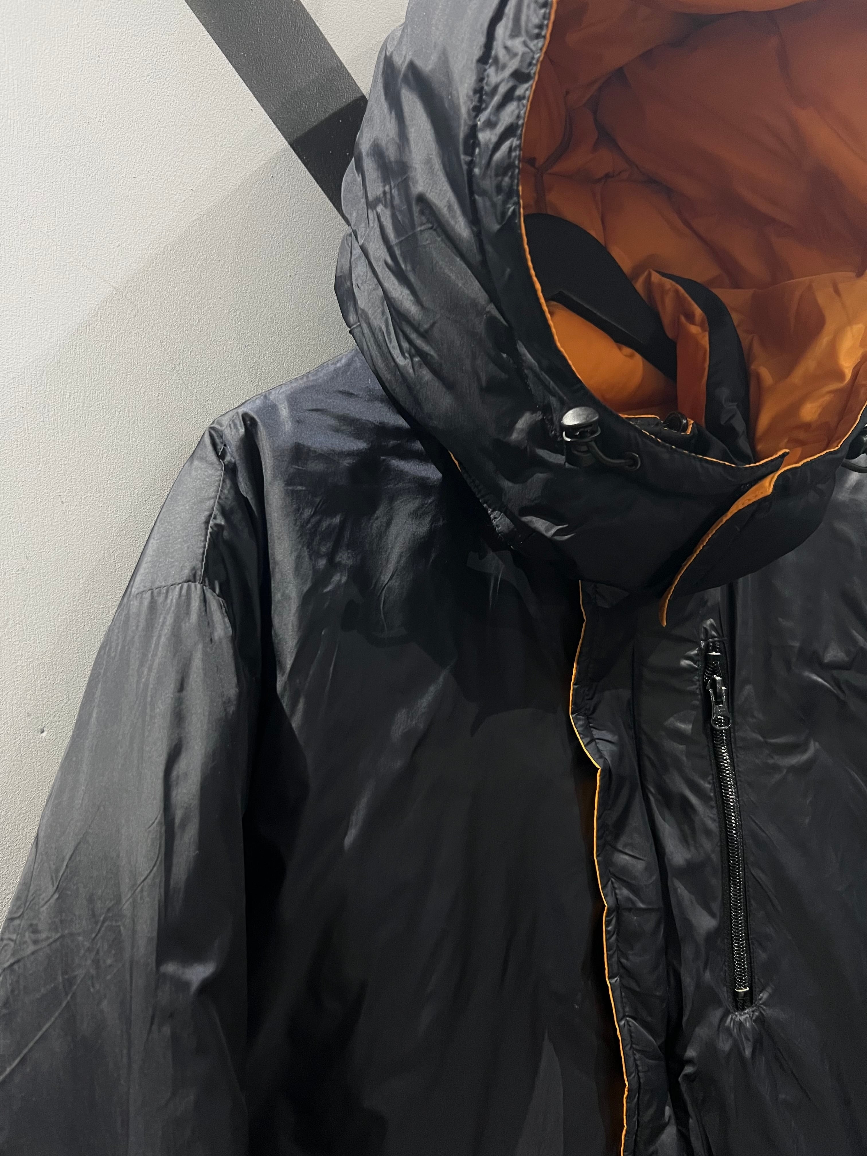 表面は目を惹くビビットなオレンジのボディ、ガバッと裏返すとブラック面へと切り替わる稀有なダウンジャケット。