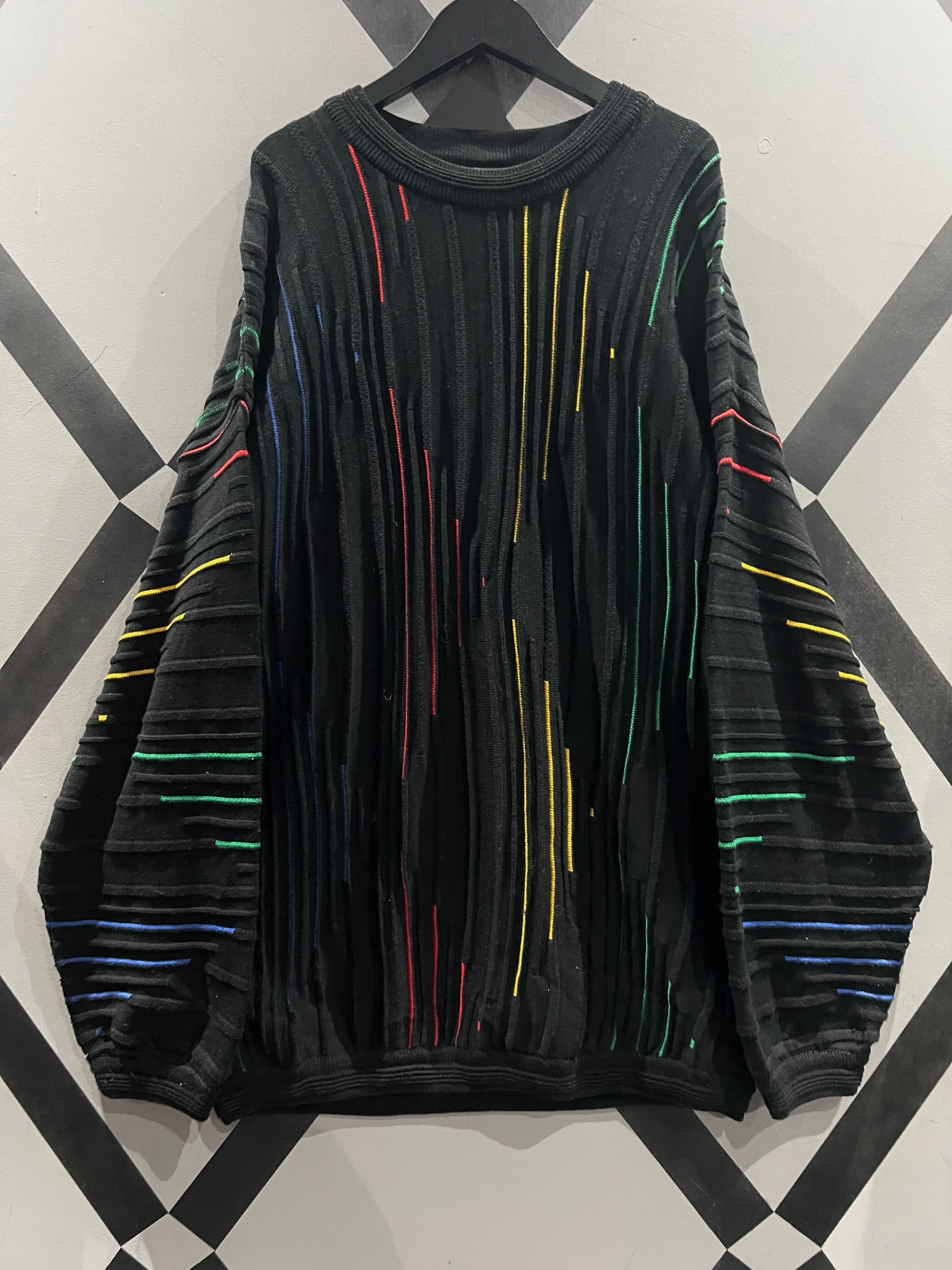 ブラックのボディをベースに、ストライプ状に3Dのラインを載せ、赤、青、黄、緑のカラーリングを組み込んだ3Dニット。