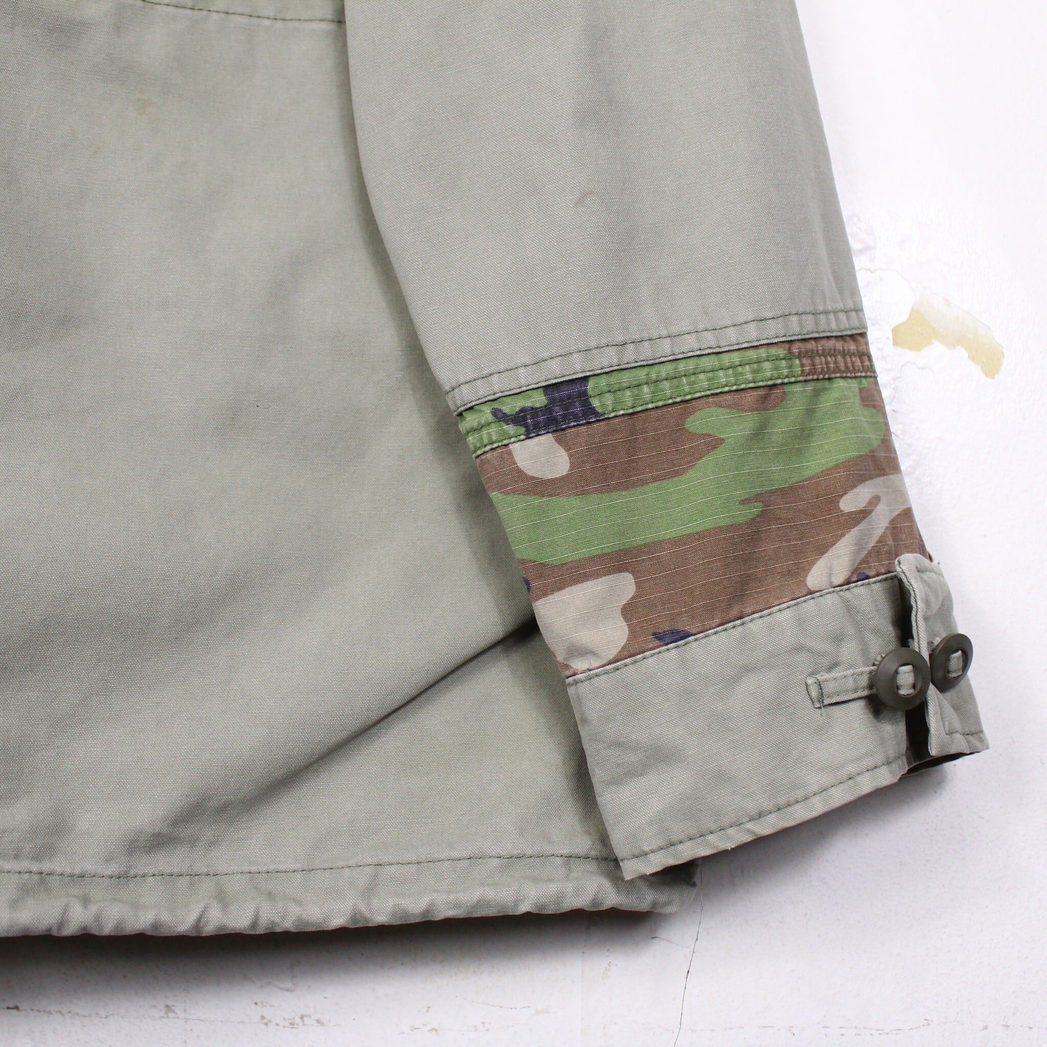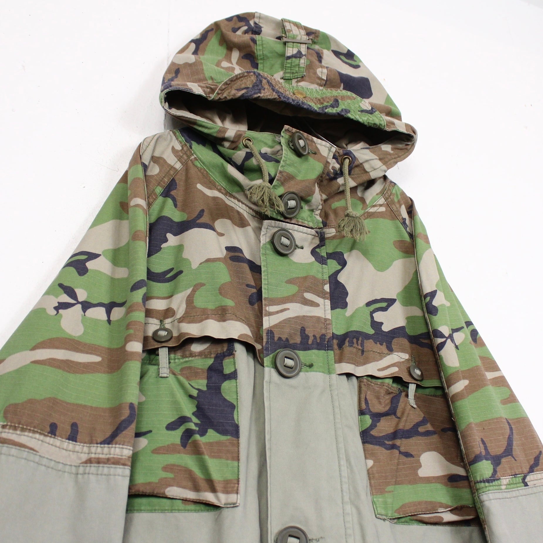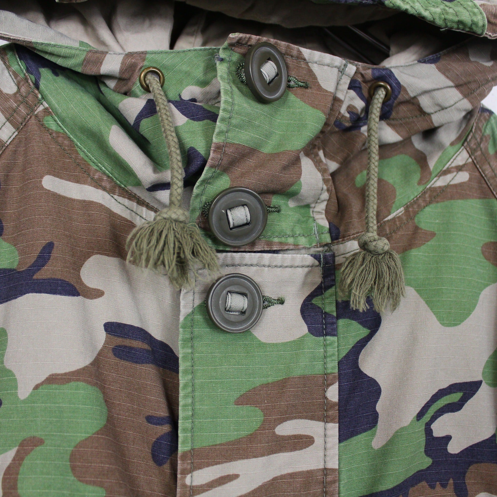 タフかつハリのあるダック地のボディに、ウッドランドカモ柄のリップストップコットンを切り替え。フロントにはヨークからのマチ付きポケットに、大容量のボディ下部のポケットとしっかりとこのアイテムならではのディテールが踏襲されています。