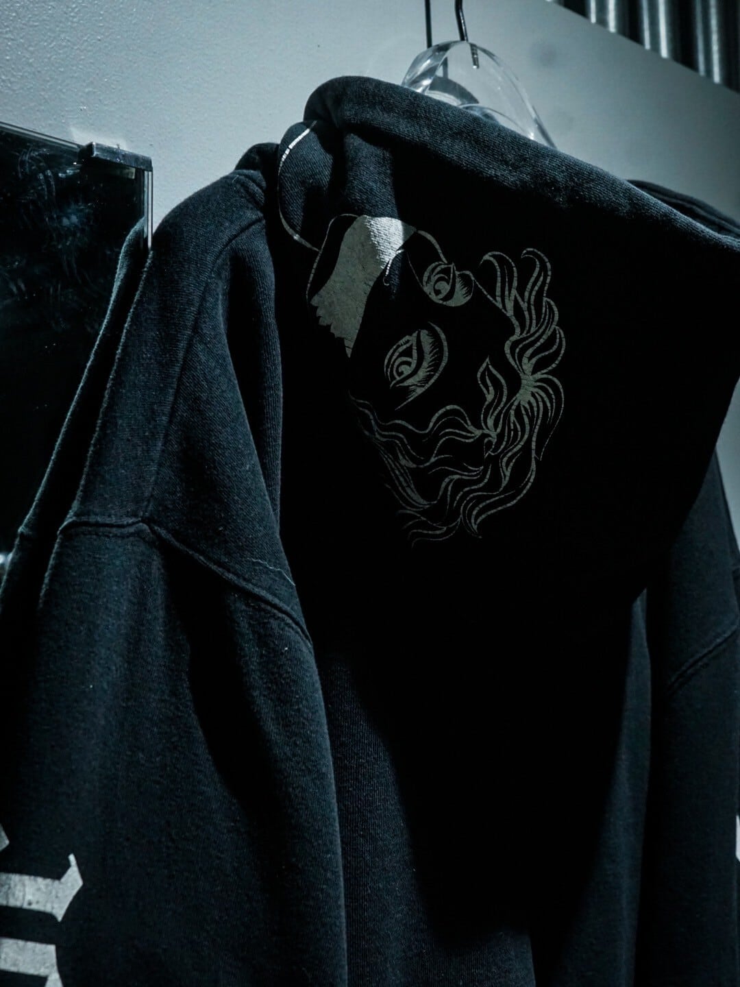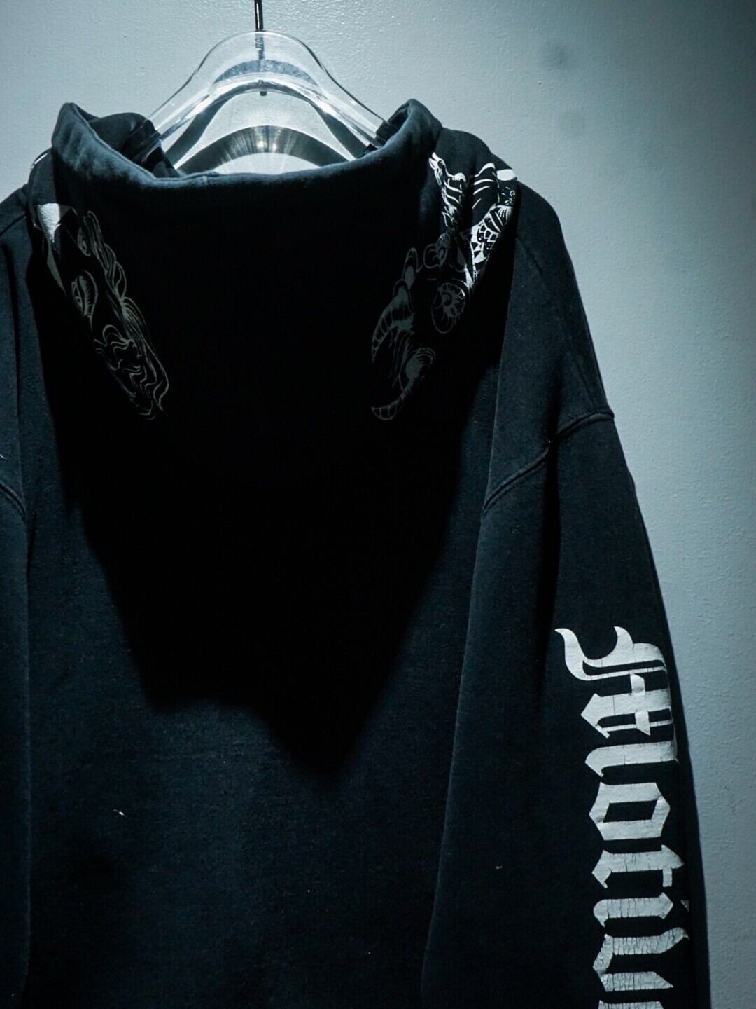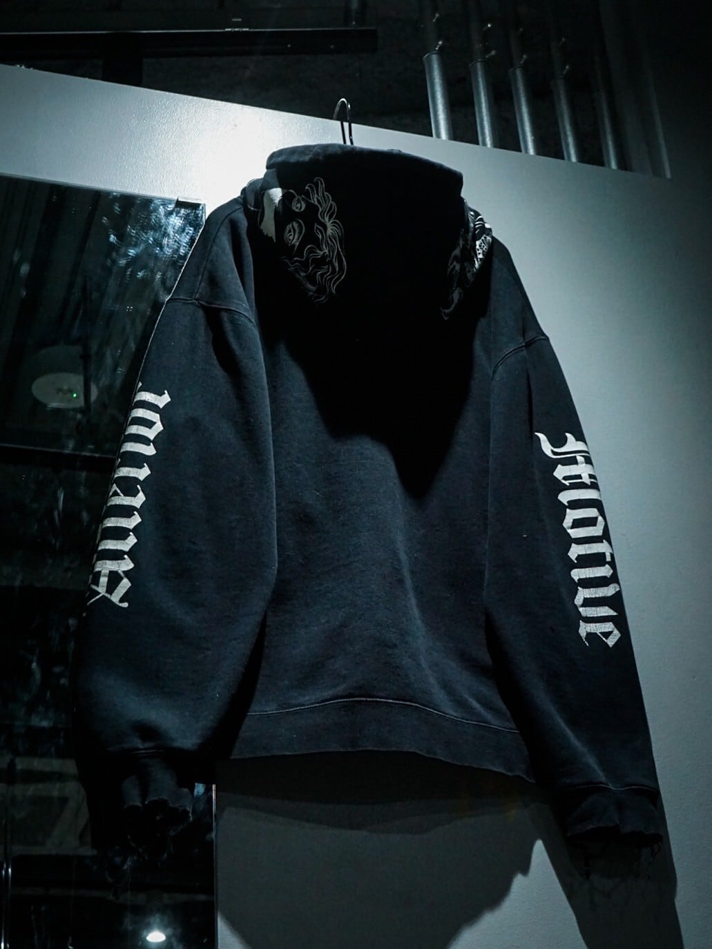 ブラックの薄手スウェットボディに、フードには天使と悪魔のプリントの施し、アームにも文字デザインを施した、厨二心漂うゴシックデザインの載ったジップフーディー。