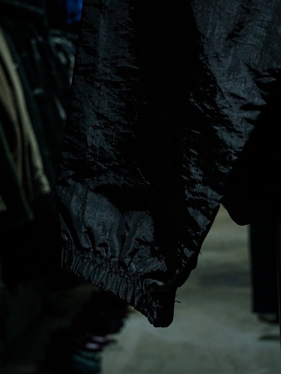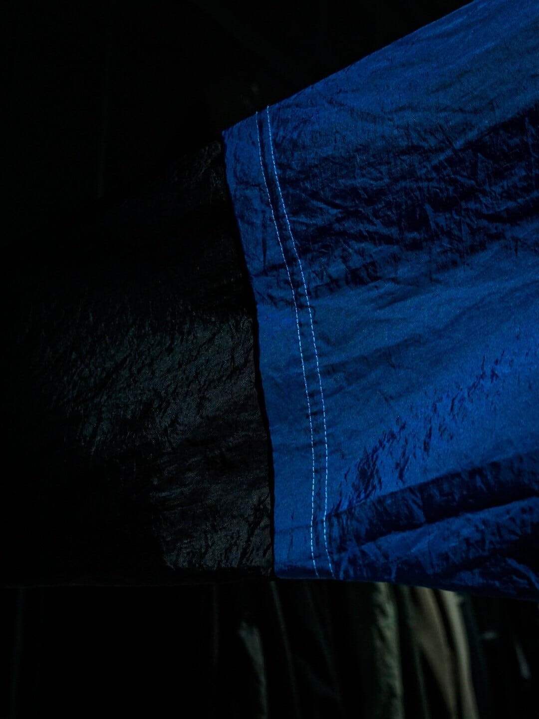 特有の光沢を放ちシャリ感のあるナイロン素材を採用し、ブルーとブラックのカラー切り替えを施したアノラックパーカー。