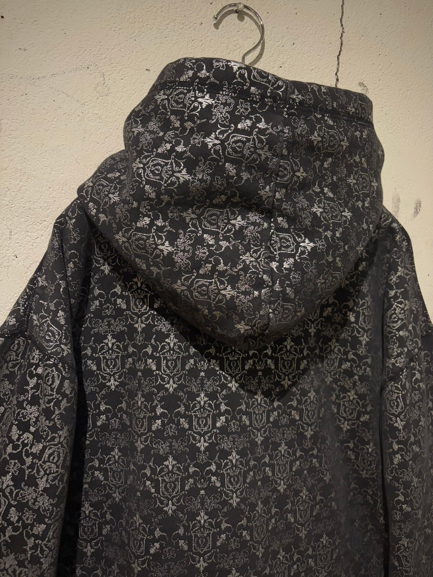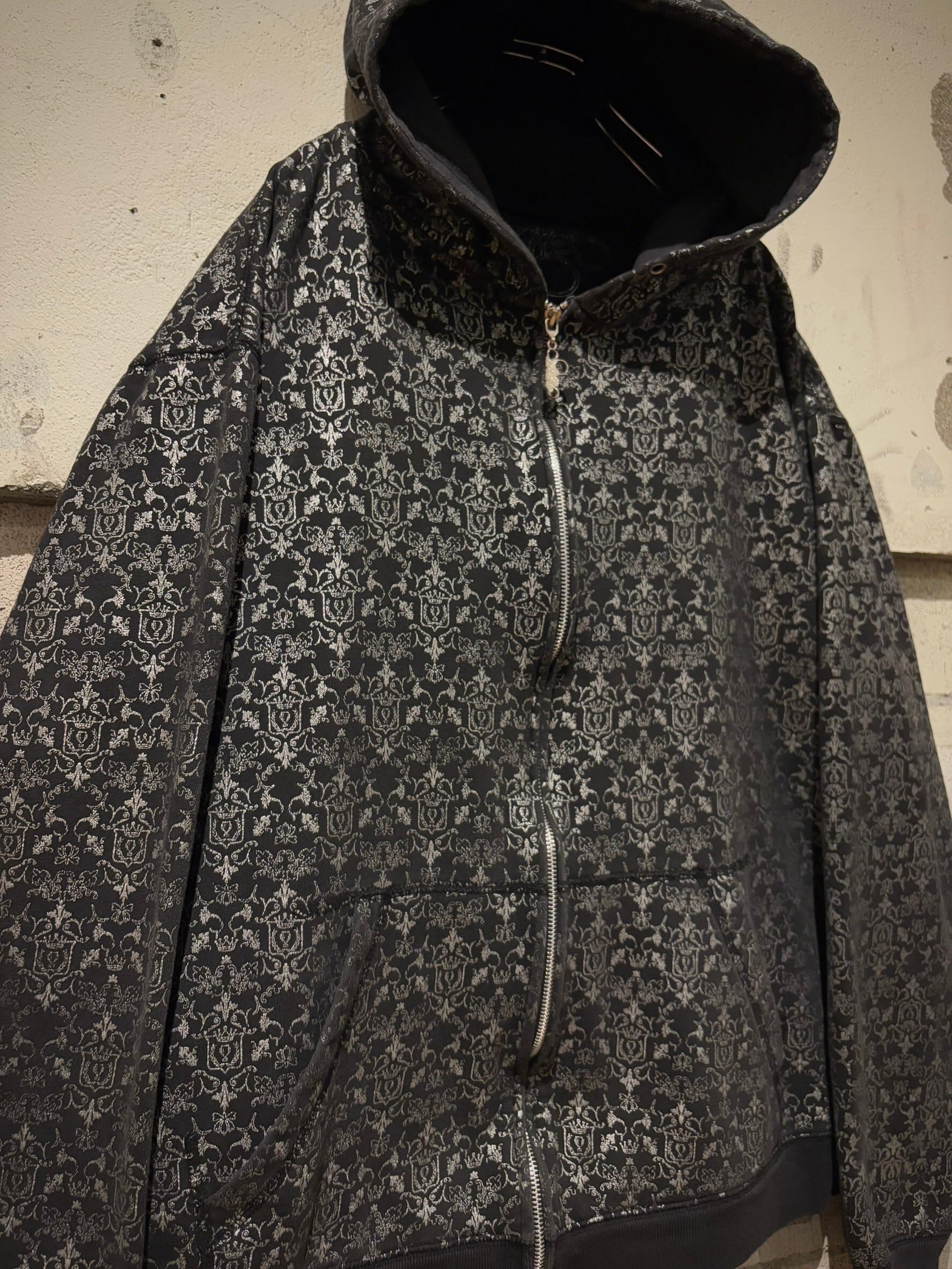 若干の肉感があるブラックのボディをベースに、ダマスク調のデザインをプリントしたジップアップフーディ。