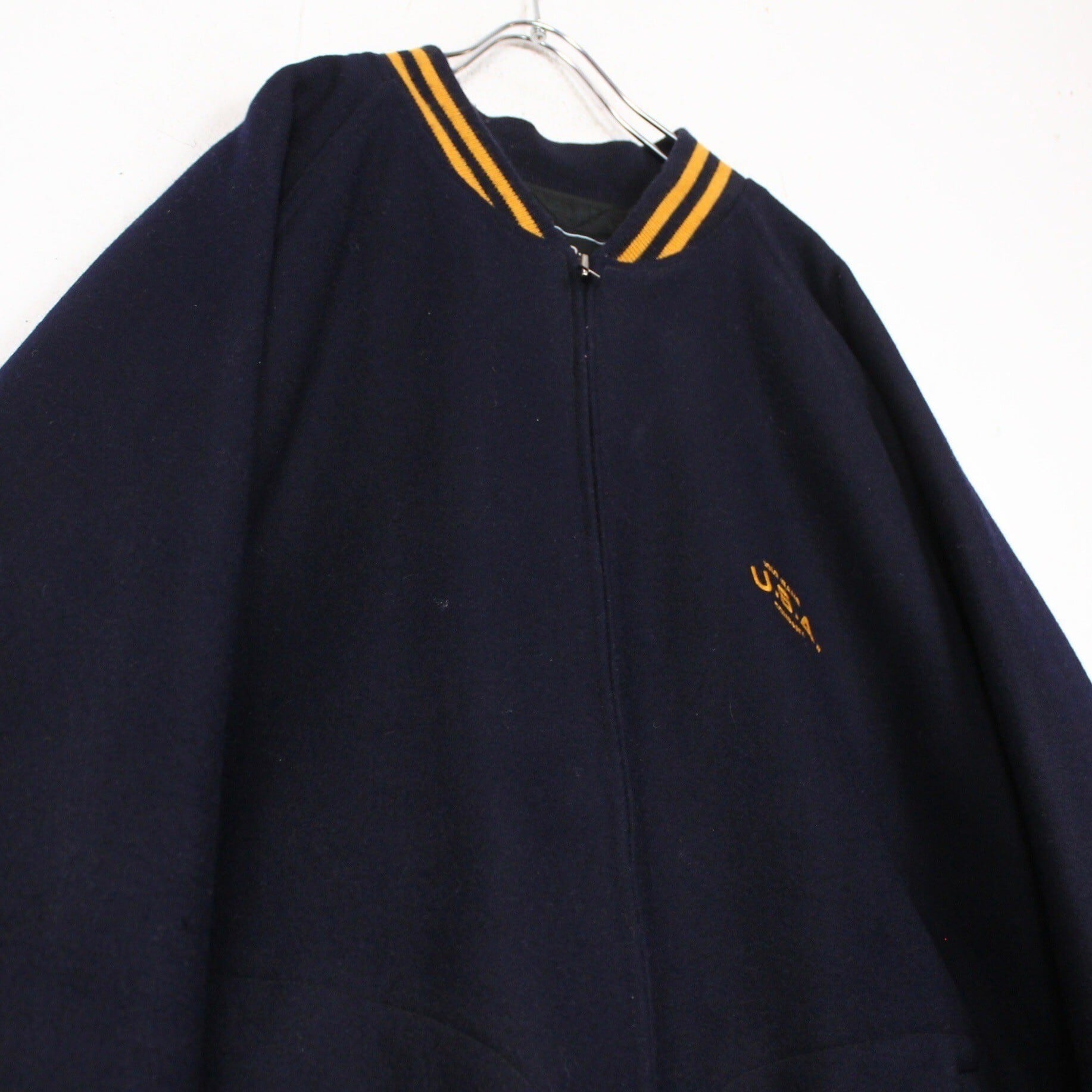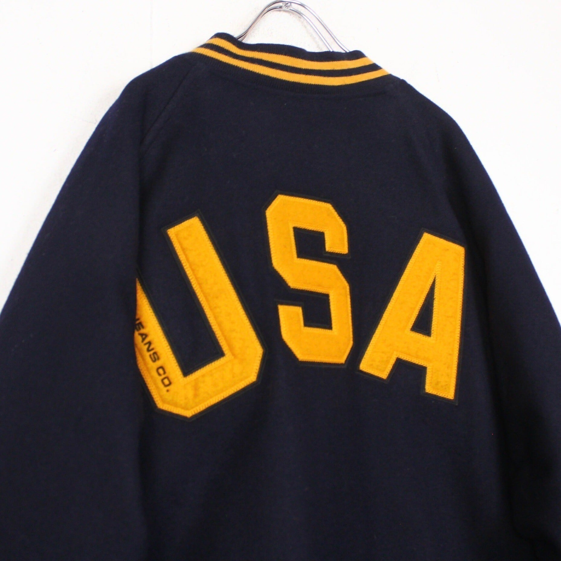 ギュッと目が詰まった上質なネイビーのウール素材に、黄色の刺繍によってネームロゴとUSAの文字を胸に、背面にはワッペンを施したスタジャン。