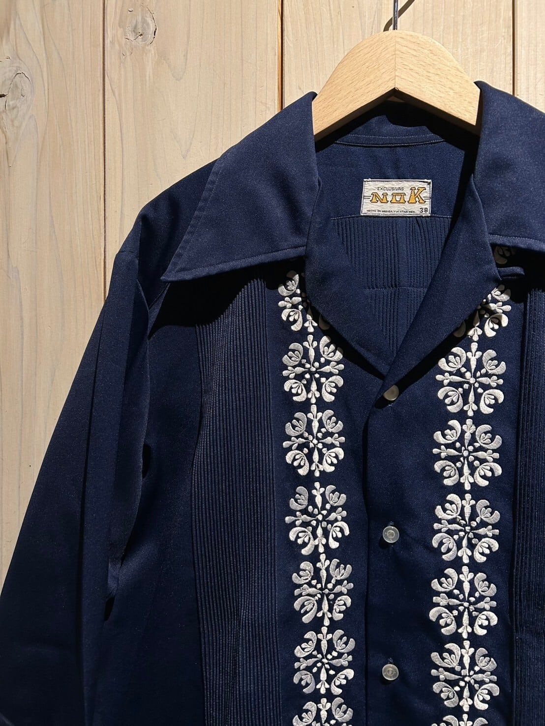 深みのあるネイビーのボディにボタニカル調の刺繍と細かいプリーツを配した70'sのヴィンテージキューバシャツ。