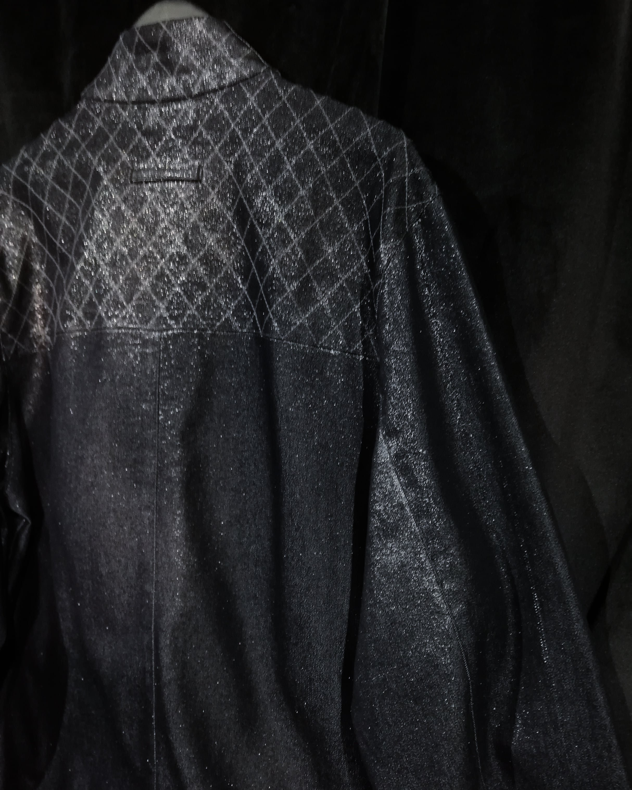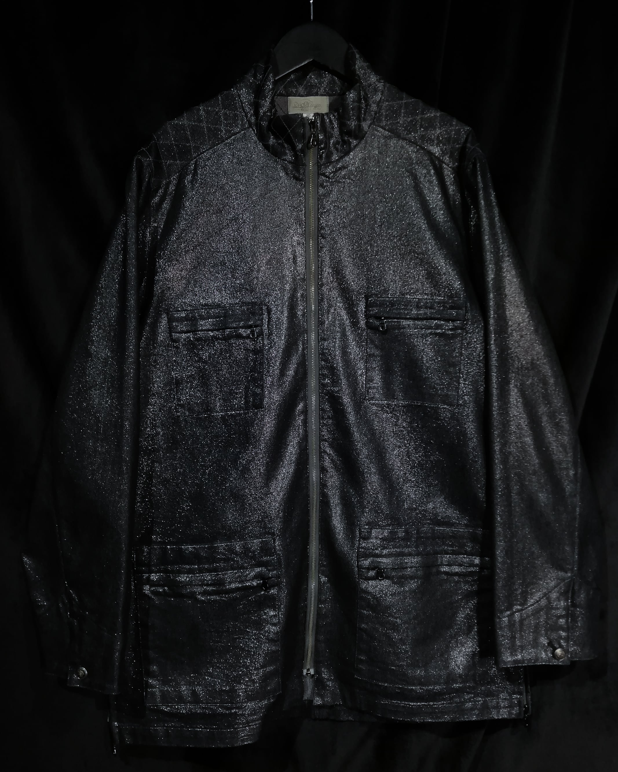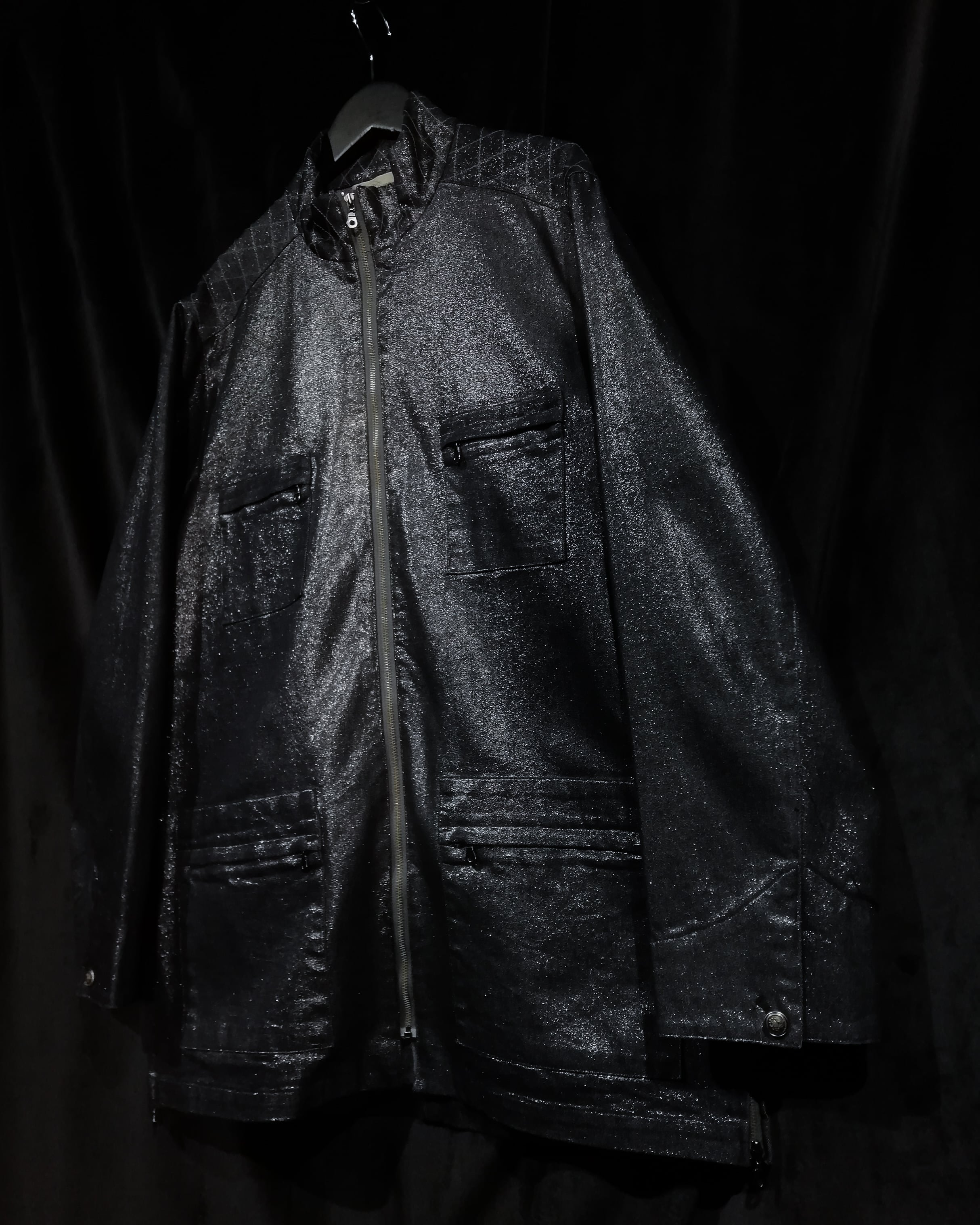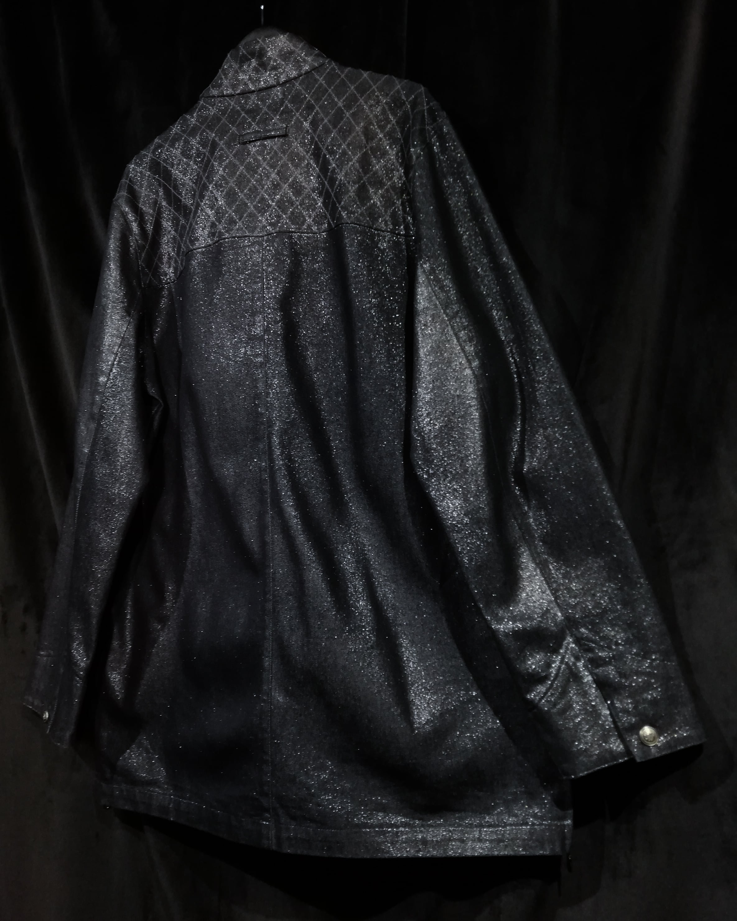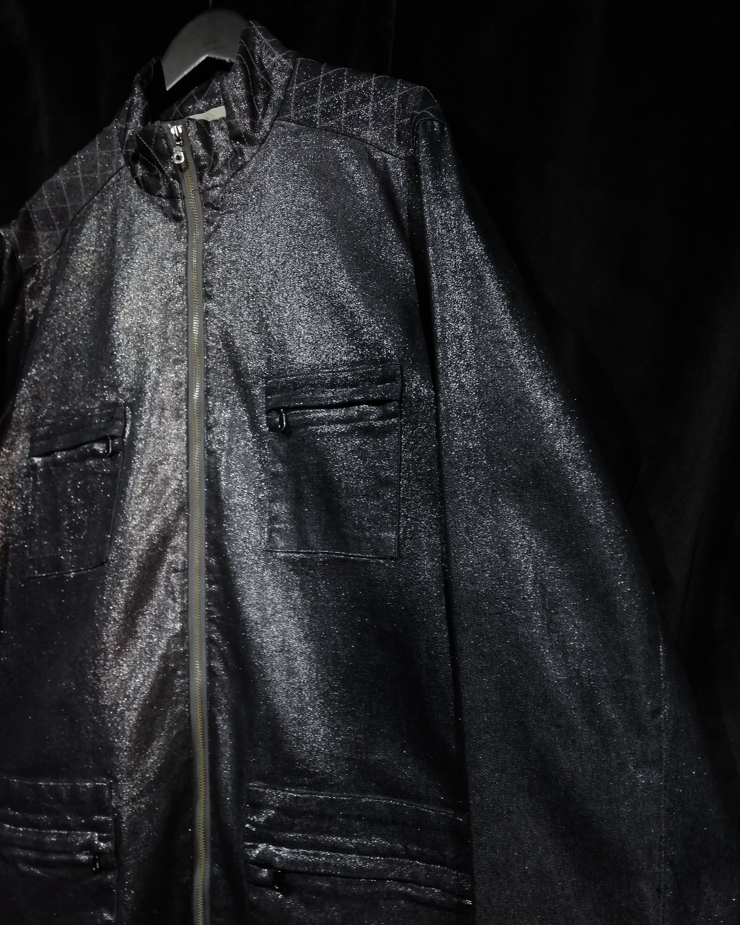 光の当たり加減で表情を変えるメタリックカラーのボディに、肩周りにクロス状のステッチを載せたジャケット。