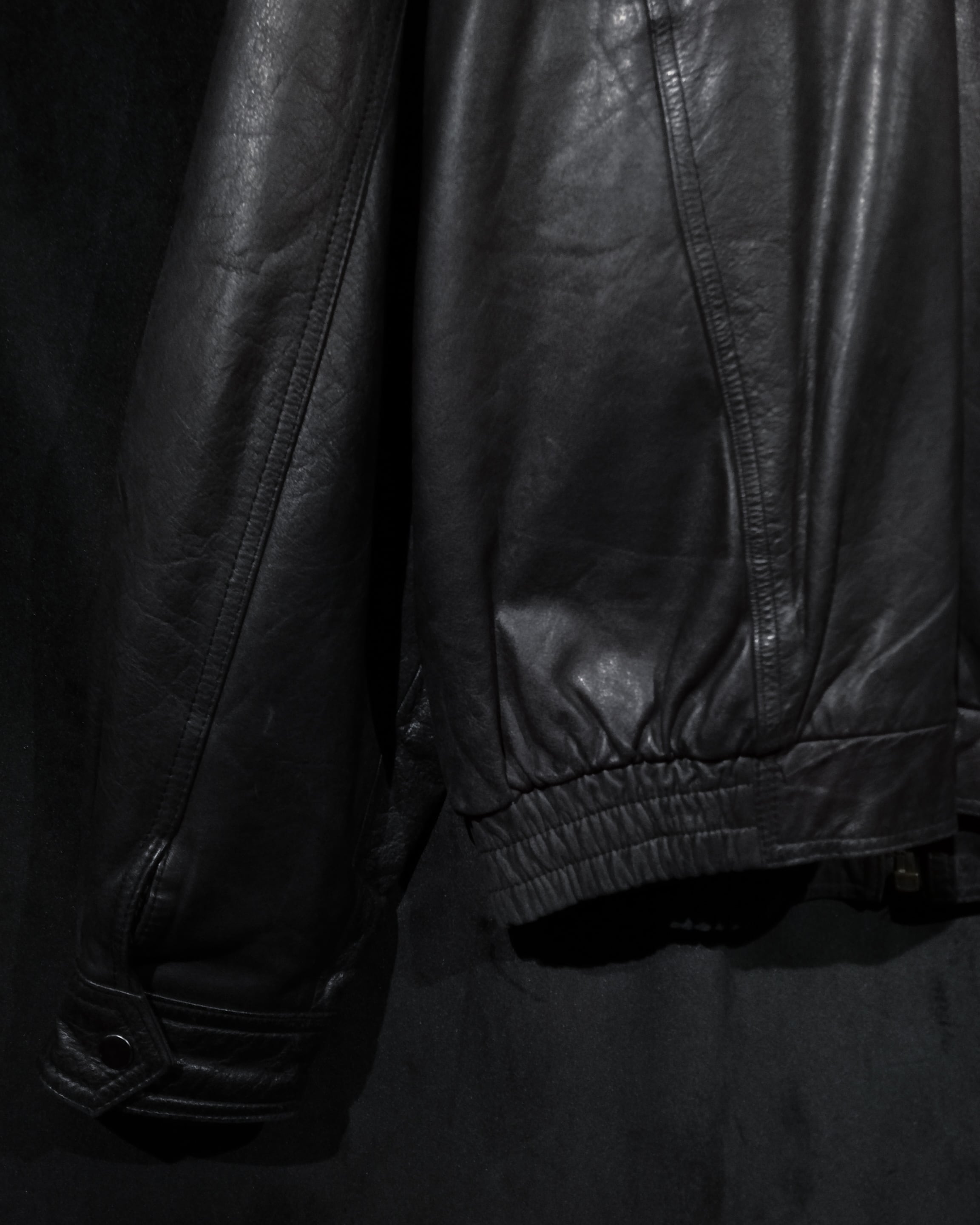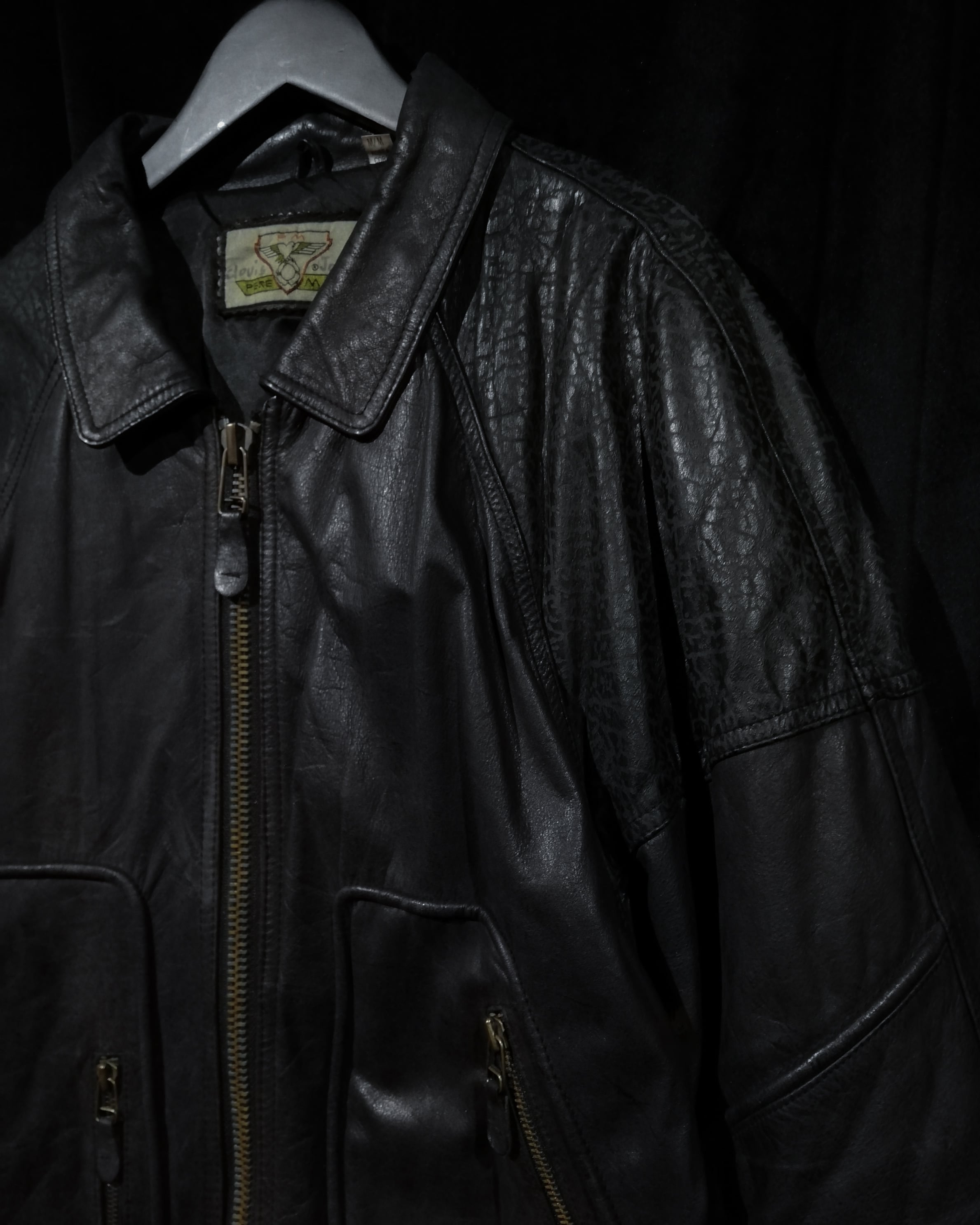 柔らかく滑らかなブラックのボディに、肩周りに抽象的な柄模様を切り替えたジップアップレザージャケット。