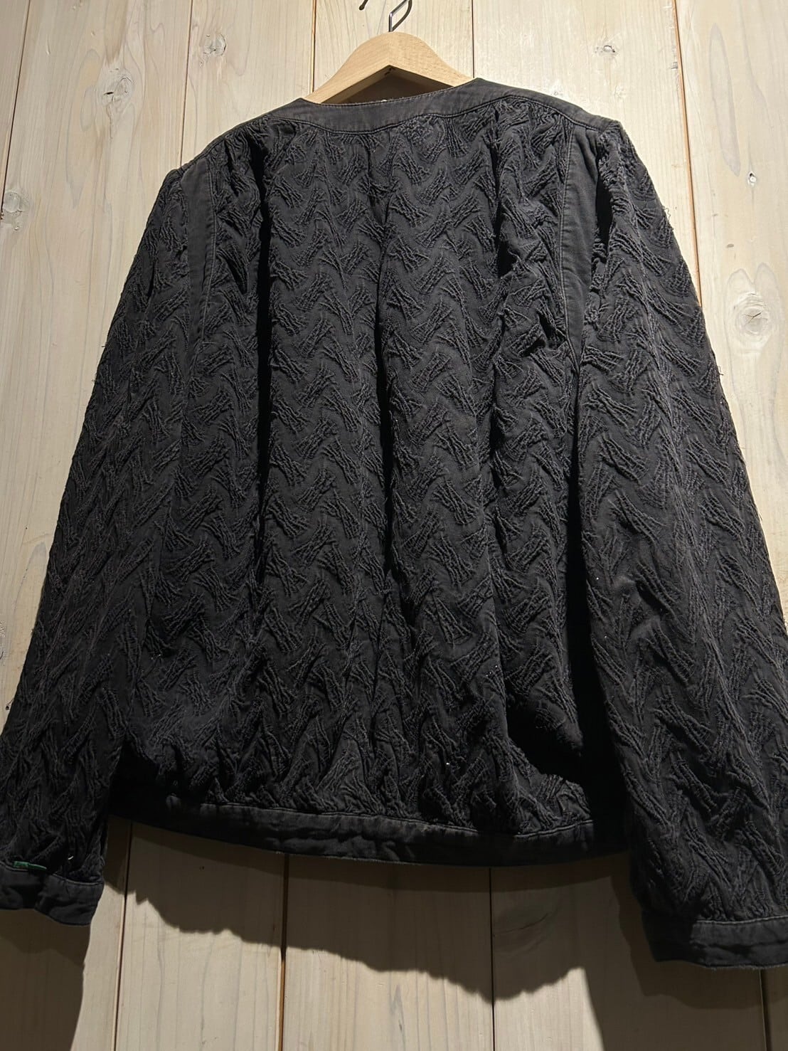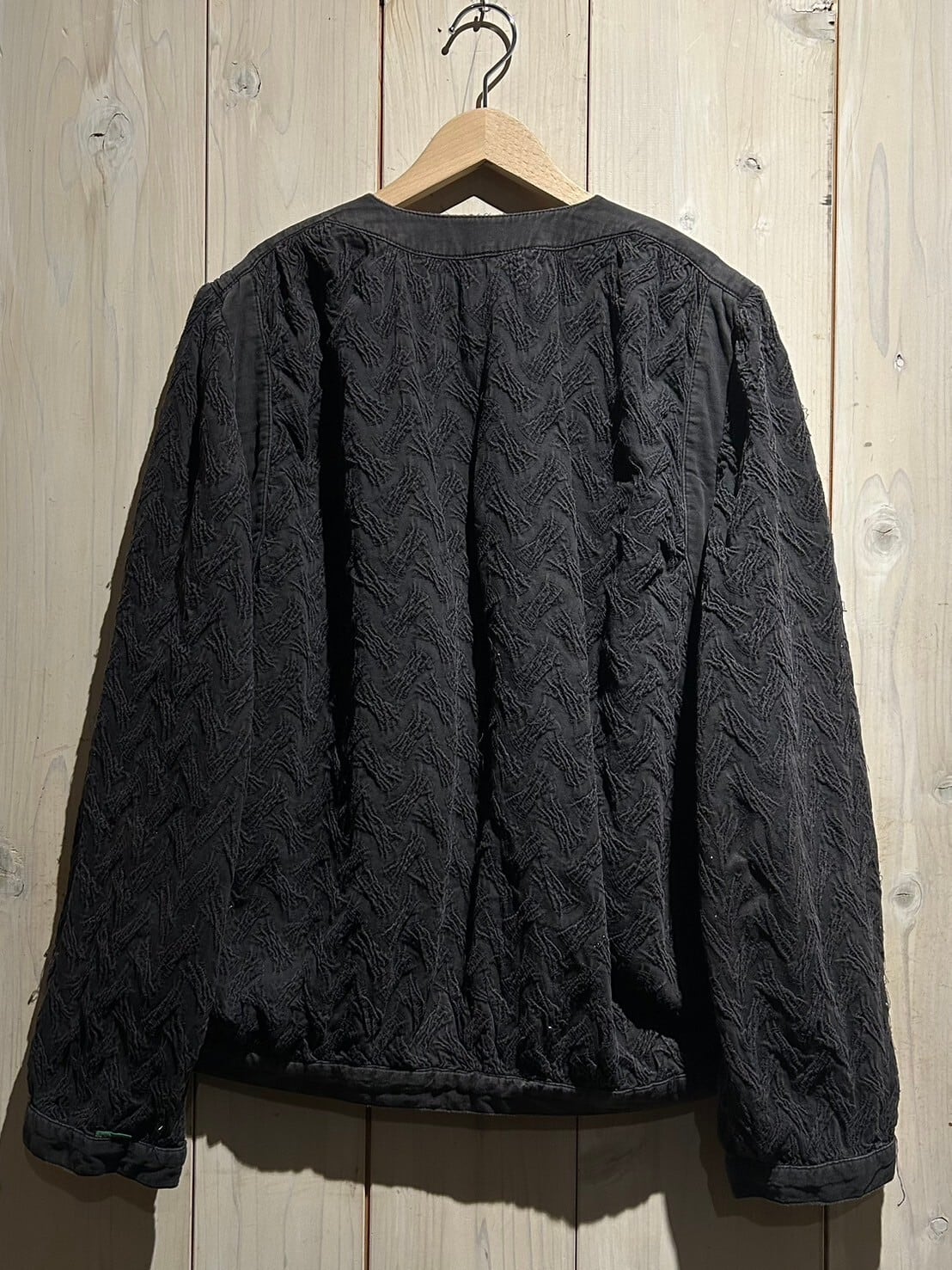 フェード感のあるコットンを用いたボディにシャーリング加工を施し、柄模様を載せたコットンジャケット。