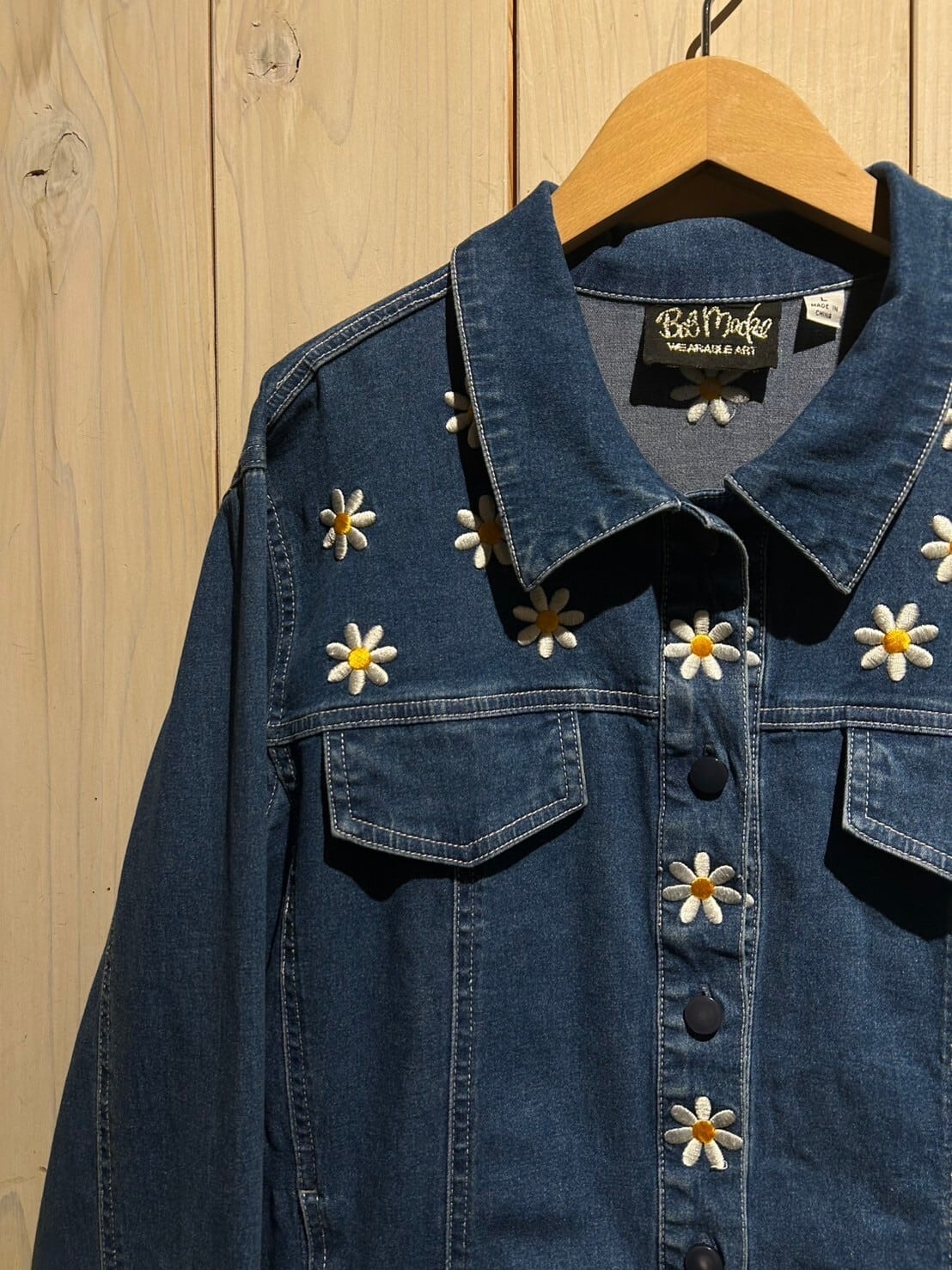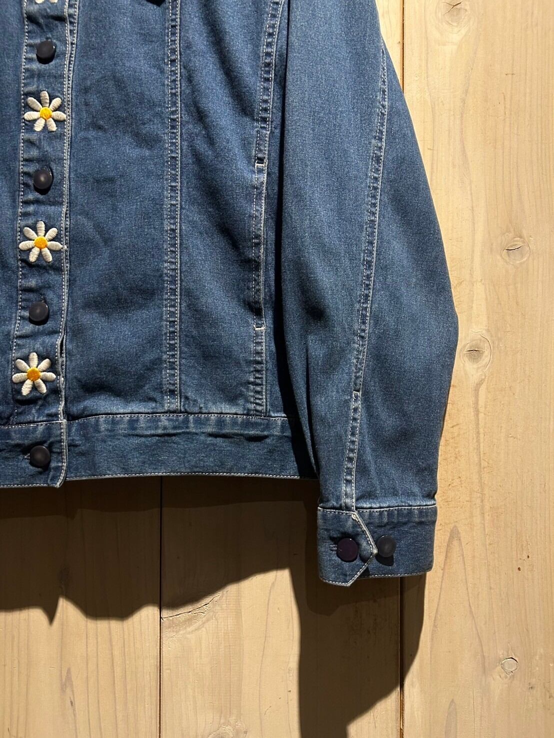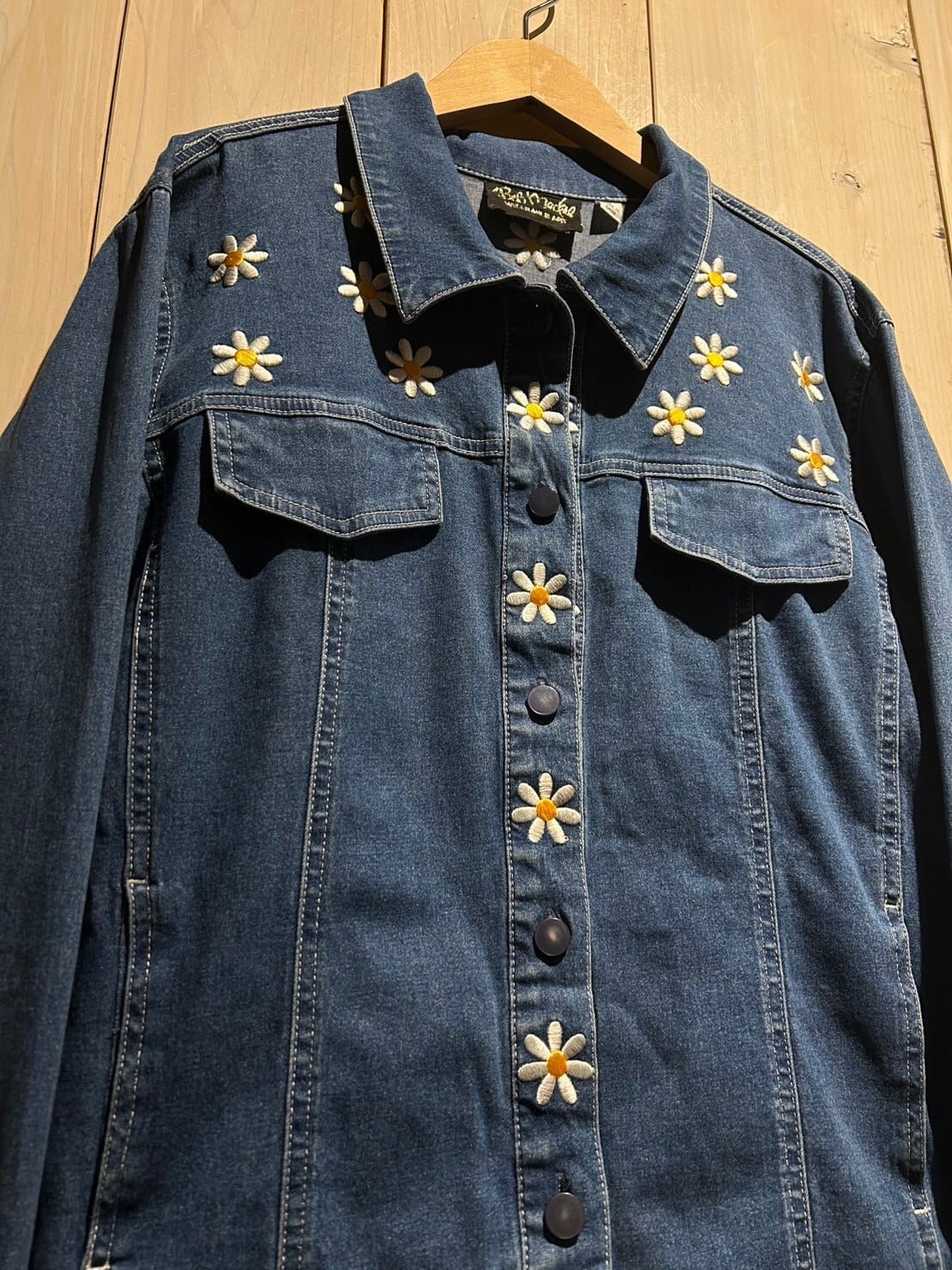 インディゴブルーのデニムジャケットに、レトロな雰囲気を漂わせる花の刺繍を刻んだ1着です。