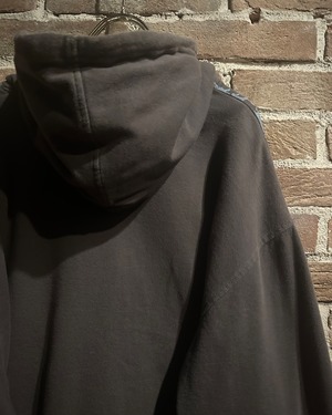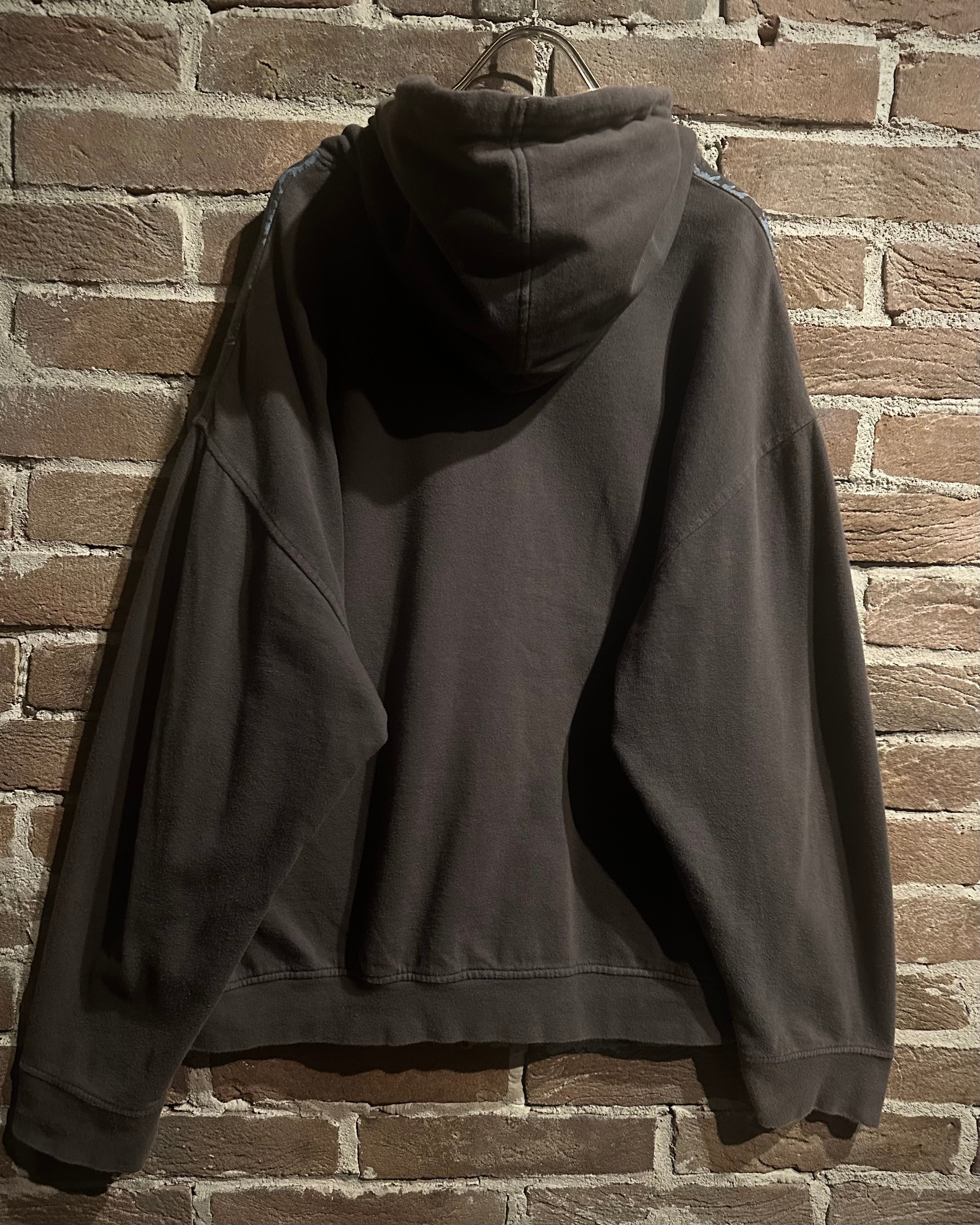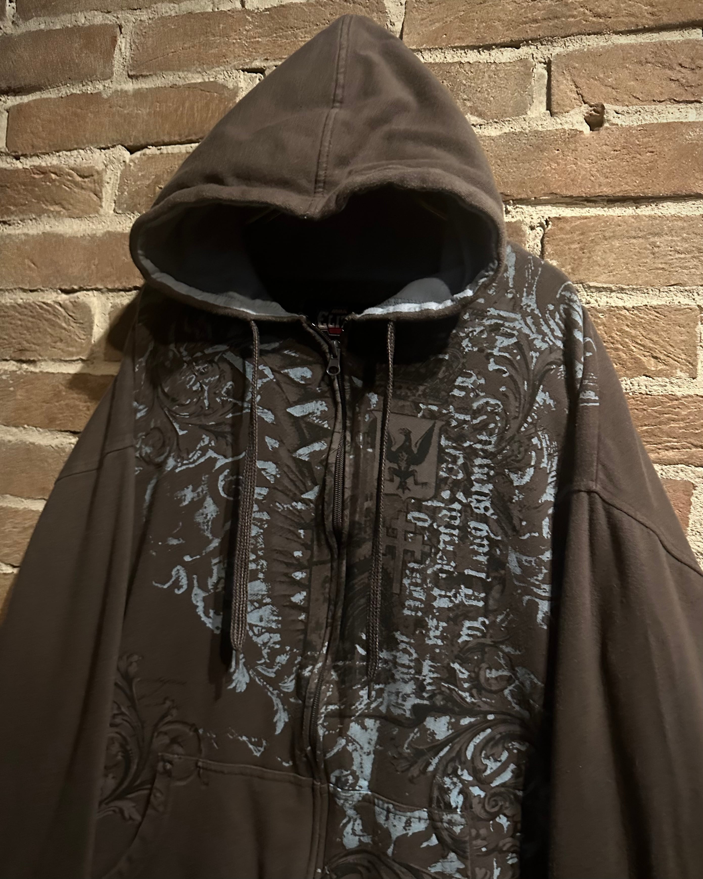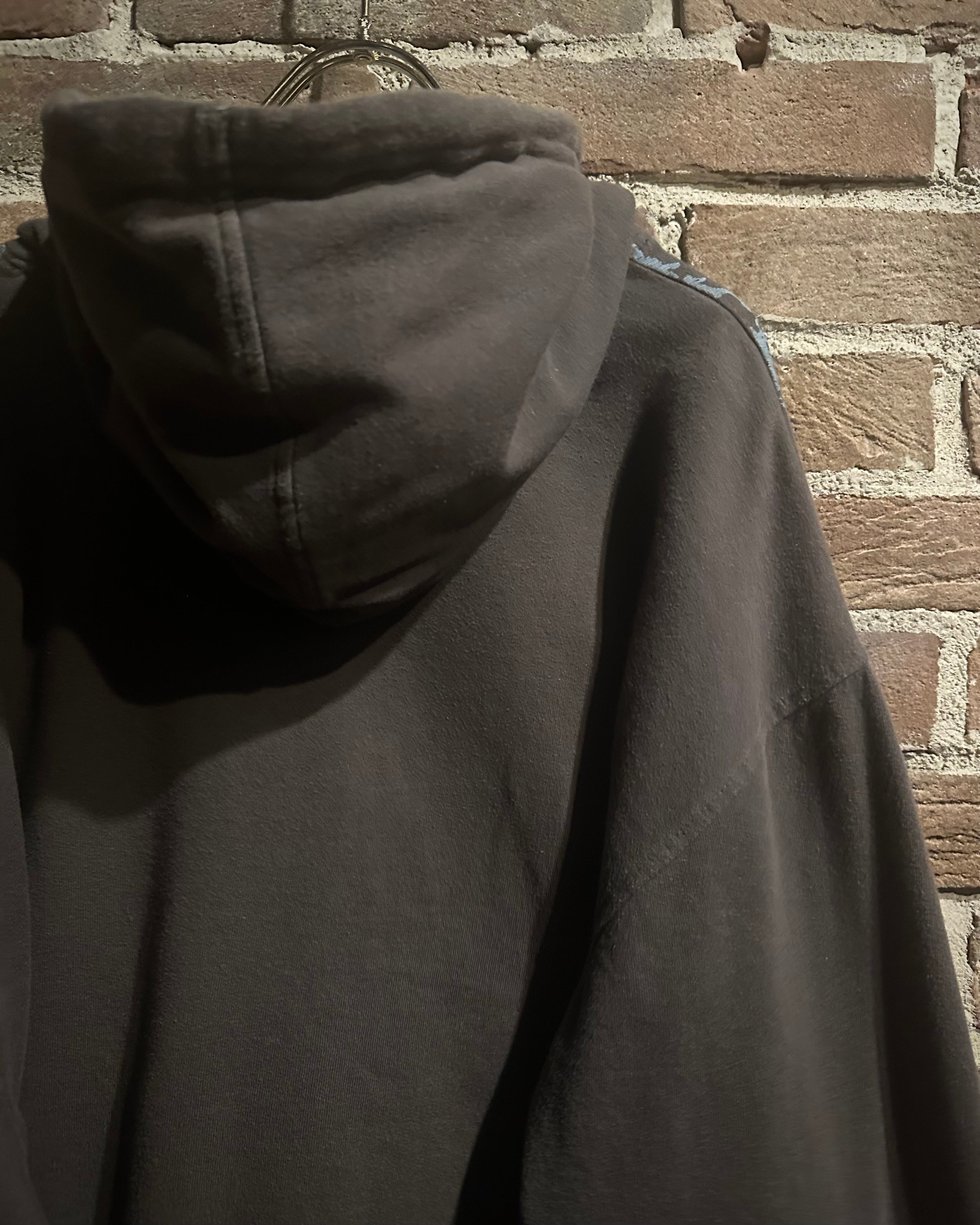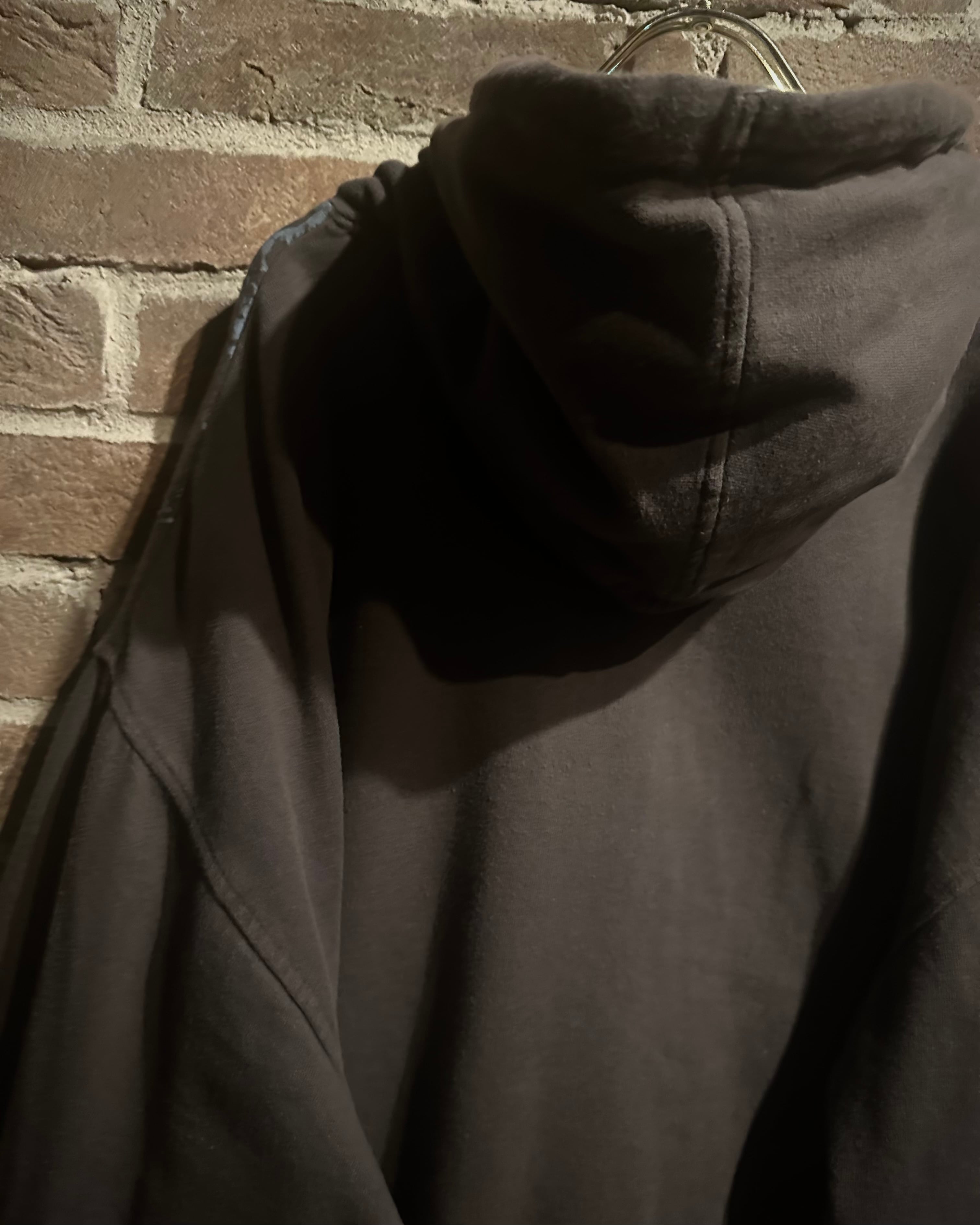 ブラウンのボディをベースに、レタリング、ゴシックなデザインを載せたジップアップフーディ。
