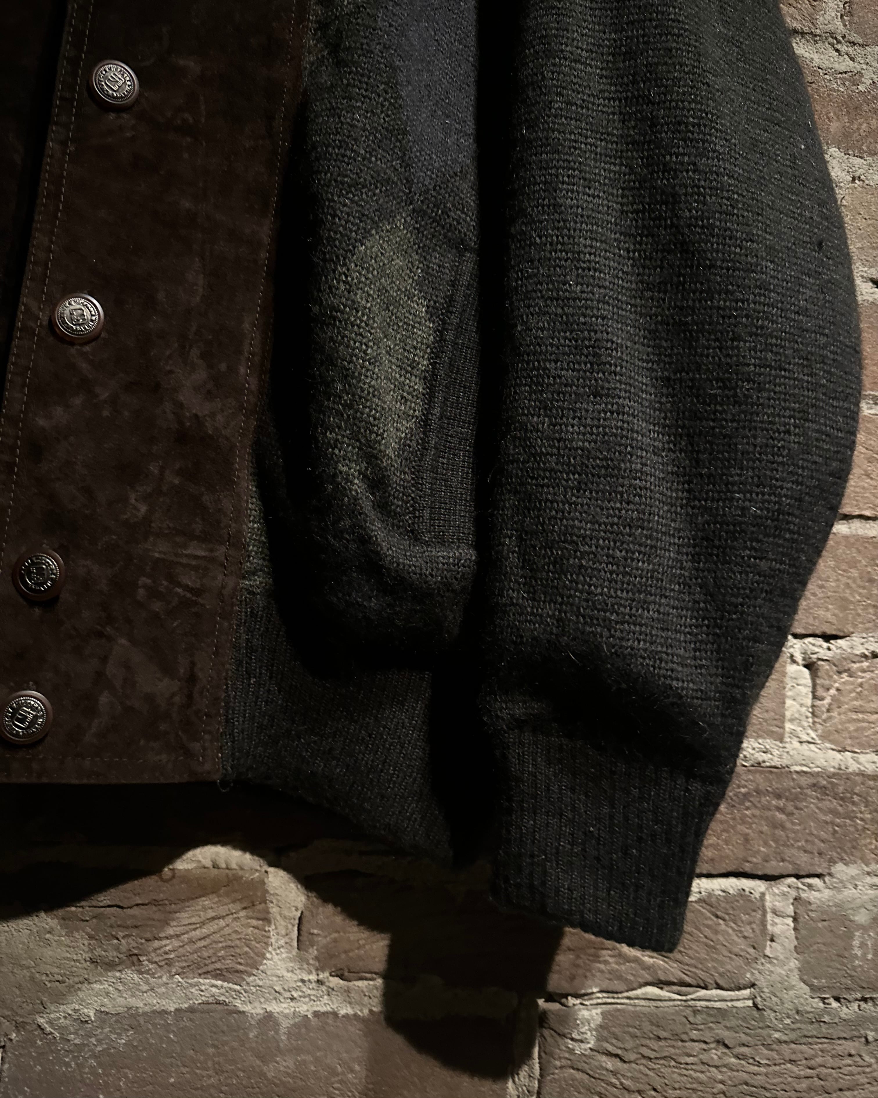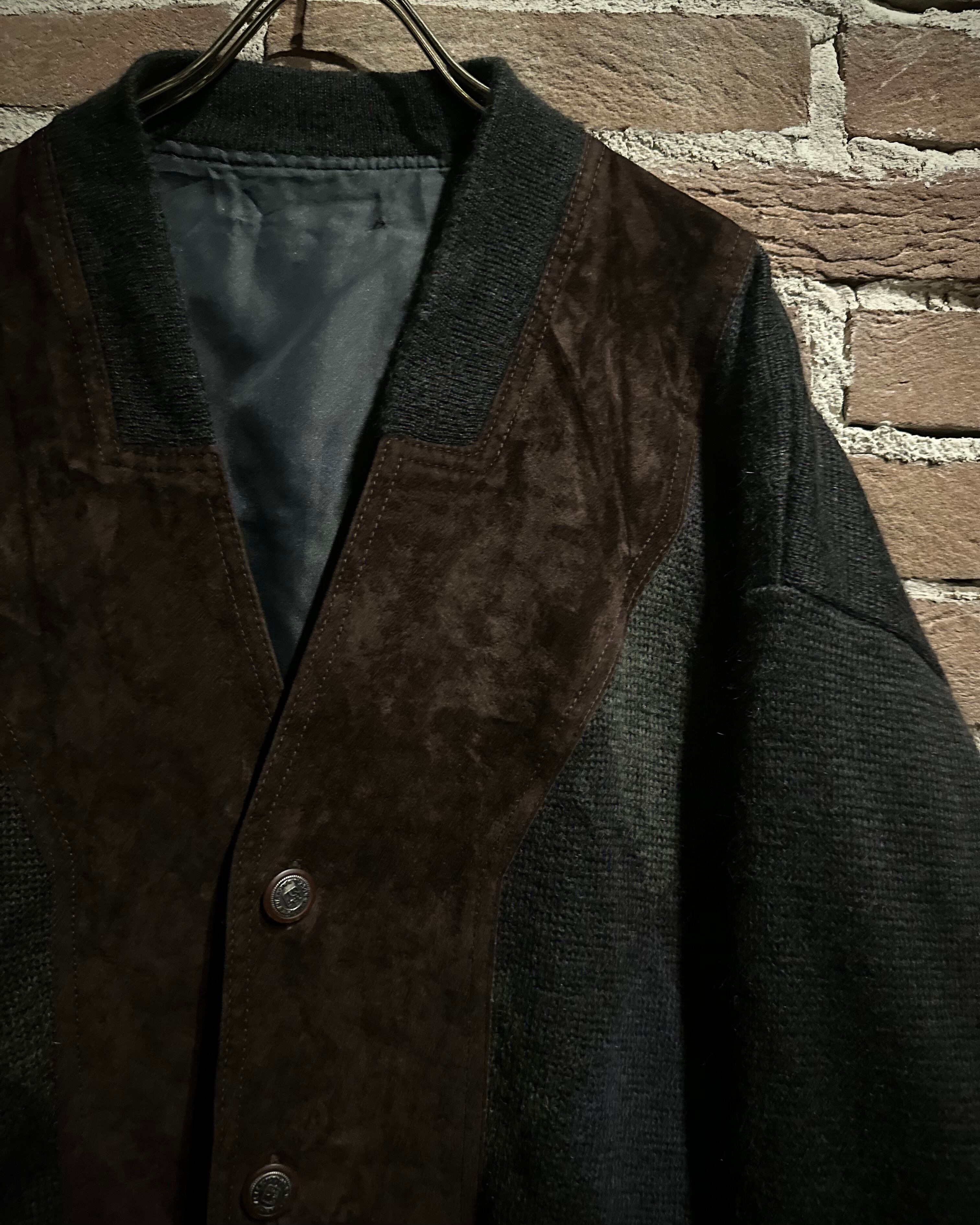 スエードレザーの起毛感、ニットの柔らかさがマッチした温かみのある雰囲気が堪りません、、、フロントのデザインが施されたボタン使いも◎