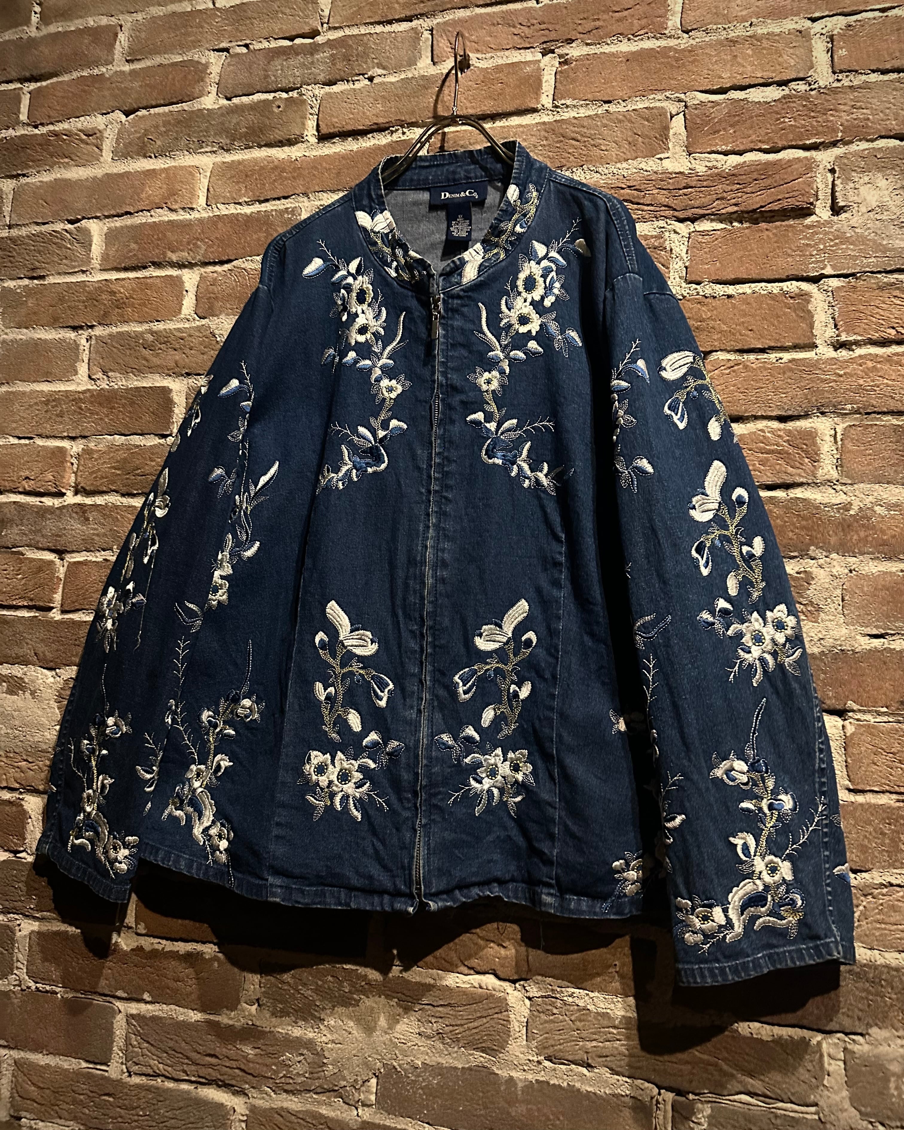 コンディション良好なブルーデニムをベースとし、ボディ全体に気品のあるホワイトで花柄刺繍を散りばめたジップアップデニムジャケット。