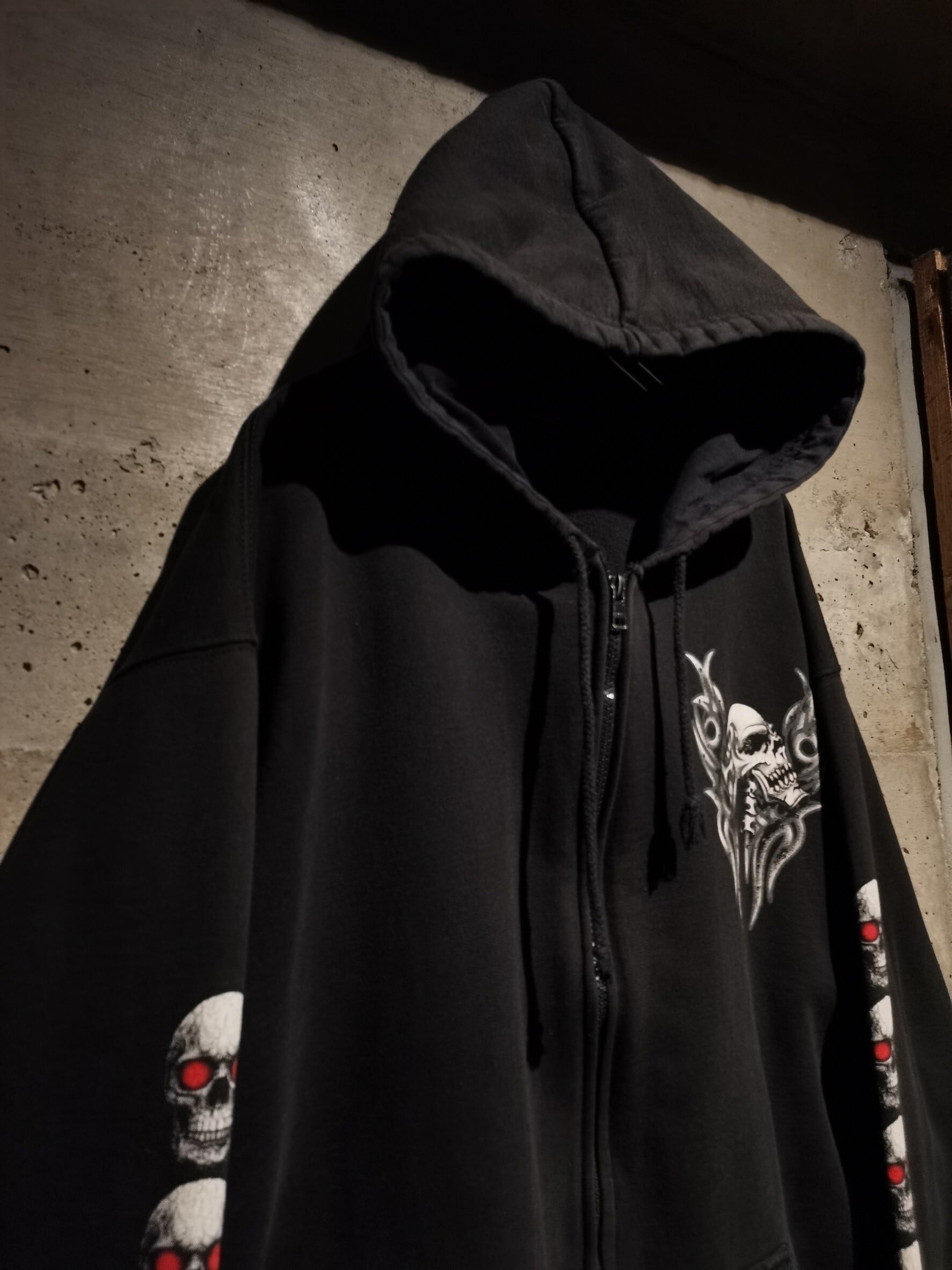 フェード感の良いブラックのボディをベースに、ゴシックな雰囲気漂うスカルをプリントしたジップアップフーディ。