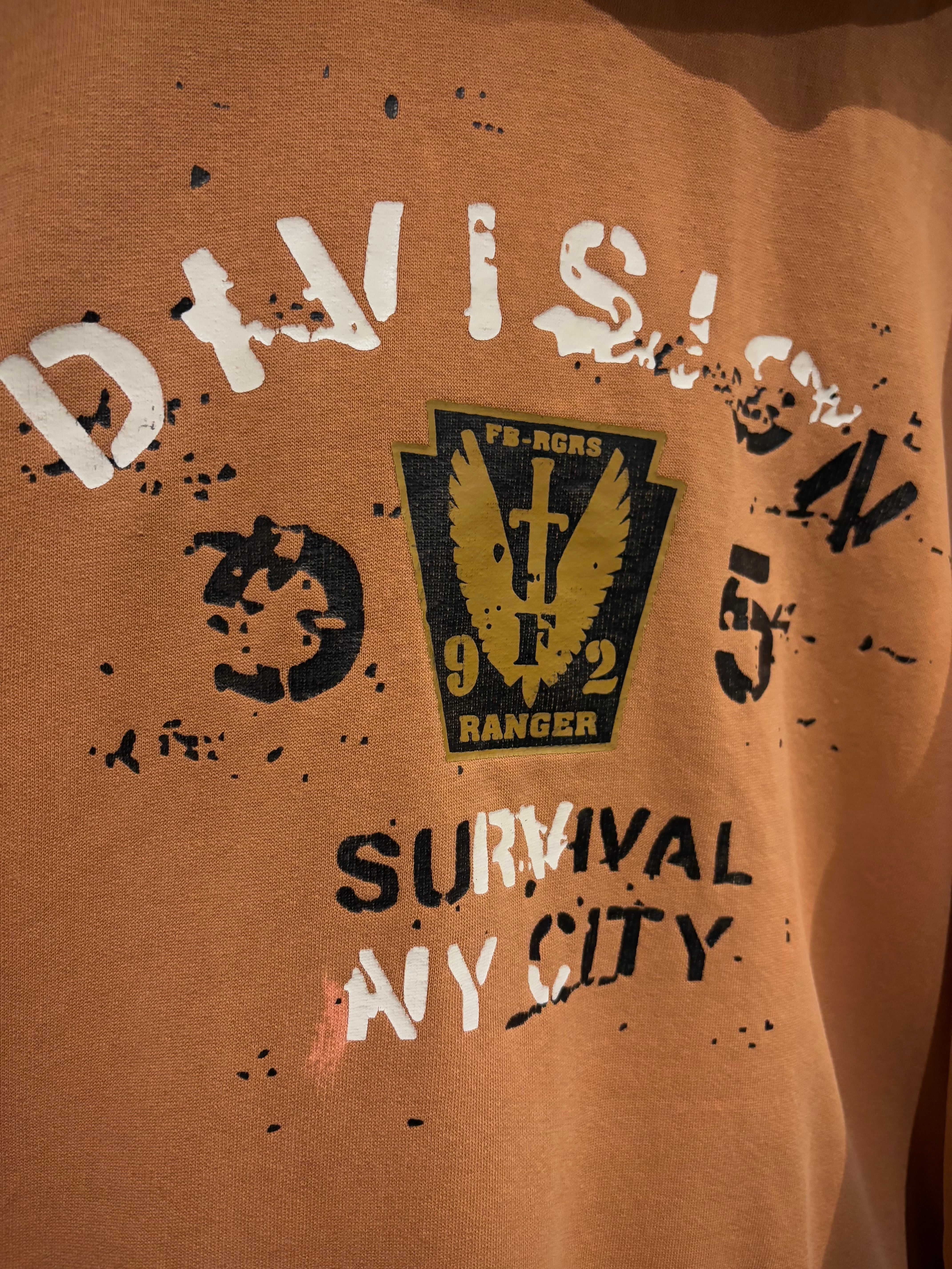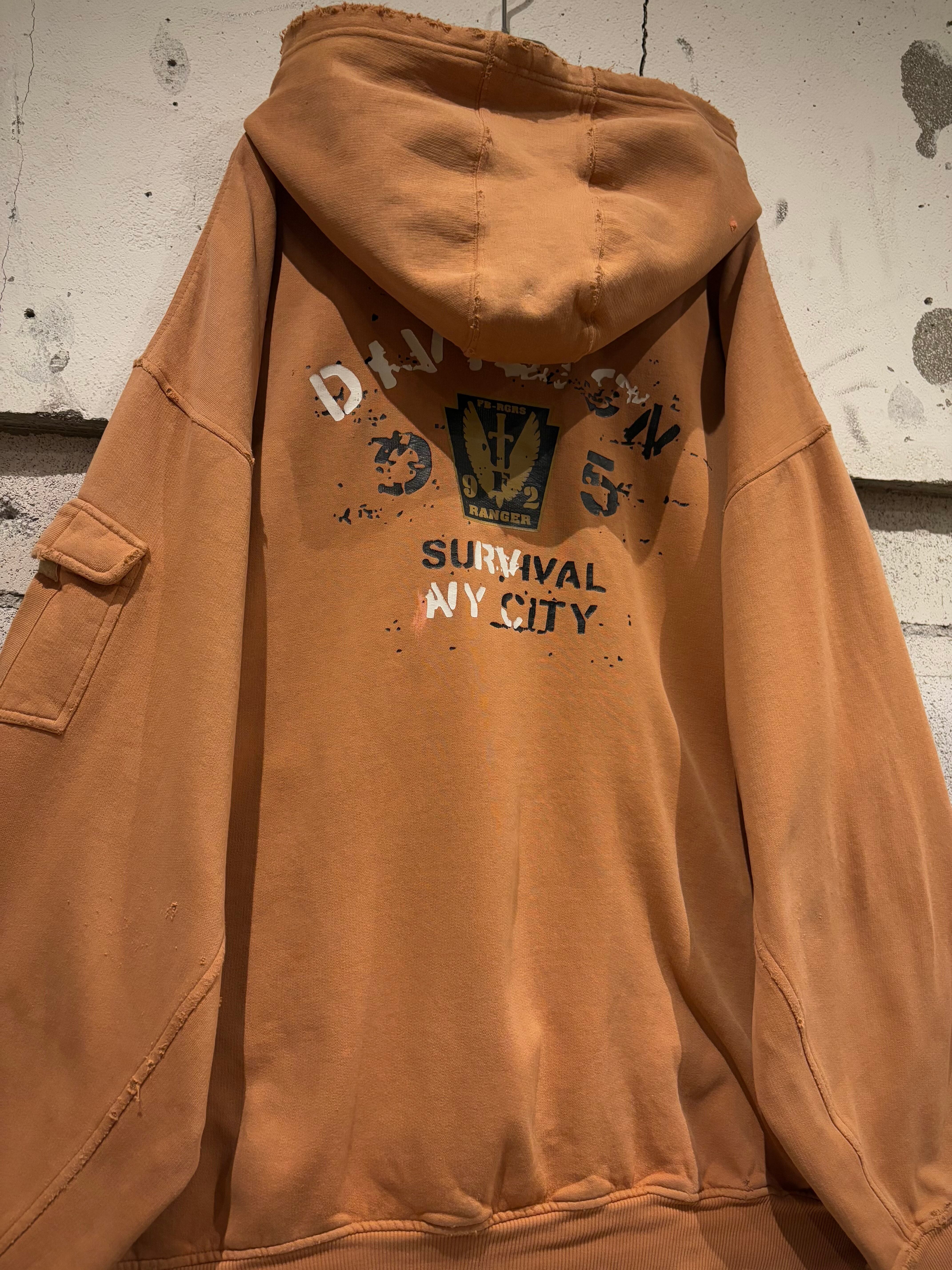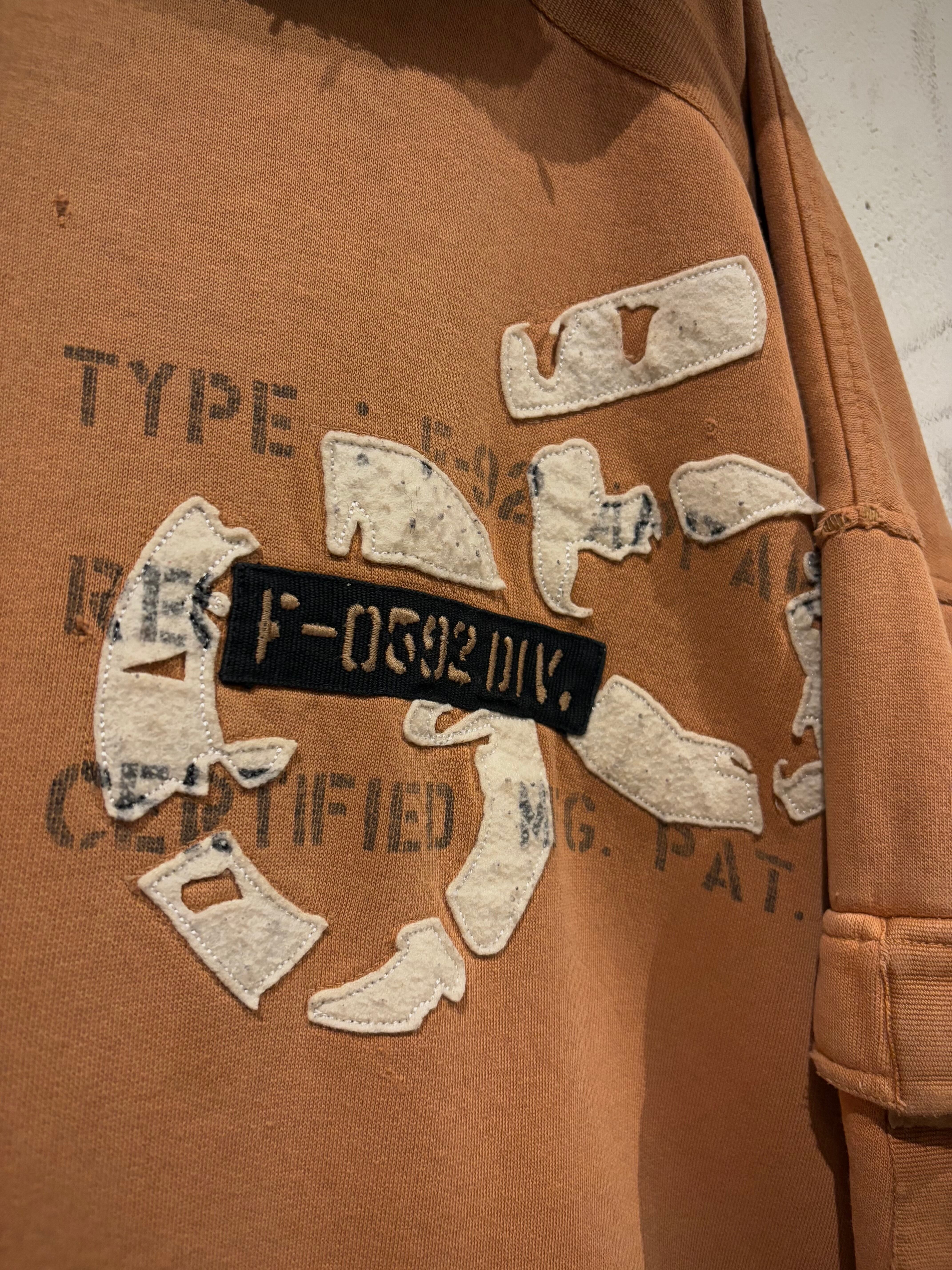 肉感のあるオレンジのボディに、ワッペンやプリントでデザインが載せられたプルオーバーフーディ。