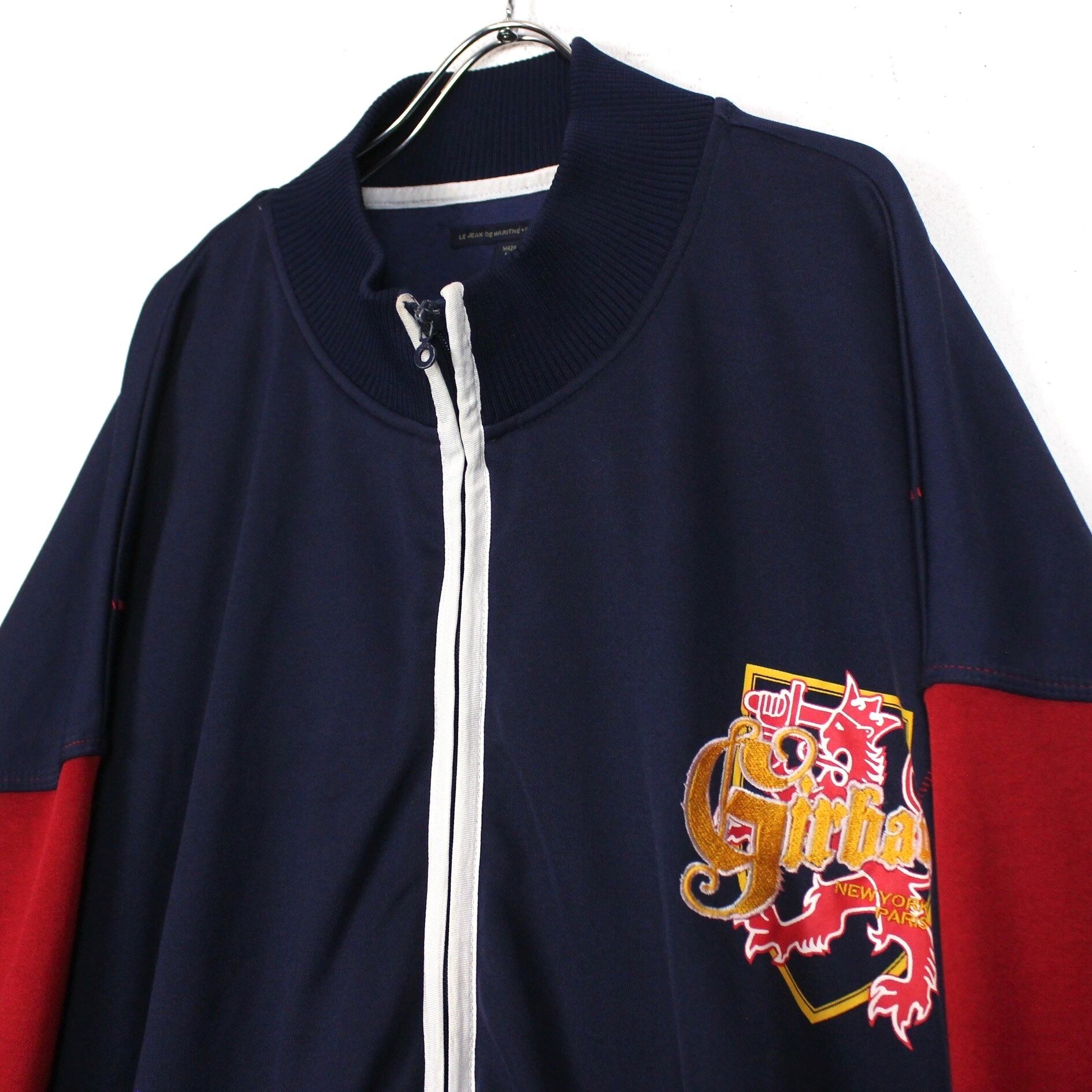 ネイビー×赤を切り替えたボディに、左胸にはエンブレムのデザイン、背面にはブランドネームをプリントした、シンプルながら存在感を抜群に放つトラックジャケット。
