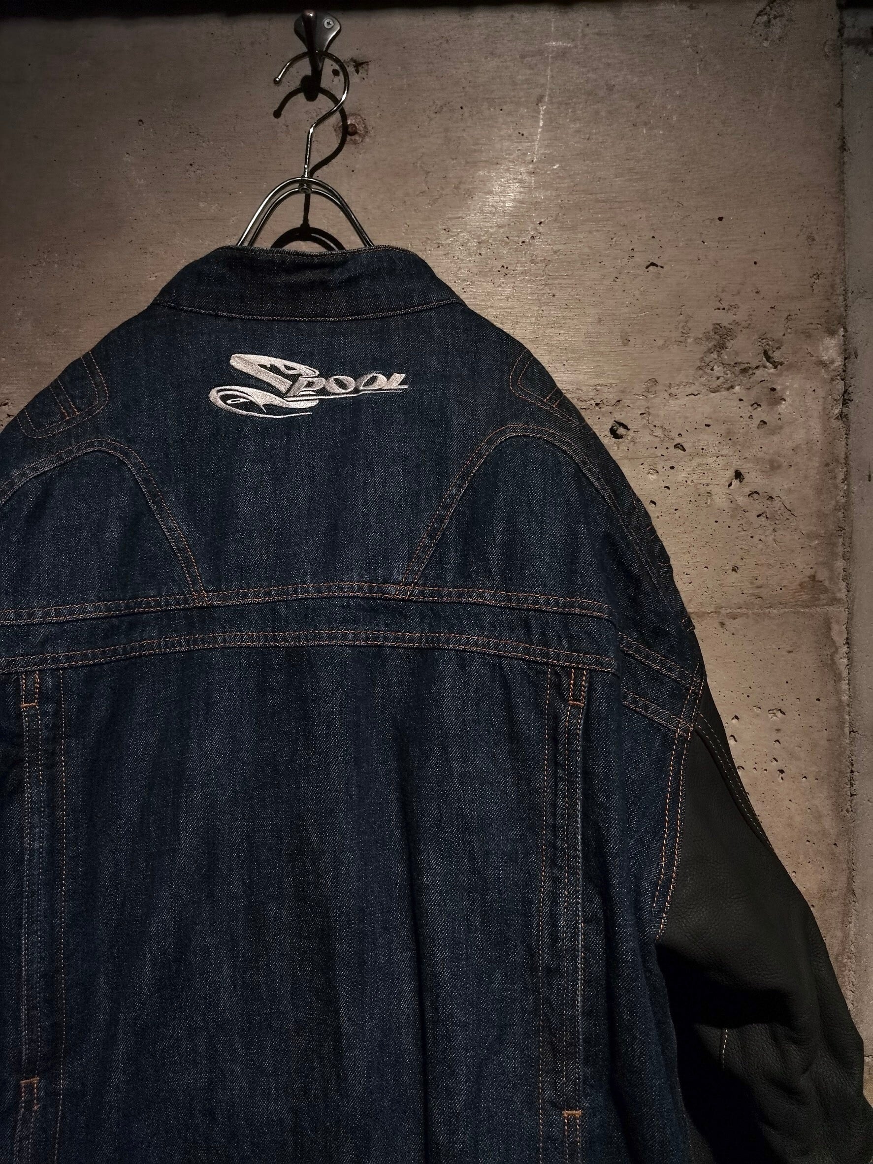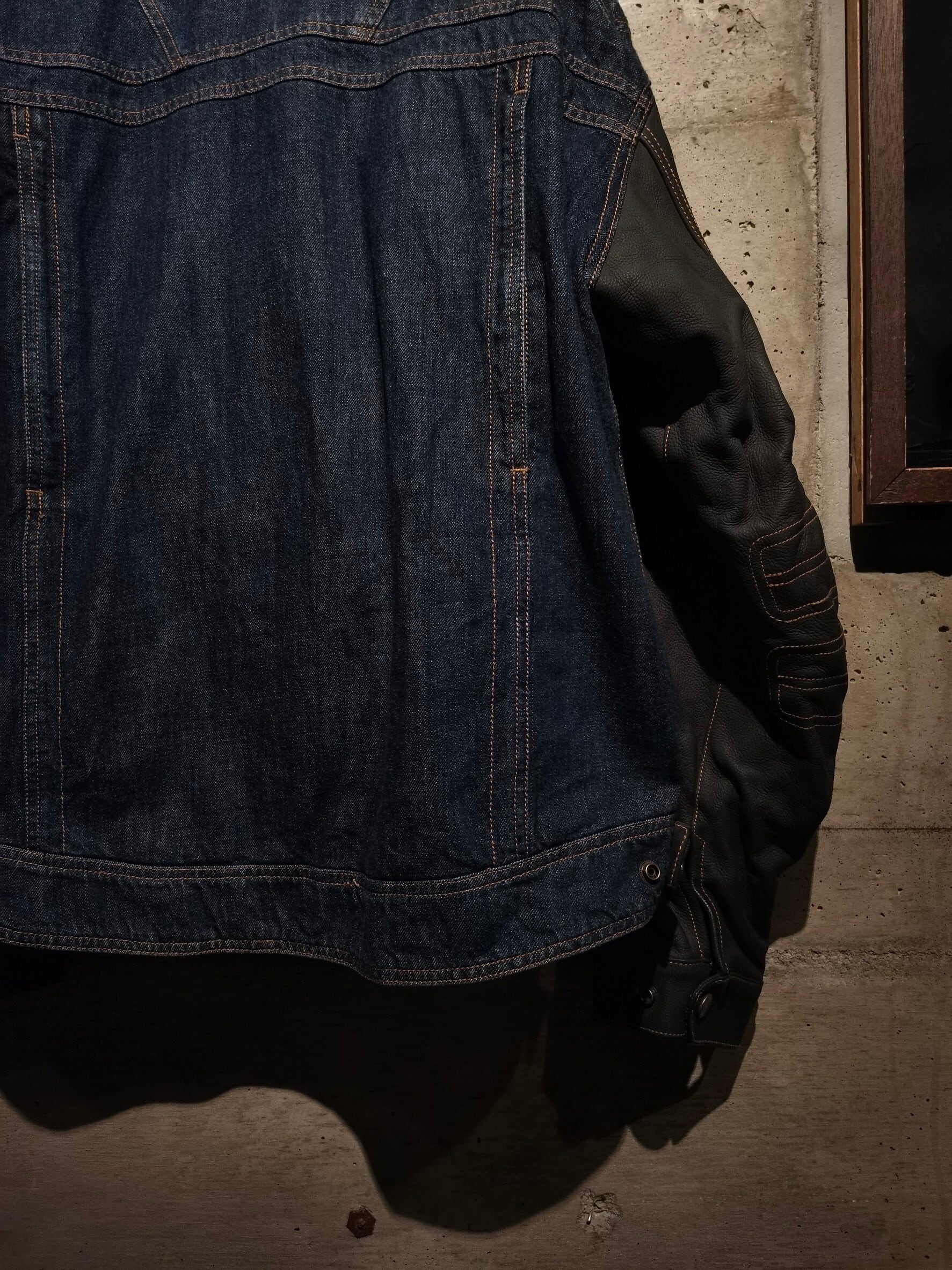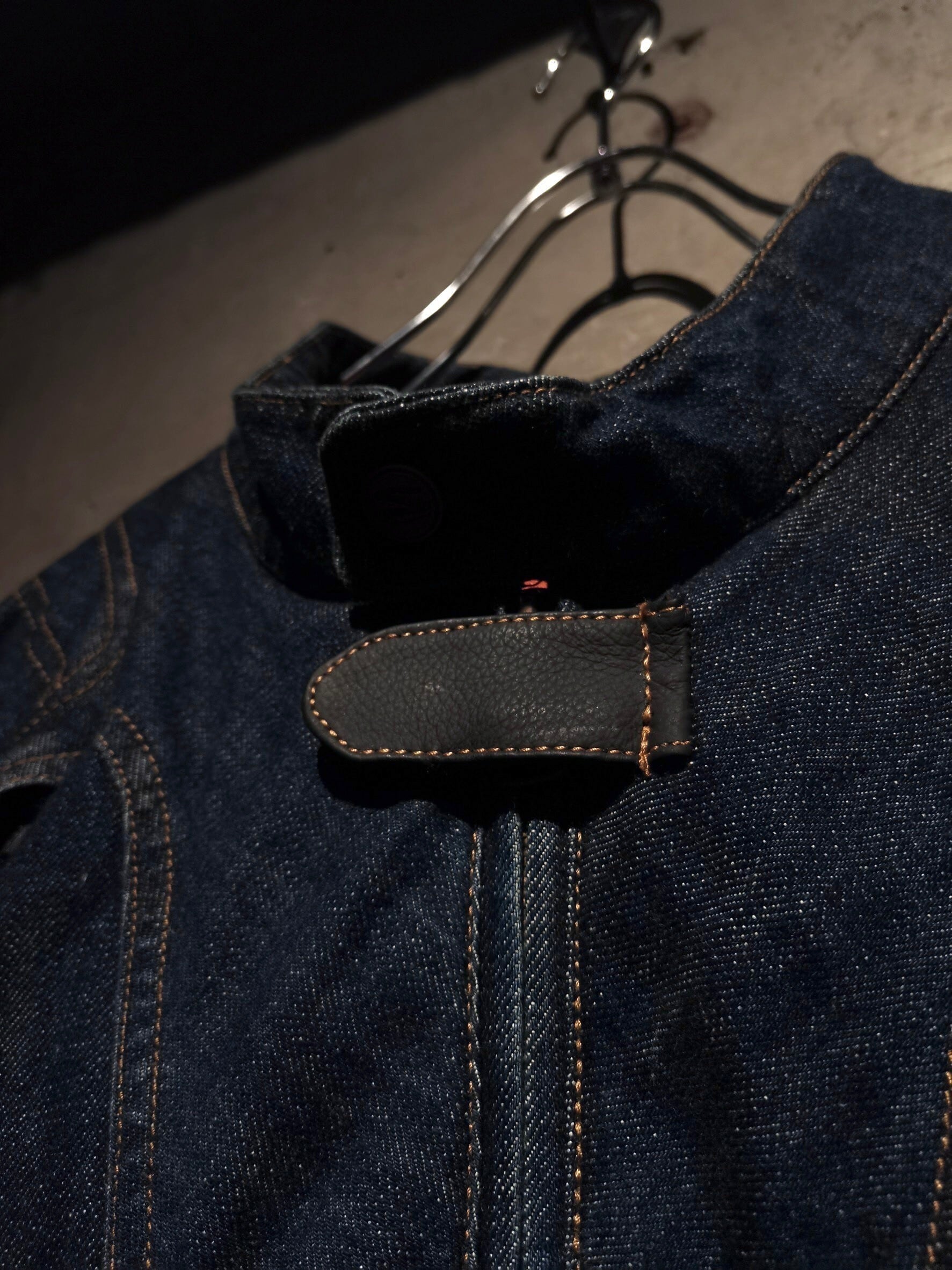 濃いインディゴのデニム素材をベースに、アームにはラバーの切り替えを施したレーシングジャケット。