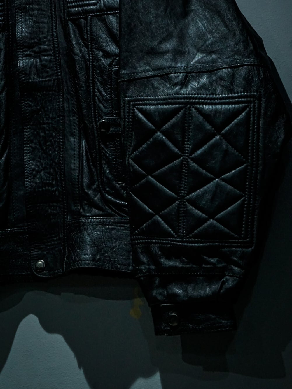 柔らかくしっとりした上質なブラックレザーを用いた逸品。両胸、アーム、ポケット口には中綿を入れステッチを施したキルティングのようなデザインを施したレザージャケット。