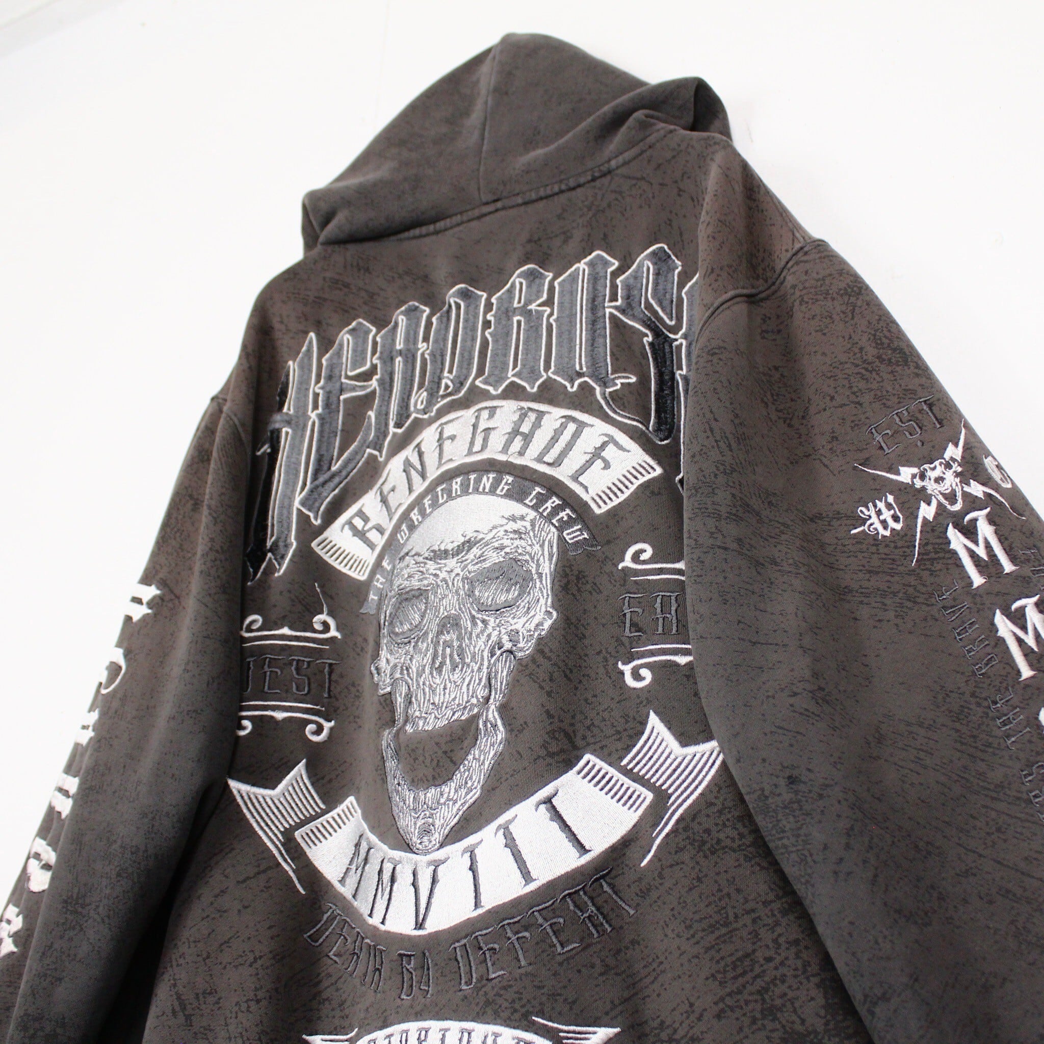 ブラウンのボディをベースに、スレ感を表現したデザイン、そしてゴシック調の刺繍を刻んだ稀有なジップアップフーディ。