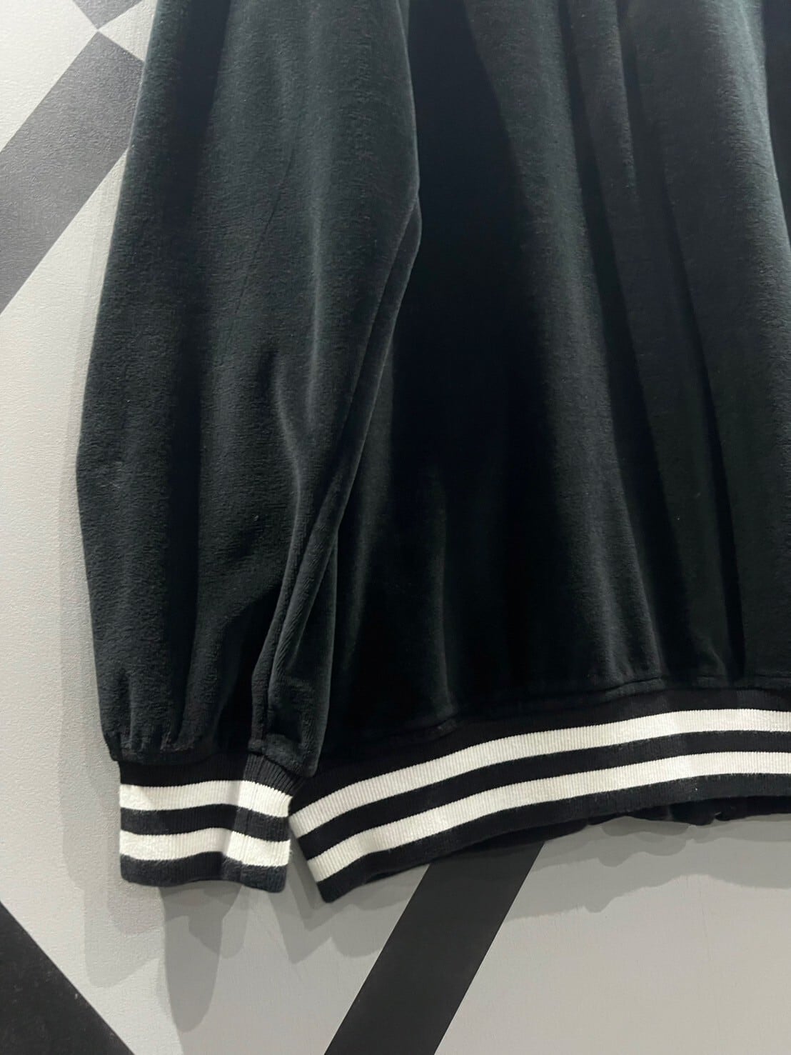 美しいドレープ感と光沢を持つベロア素材に中央に"G Unit"のロゴを配り、リブや首元には白のボーダーを配置、絶妙な白黒のバランスが素晴らしい。