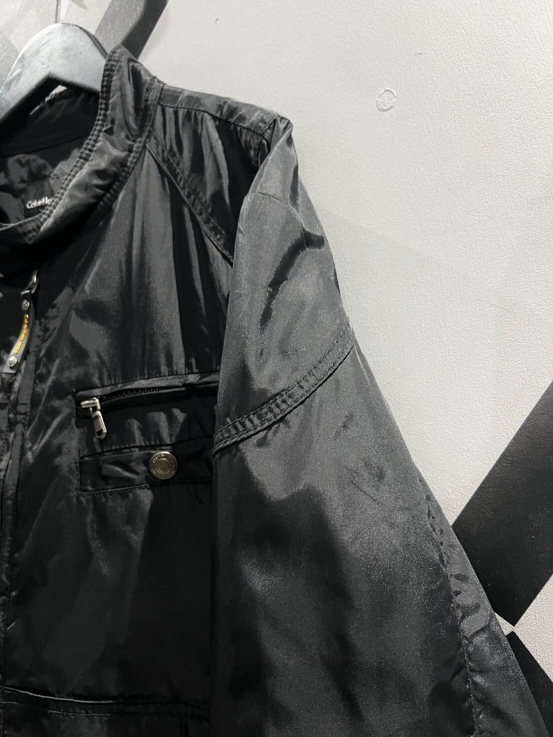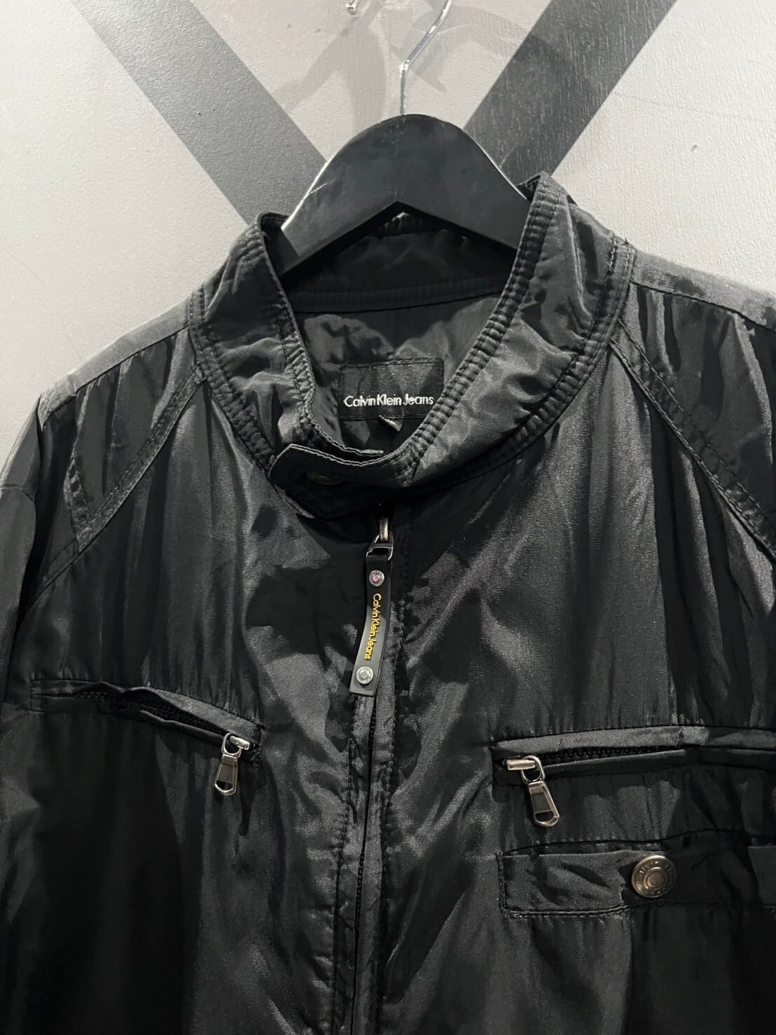 サラッとしたブラックのポリ素材をベースに、両サイドにはスラッシュポケットを配し、両胸に逆八の字ポケットを施したジャケット。