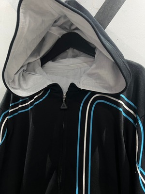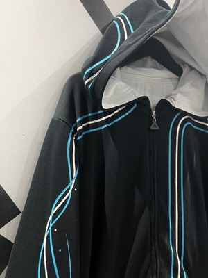 ブラックのスウェットボディをベースに、フード、フロントからバックにかけて、アームにまでアーティスティックなラインのプリントを載せたジップフーディー。