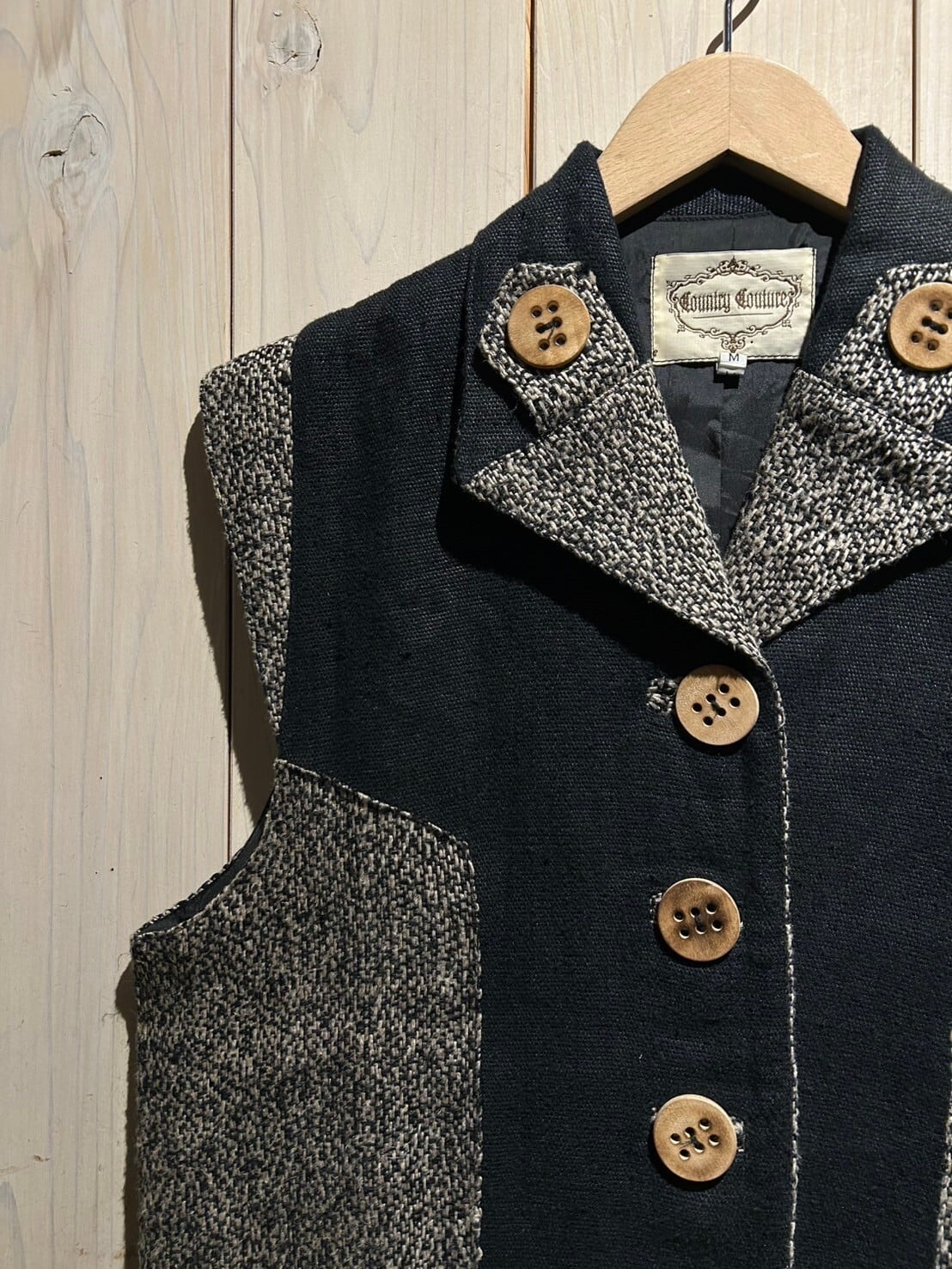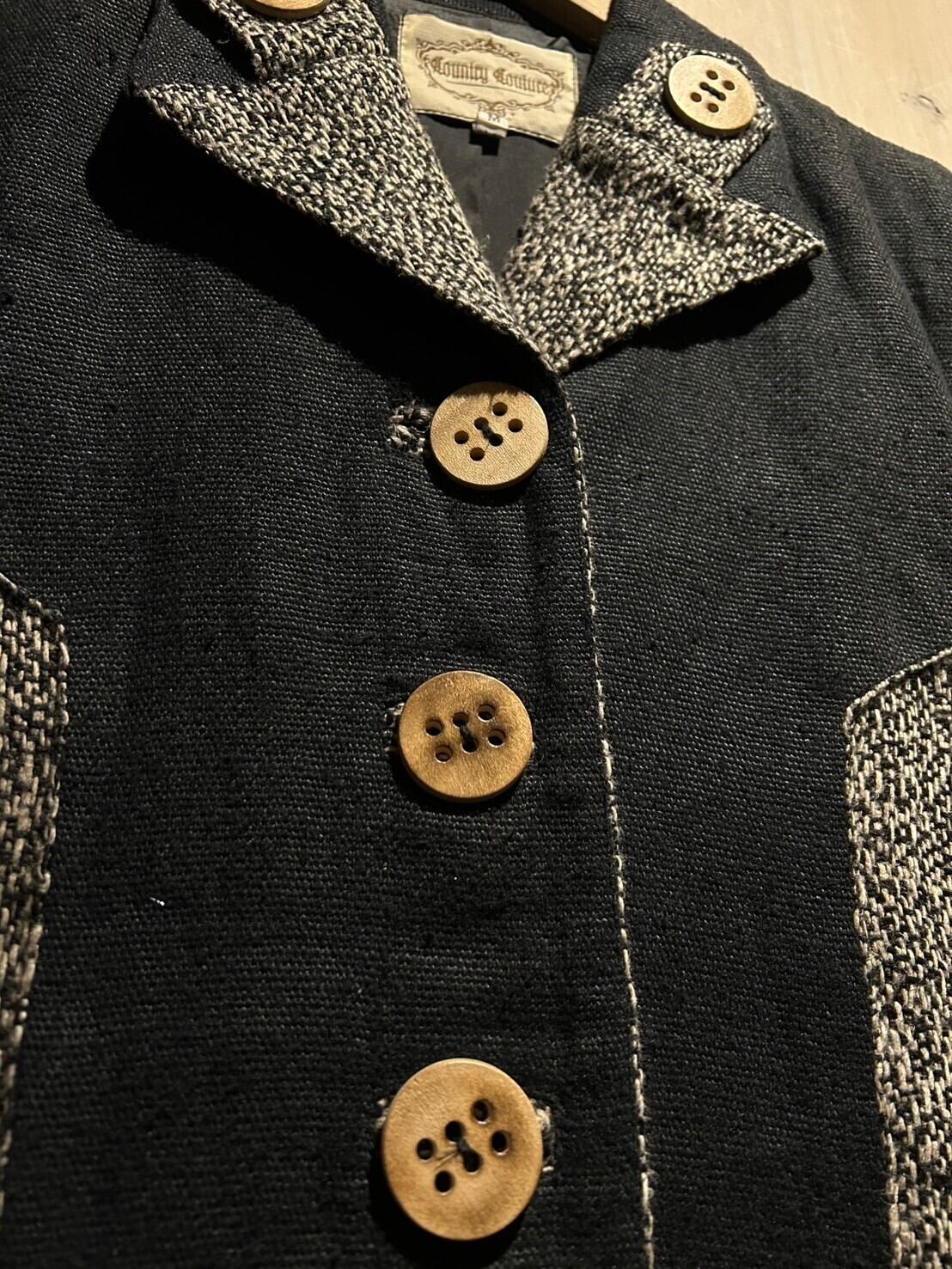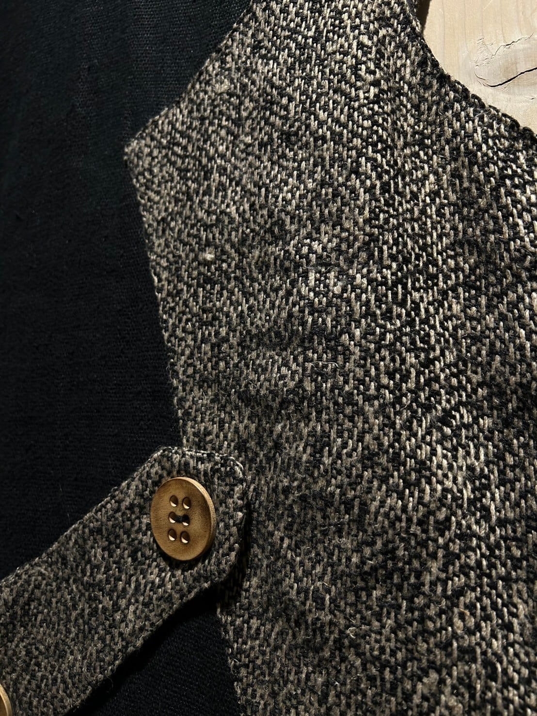 白と黒の糸を編み込み、ブラックのリネンを切り替え、さらに大ぶりなウッドボタンをあしらったデザインの1着。どこか民族チックな雰囲気を感じます。
