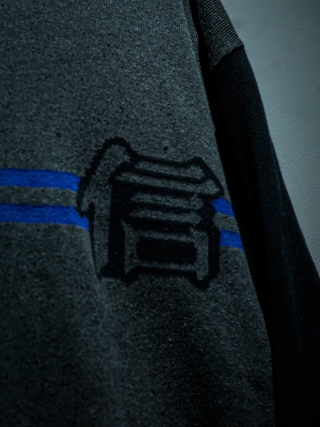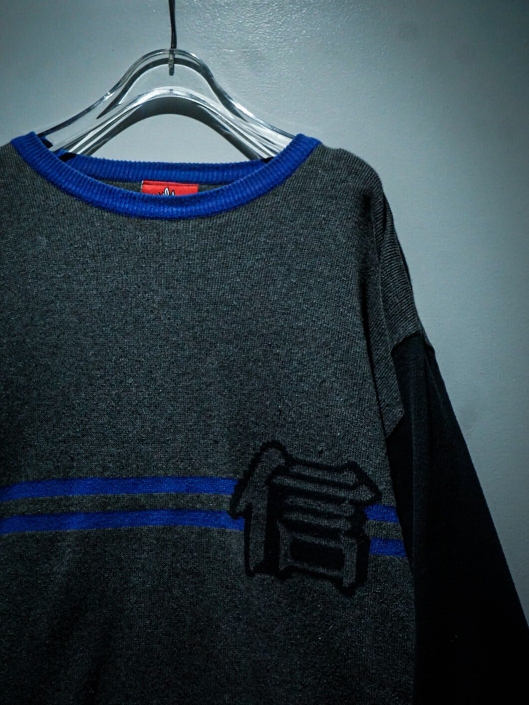 グレーのボディをベースに、アームにはブラックの切り替え、随所にブルーのライン切り替えを施したプルオーバーニット。