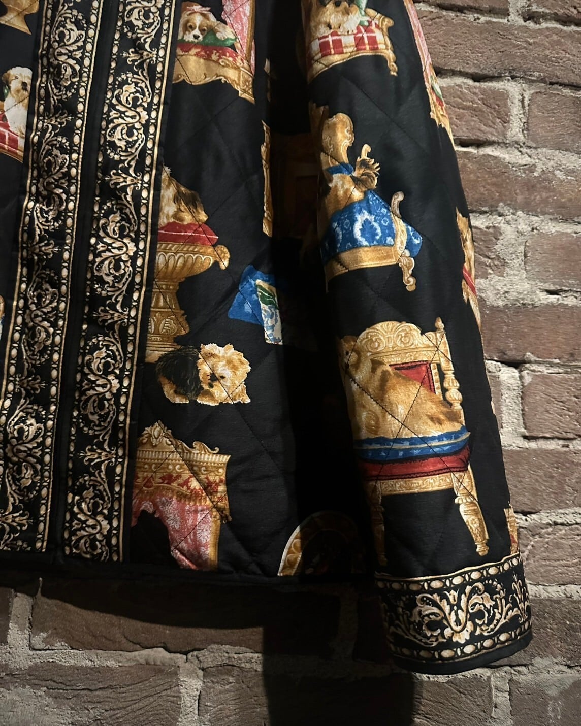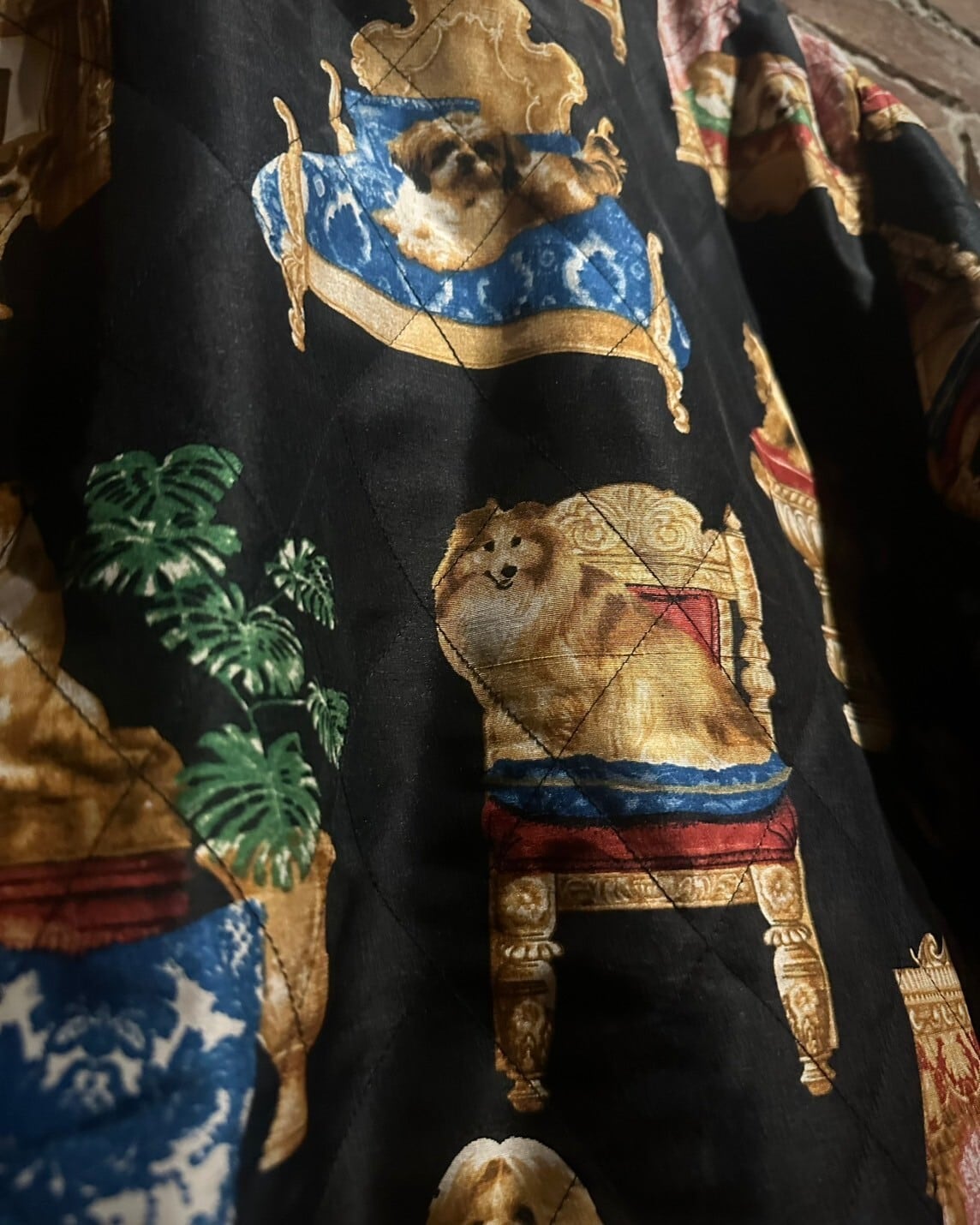 しっとりした肌触りにトロみを含んだ"極上"シルクを使用し、全面にお金持ちなワンちゃんたちの柄を散りばめたシルクジャケット。