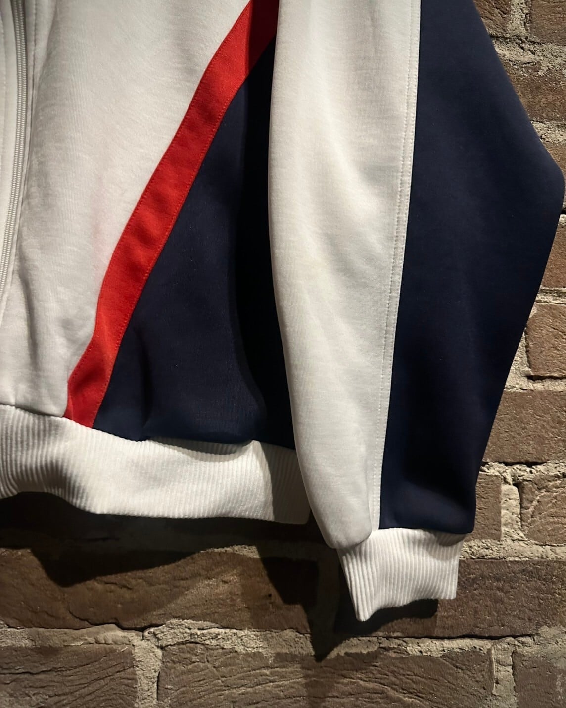 ホワイト、ネイビー、レッドのトリコロールカラーで成る切り替えデザインが光り輝くトラックジャケット。胸元にはトレフォイルロゴ刺繍、肩から袖途中にかけて同ブランドのシグネチャーでもある3本ラインを配置した逸品。