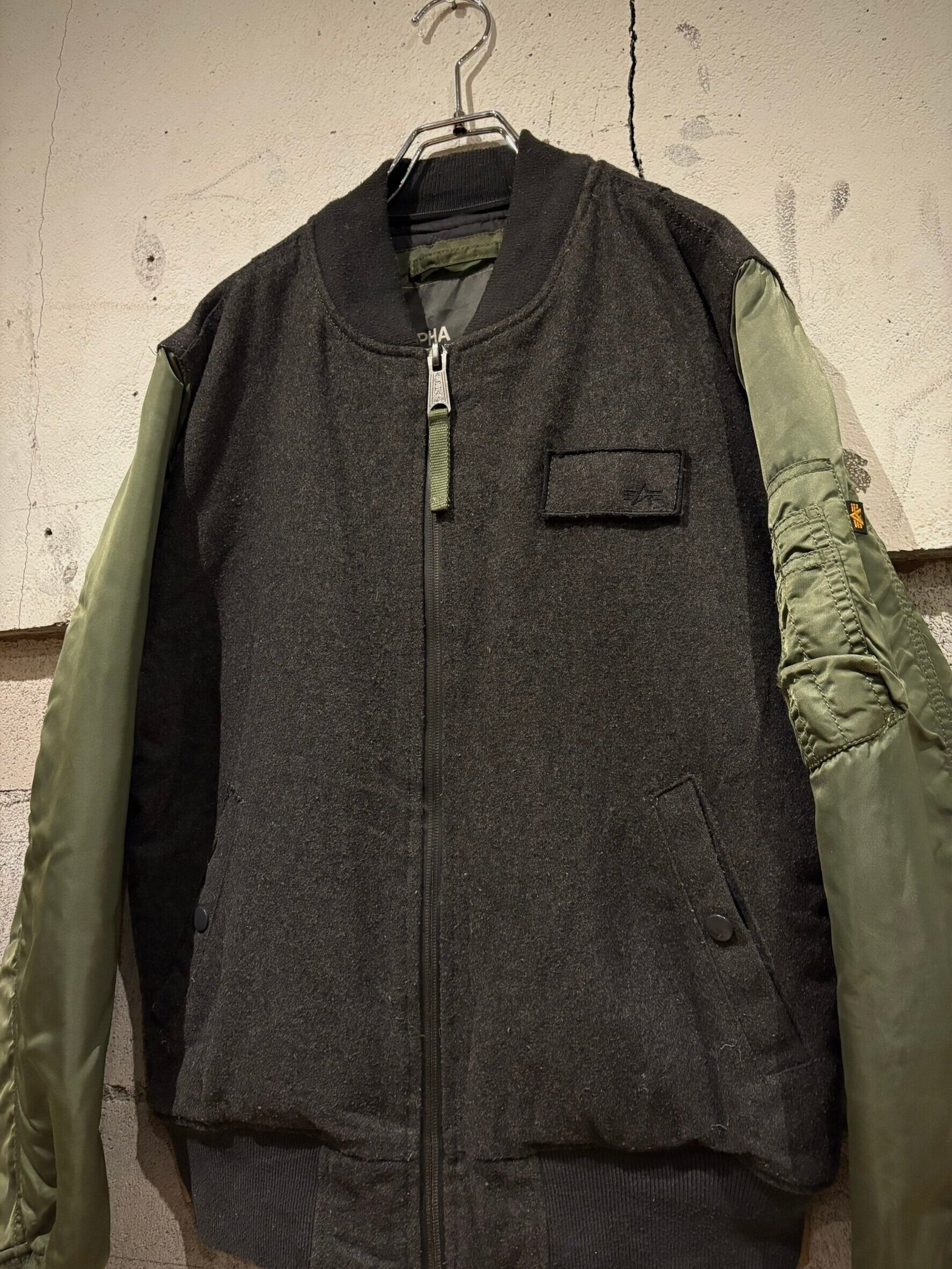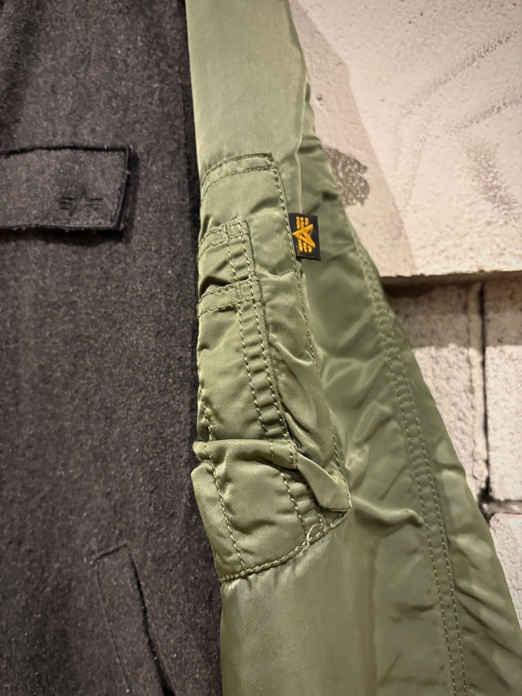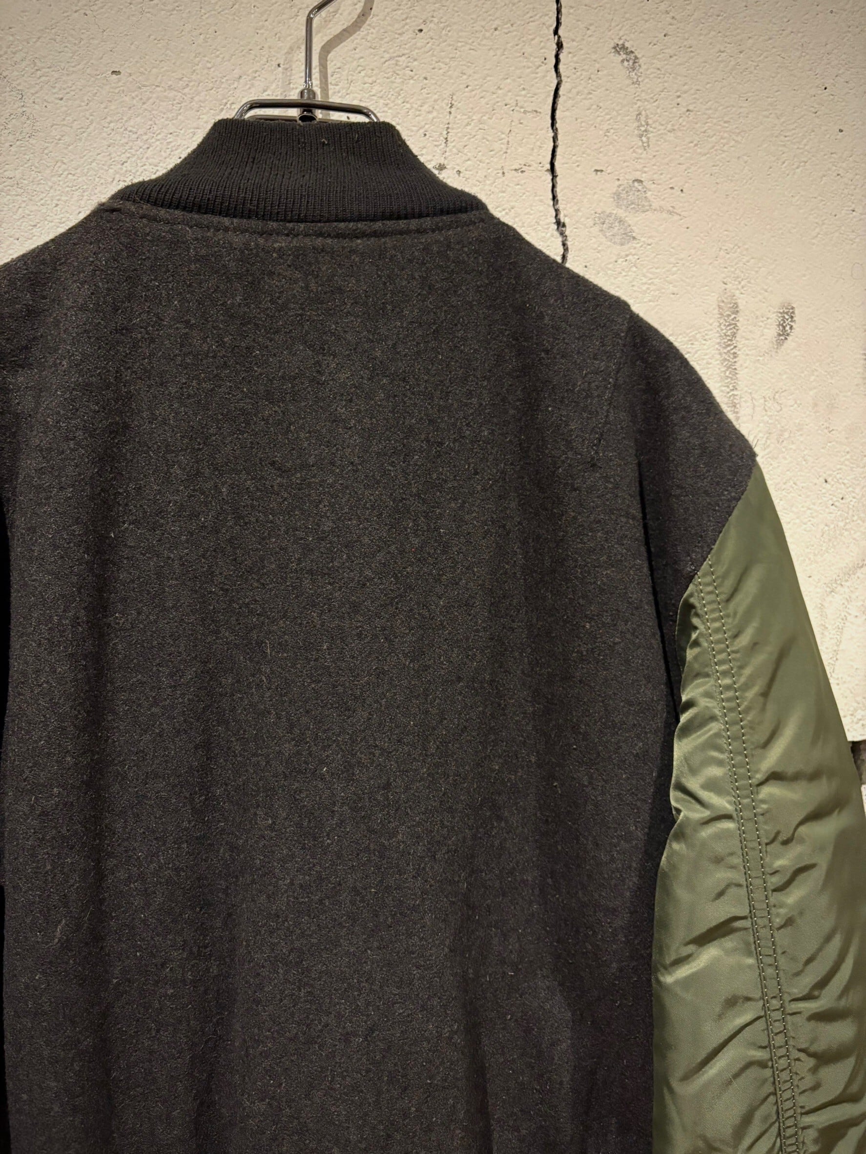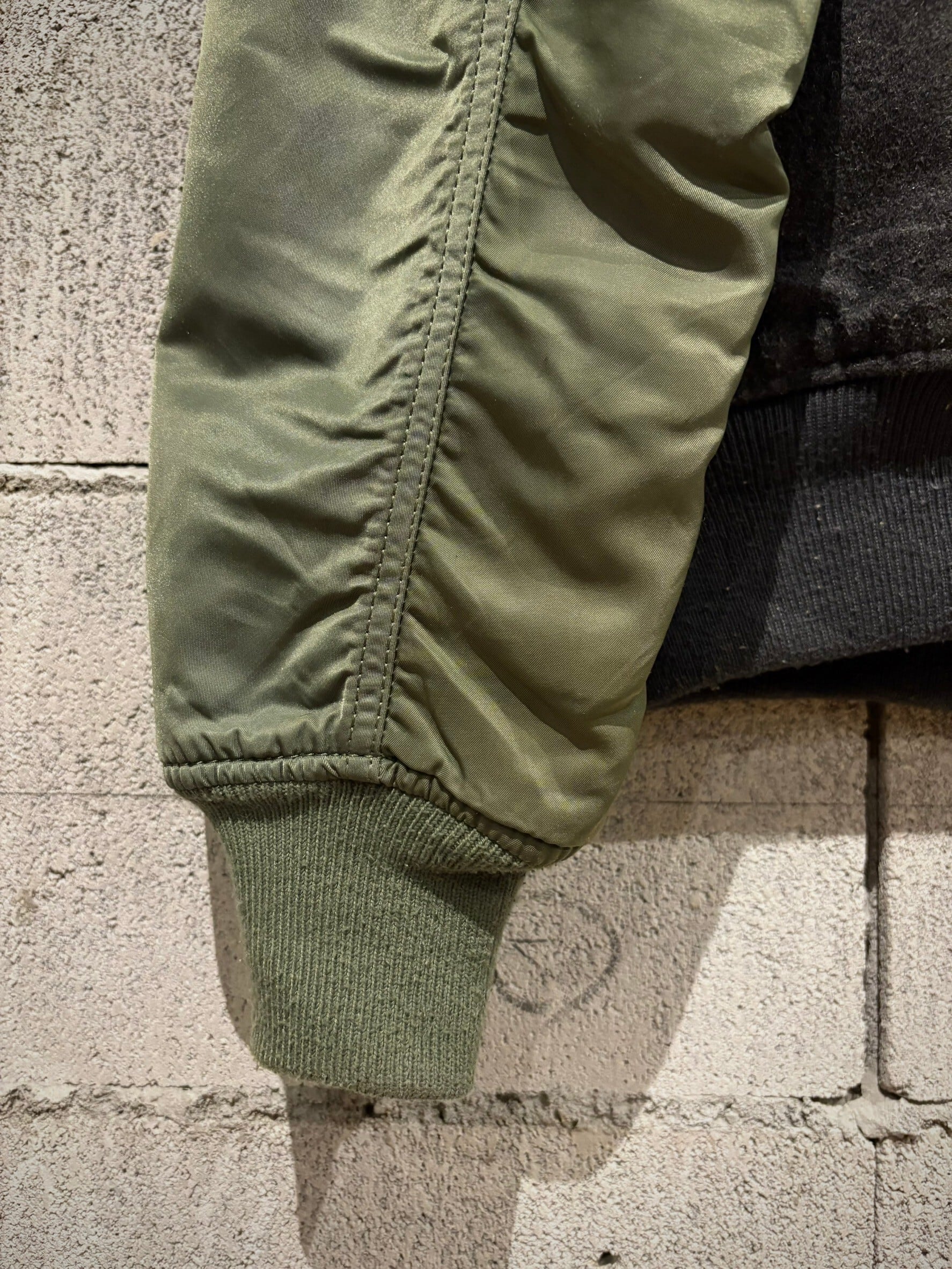 ツルッと光沢のあるセージグリーンのアームに、ボディを目の詰まったウール生地で切り替えたMA-1。