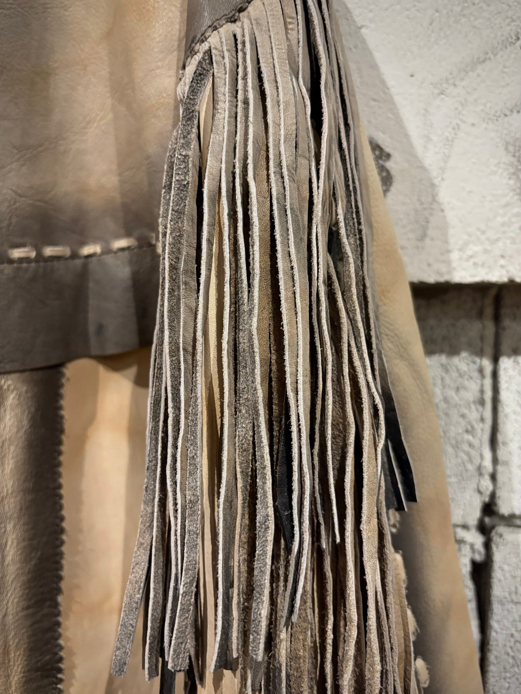 ヨークやポケットにパキッとしたカラーリングのネイティブ柄、さらにはフリンジの装飾、フロントはコンチョボタンが施されており、テーラードの要素、ウエスタンの要素が素晴らしいデザインバランスで落とし込まれています。