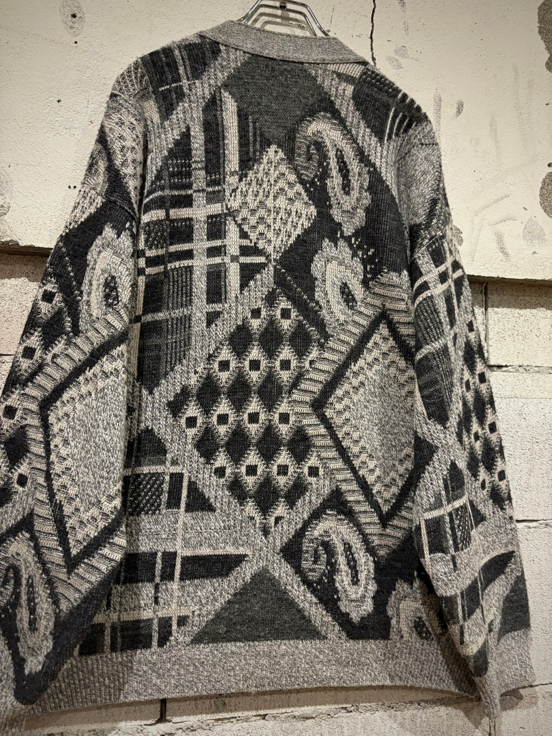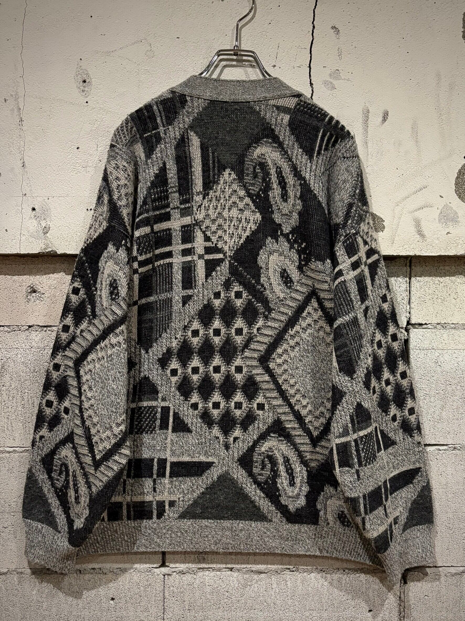 グレーのボディをベースに、モノトーンでペイズリーやダイヤ、チェックなど様々な柄模様を巧みに切り替えながら施したカーディガン。