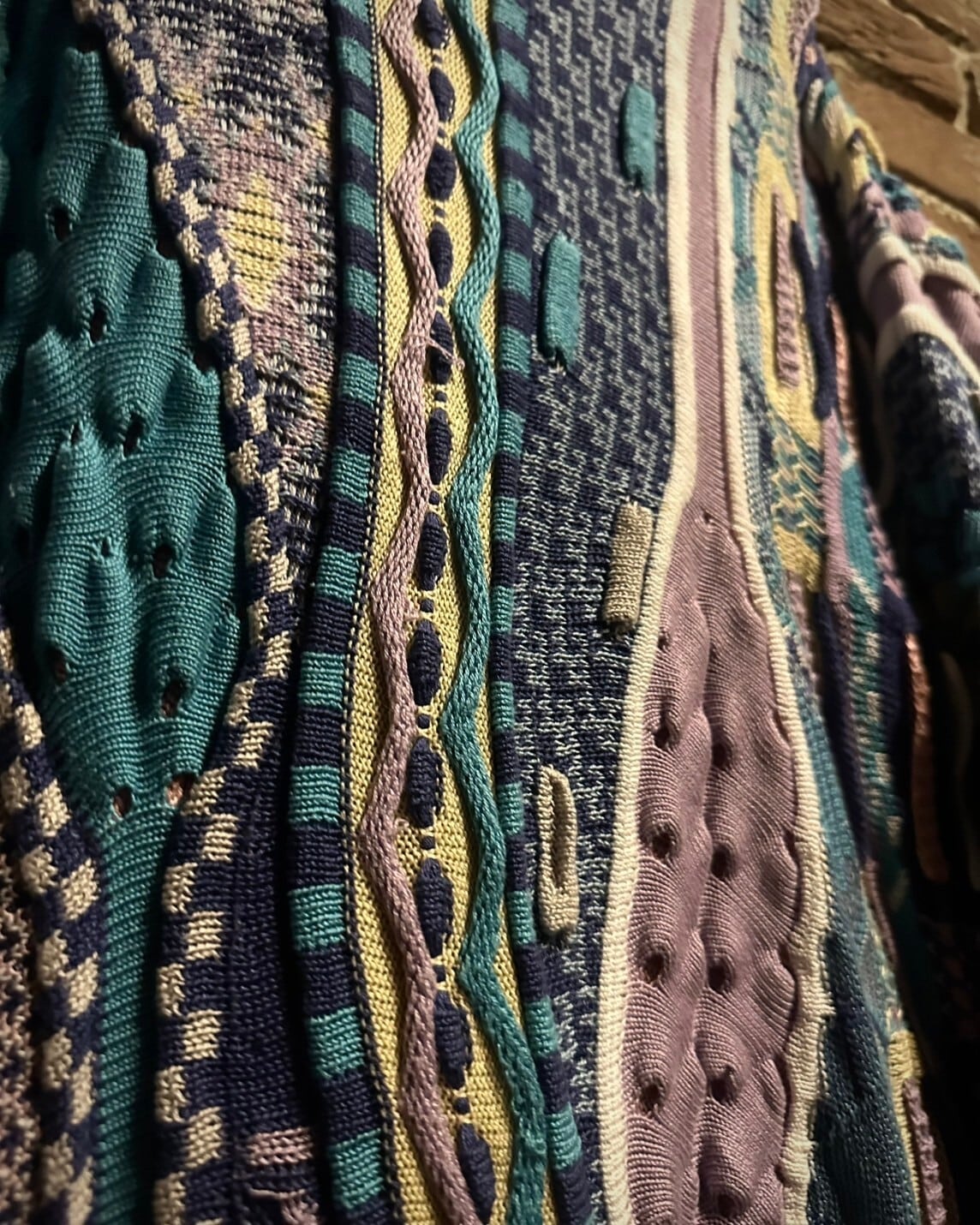 こちらは稀有なパープル×ブルー×ネイビー等の寒色をベースとしたカラーリング。3Dニットならではのデザイン性を持ちながら纏りのある、汎用性にも非常に優れた1着となっています。