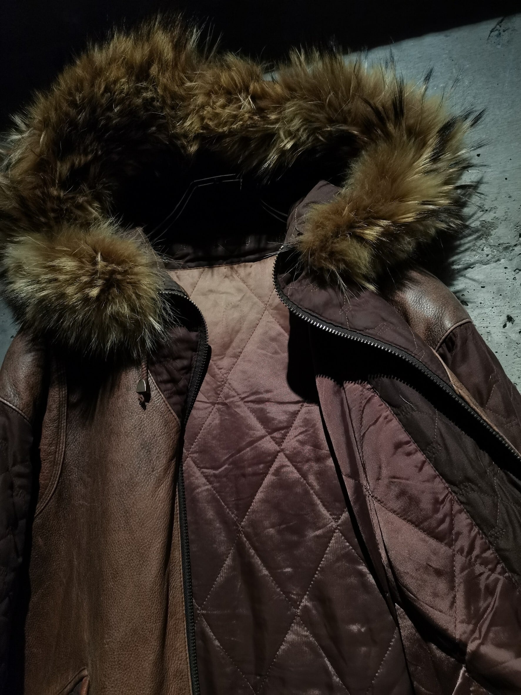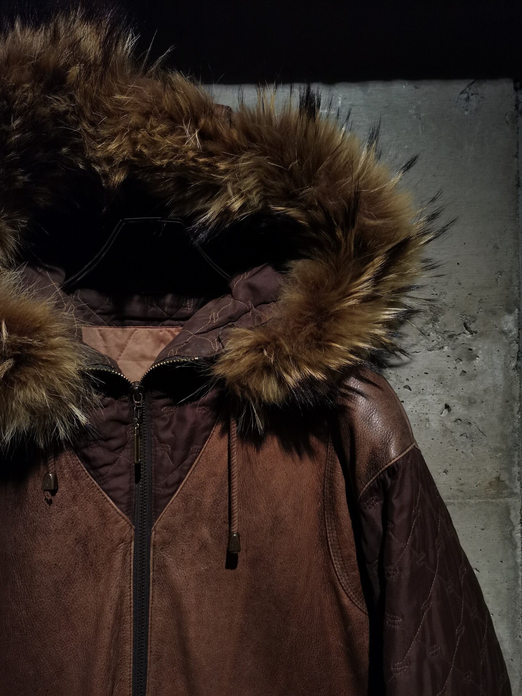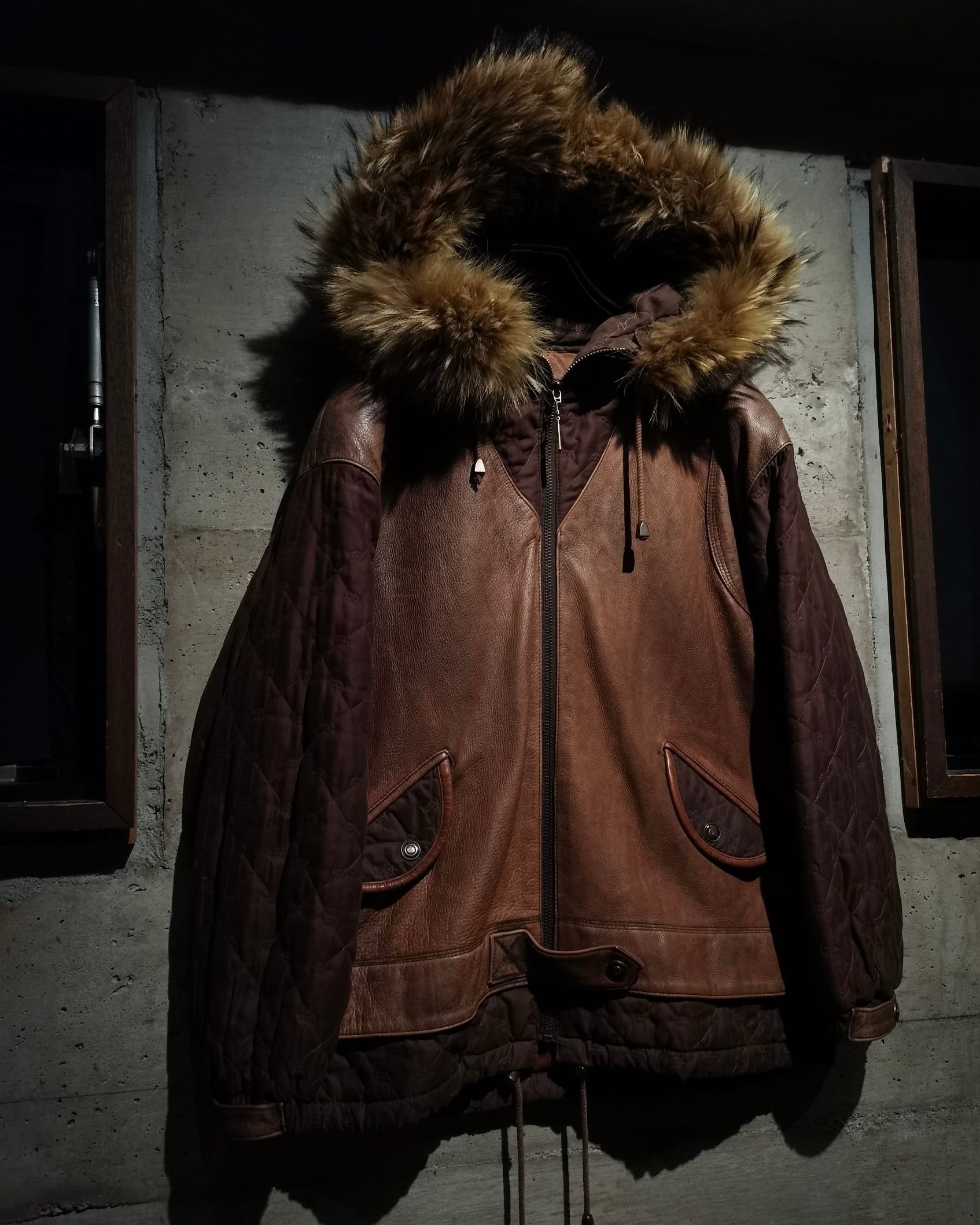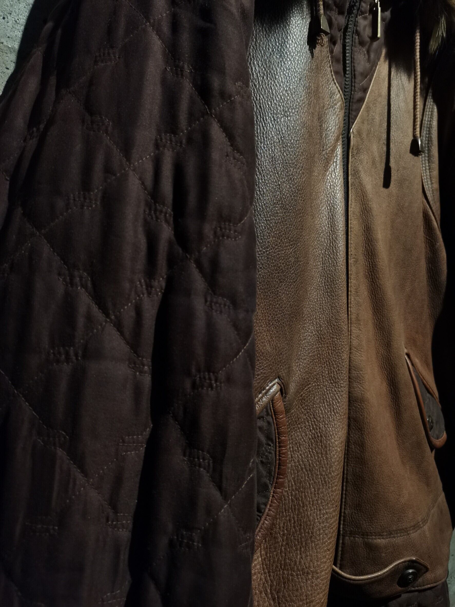 モノグラム調のステッチデザインによるキルティングが施されたボディをベースに、極上のブラウンレザーを用いて、ベストをレイヤードさせたようなデザインでの切り替えを施した稀有な1着。
