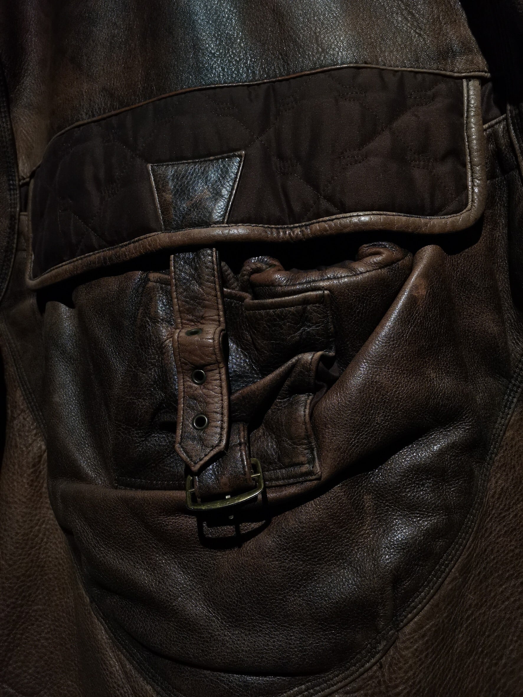 背面にはハンティングベストを彷彿とさせる大盤なポケットを配置。機能面はもちろんのこと、デザインとしても活きておりレザージャケットの中でもかなり凝ったアプローチにグッときます。