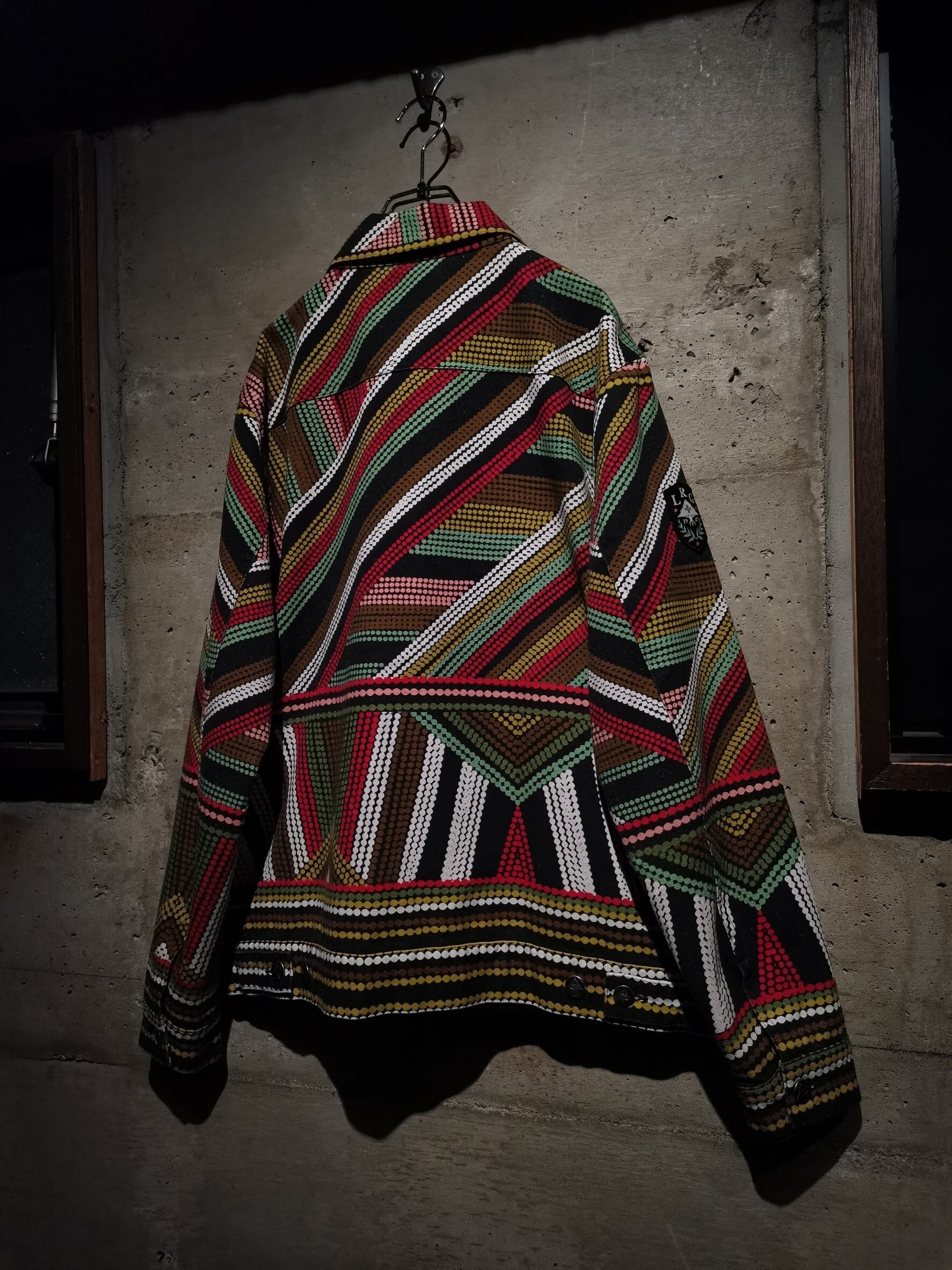 カラフルなドットでバイアス状にボディ全面に載せたジップアップジャケット。