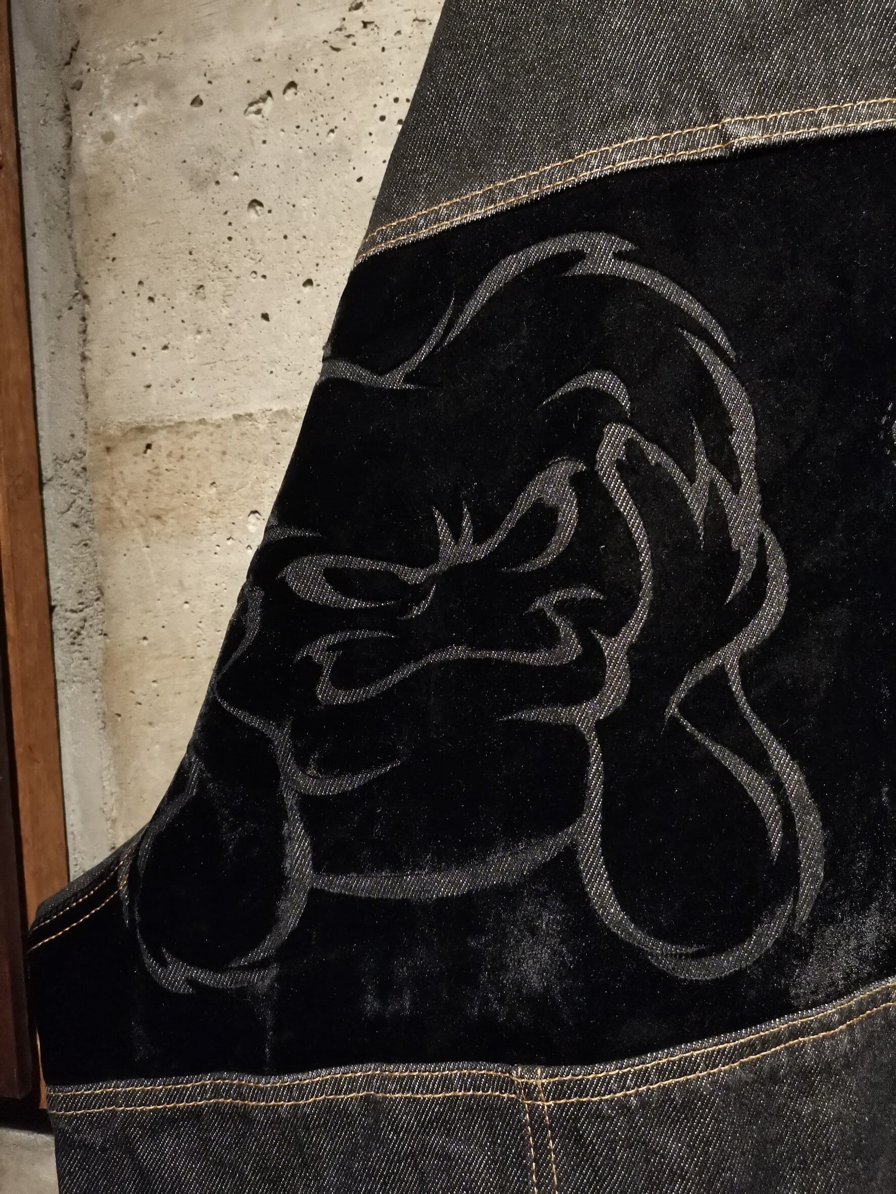 アメリカのワーナー・ブラザースが製作するアニメシリーズ"LOONEY TUNES"に登場するキャラクターを、ベロア調のフロッキープリントによって載せたデニムジャケット。