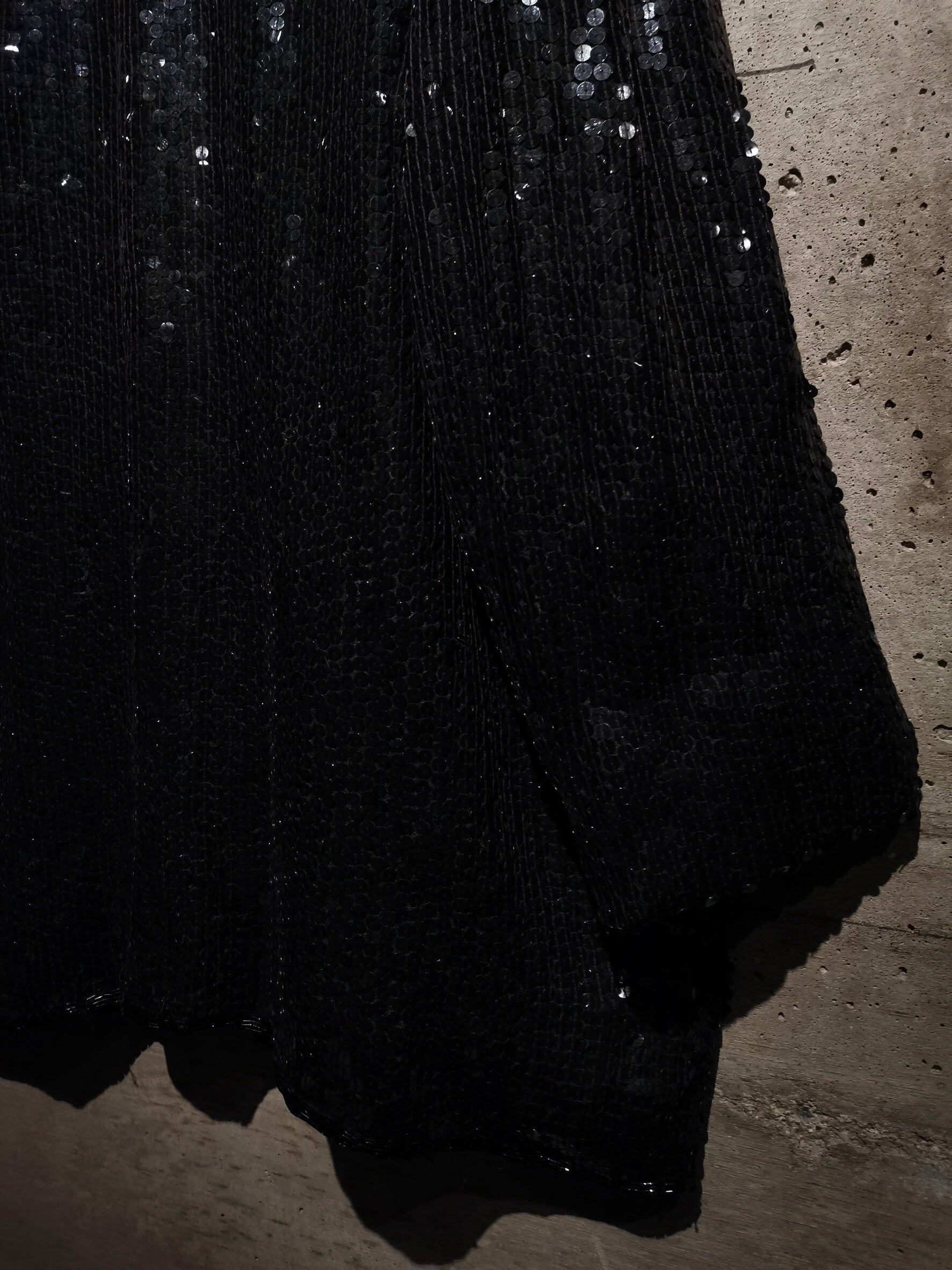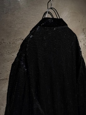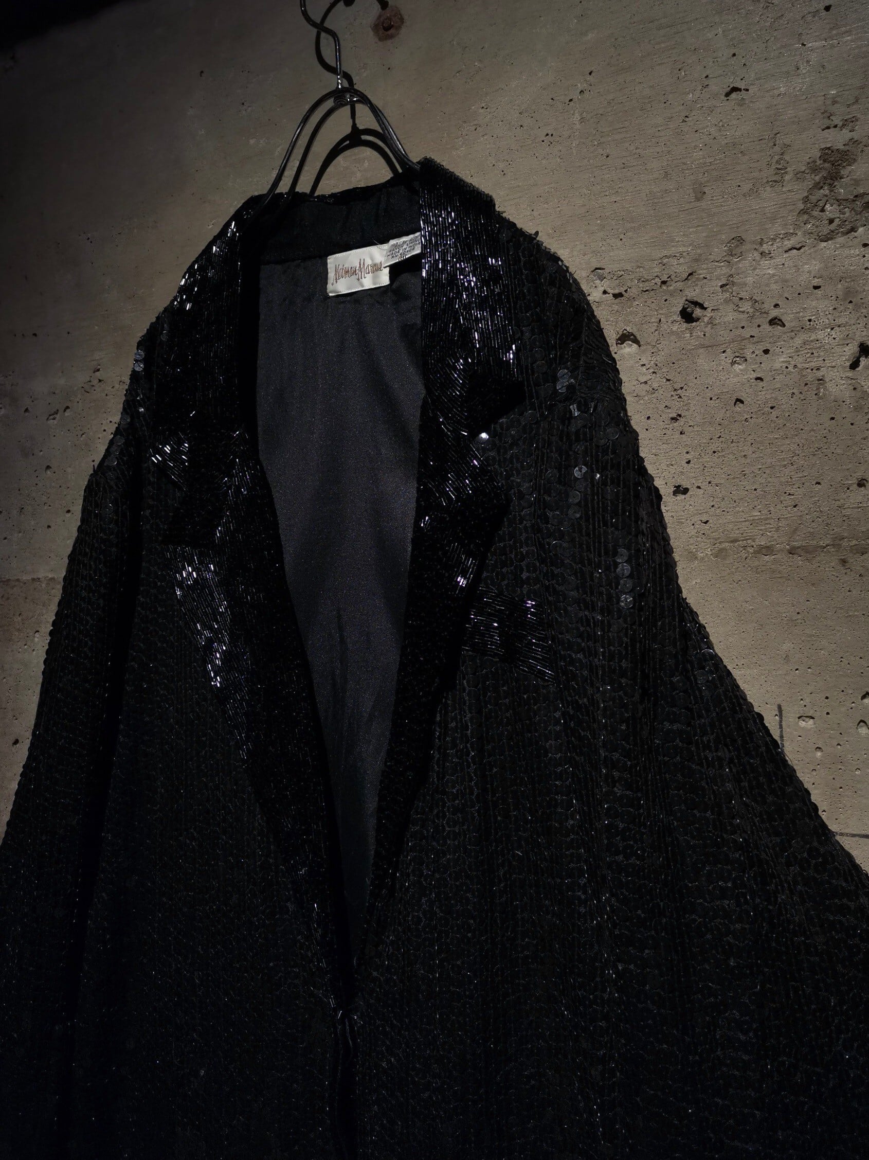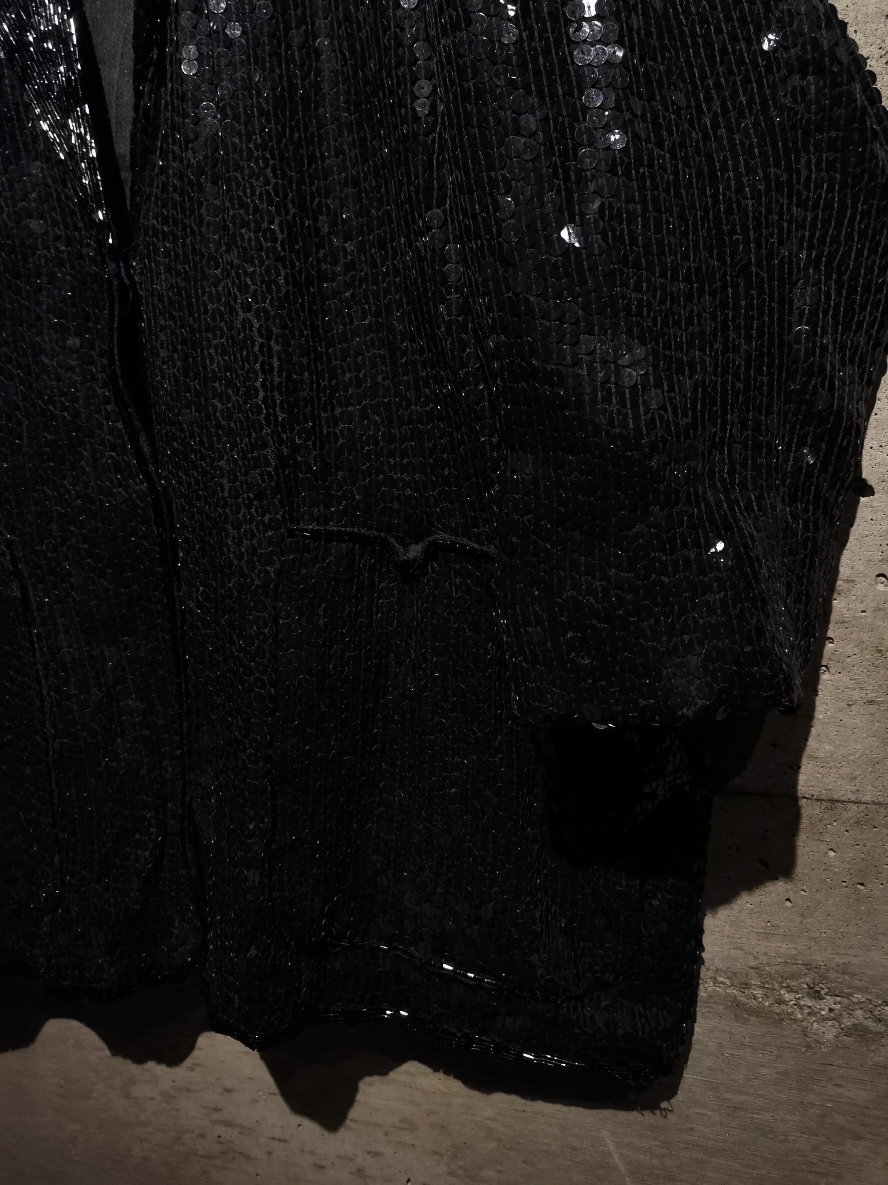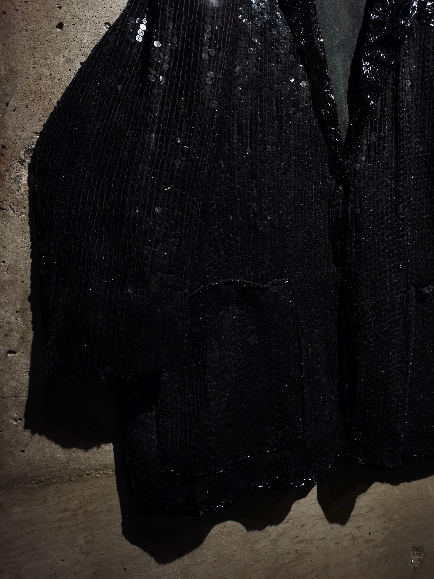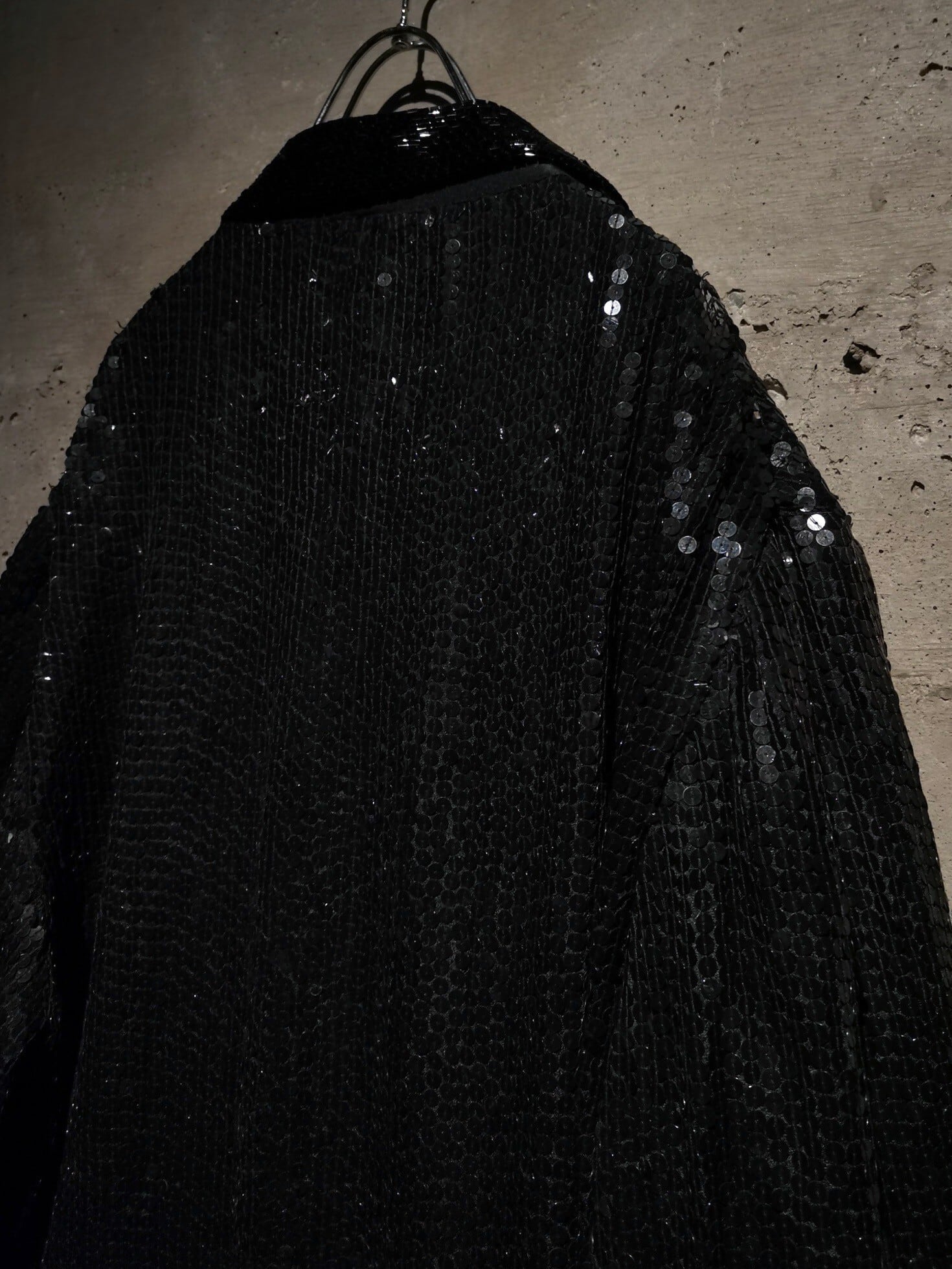 艶やかな光沢を放つ上質なブラックのピュアシルクを用いたボディに、みっちりとブラックのスパンコールを敷き詰めたテーラードジャケット。