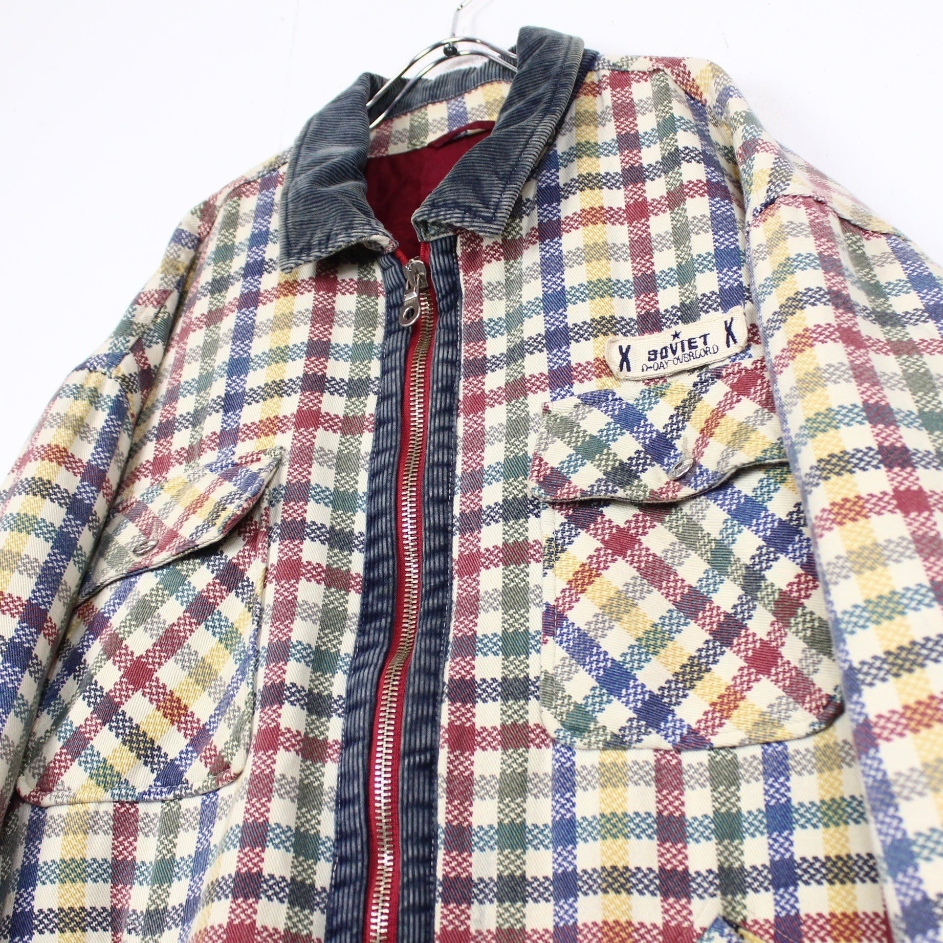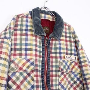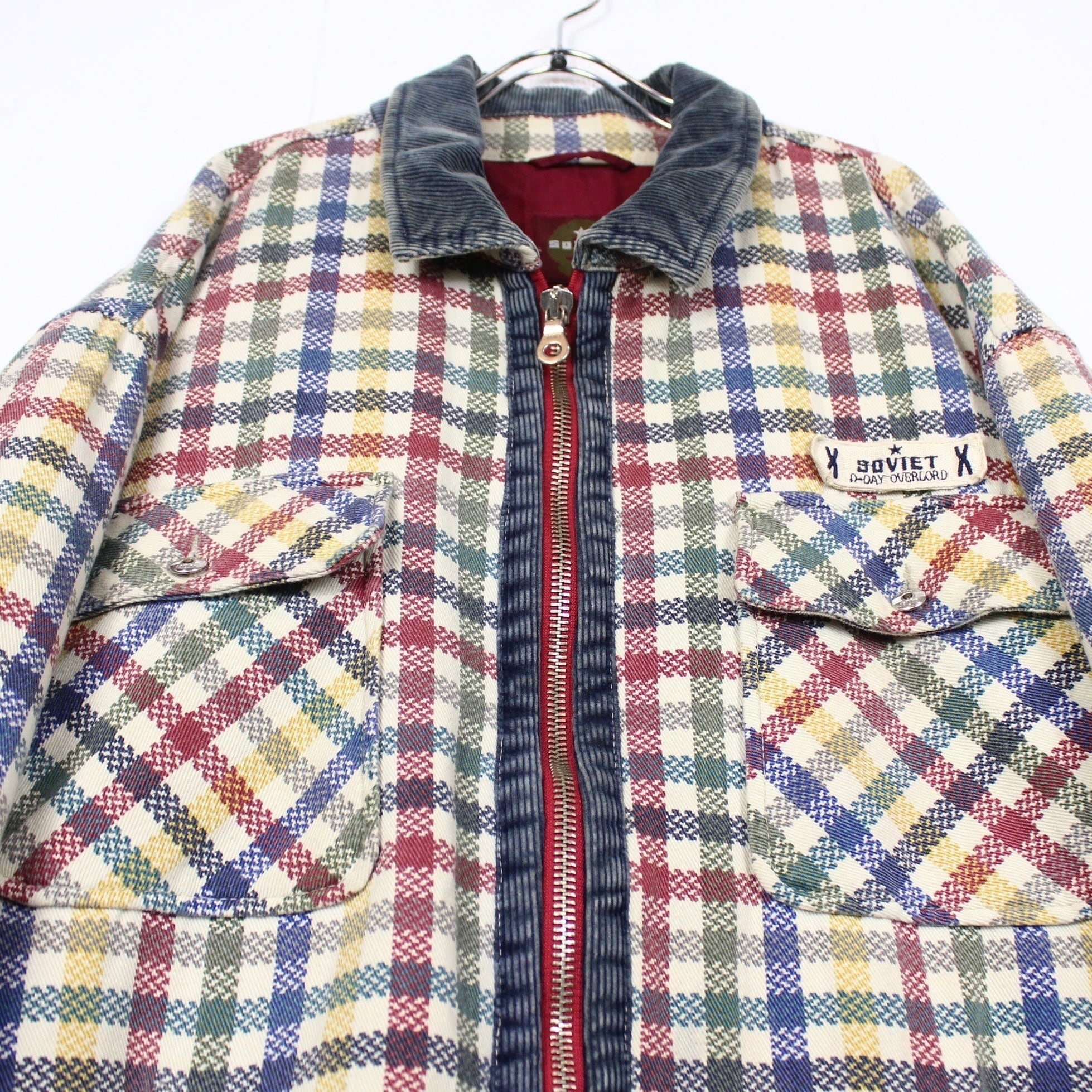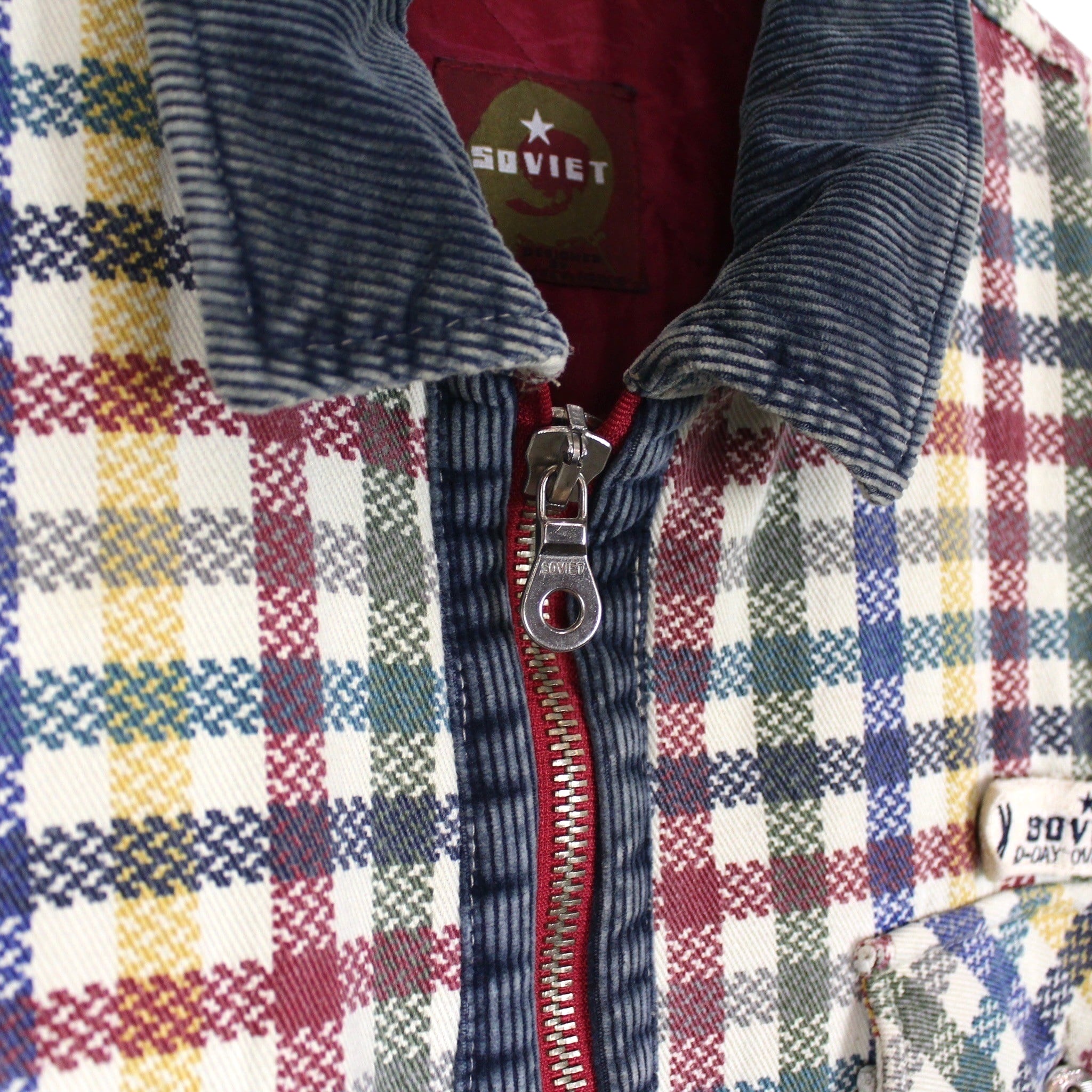 生成り色のボディをベースに、赤、黄、緑、青のカラーリングで全面にチェック柄を配したブルゾンジャケット。襟から前立てにかけてコーデュロイを切り替える事で生まれる異素材のコントラストが良いアクセントになっています。
